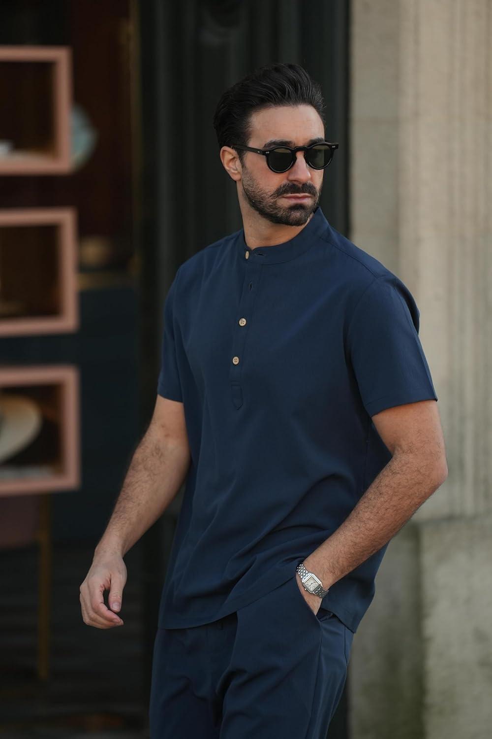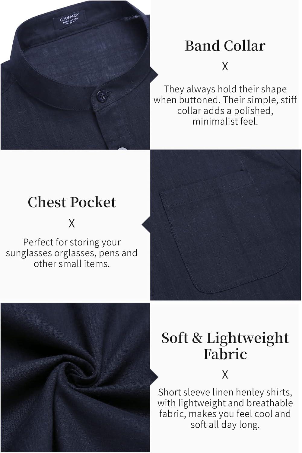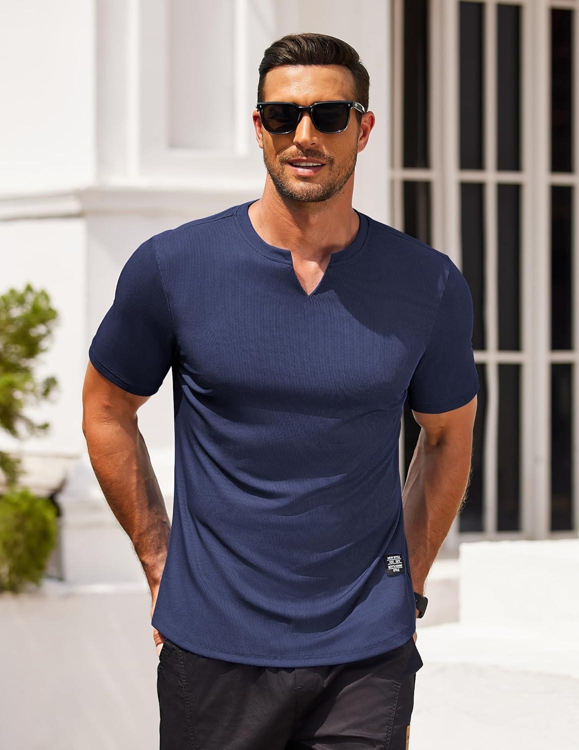 COOFANDY Men Casual Henley Tee Shirt Short Sleeve Band Collar Summer Beach Textured T-Shirt(Navy Blue)