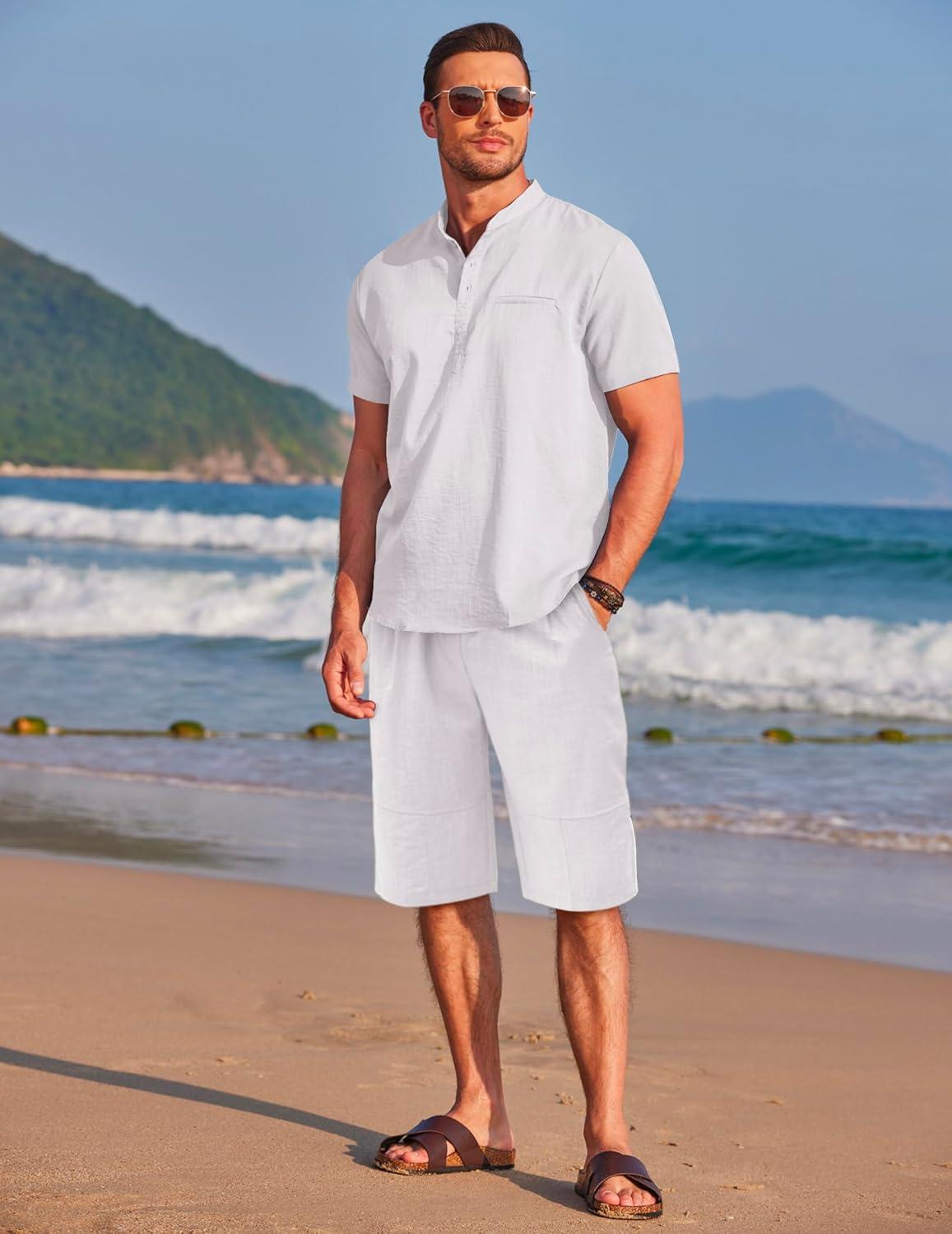 COOFANDY Men’s 2 Piece Cotton Linen Sets Summer Beach Outfits Casual Short Sleeve Henley Shirts and Vacation Shorts(White)