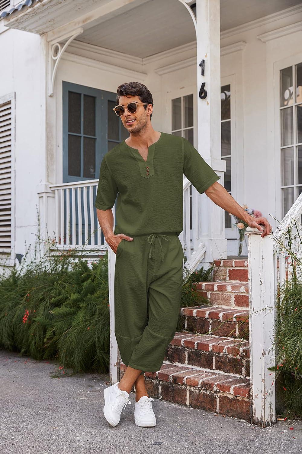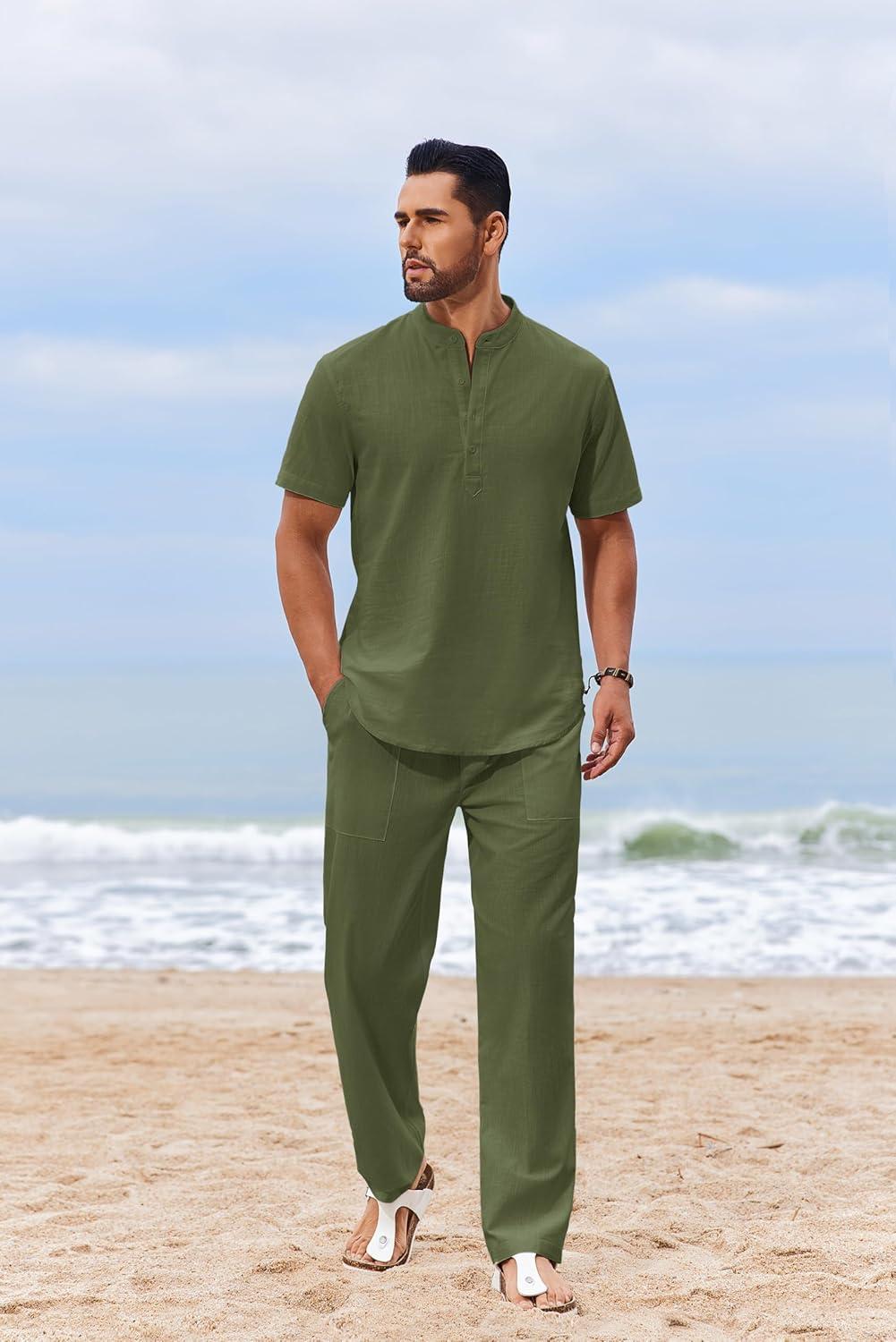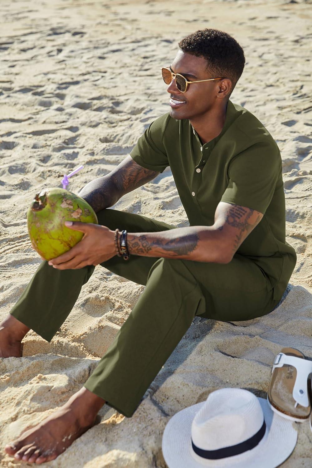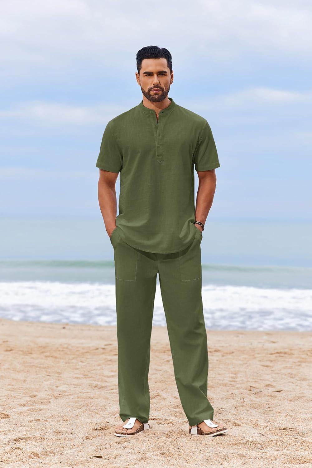 COOFANDY Men’s 2 Piece Cotton Sets Casual Short Sleeve Henley Shirts and Beach Pants with Pockets Summer Vacation Outfits(Army Green)