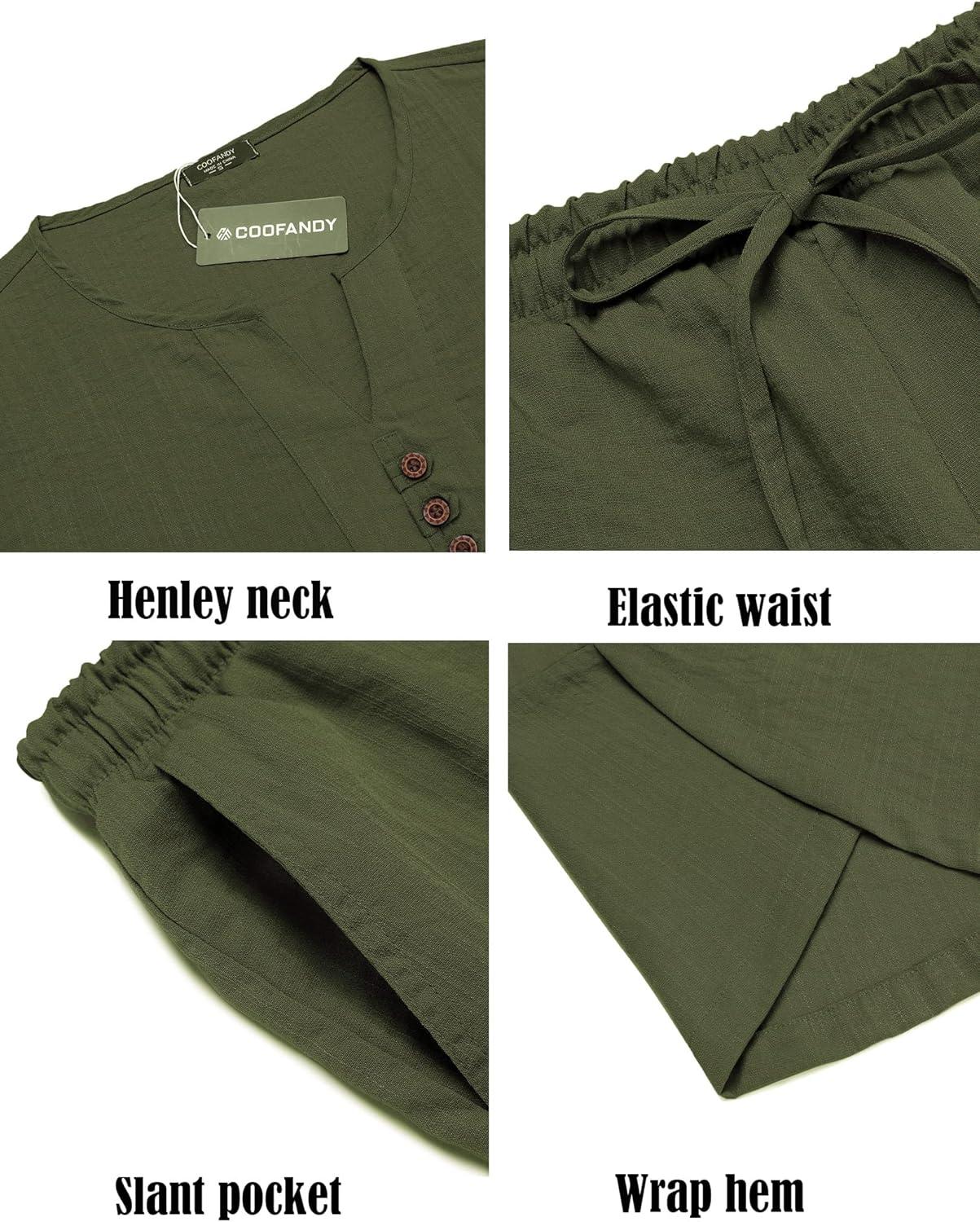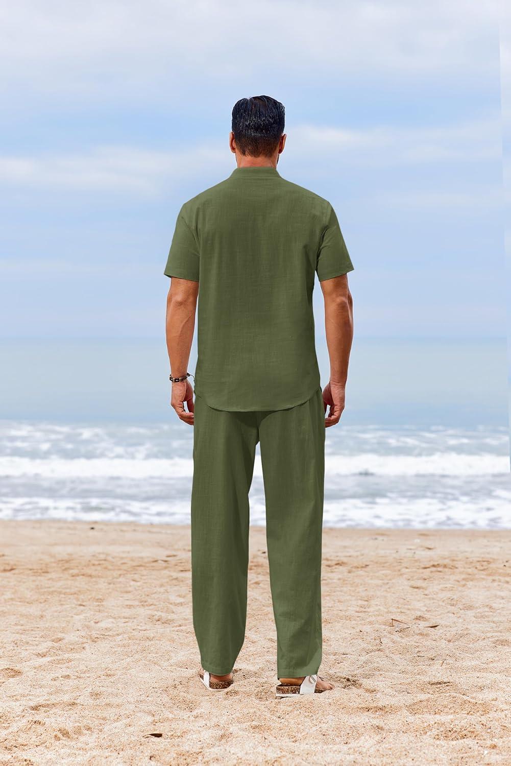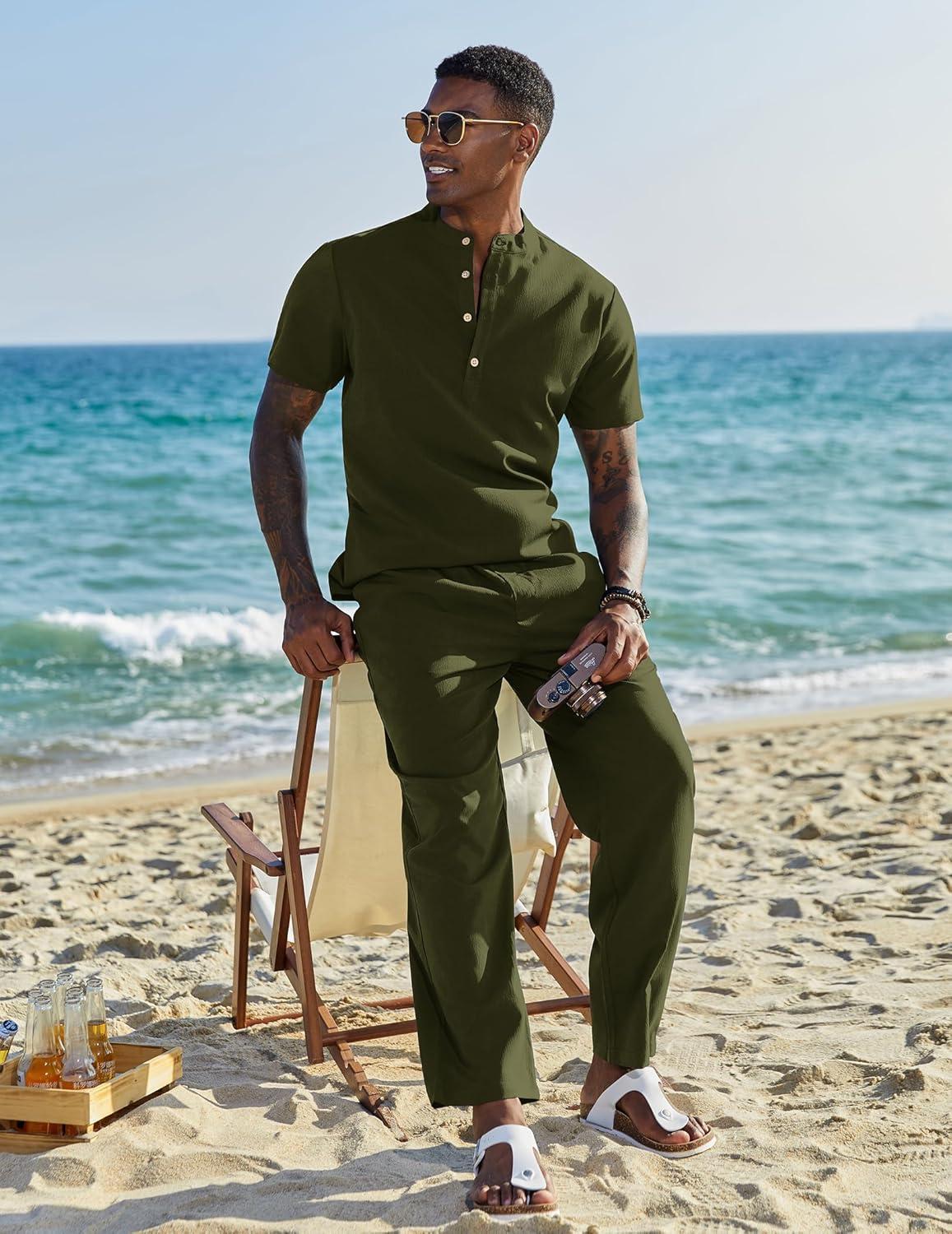 COOFANDY Men’s 2 Piece Cotton Sets Casual Short Sleeve Henley Shirts and Beach Pants with Pockets Summer Vacation Outfits(Army Green)