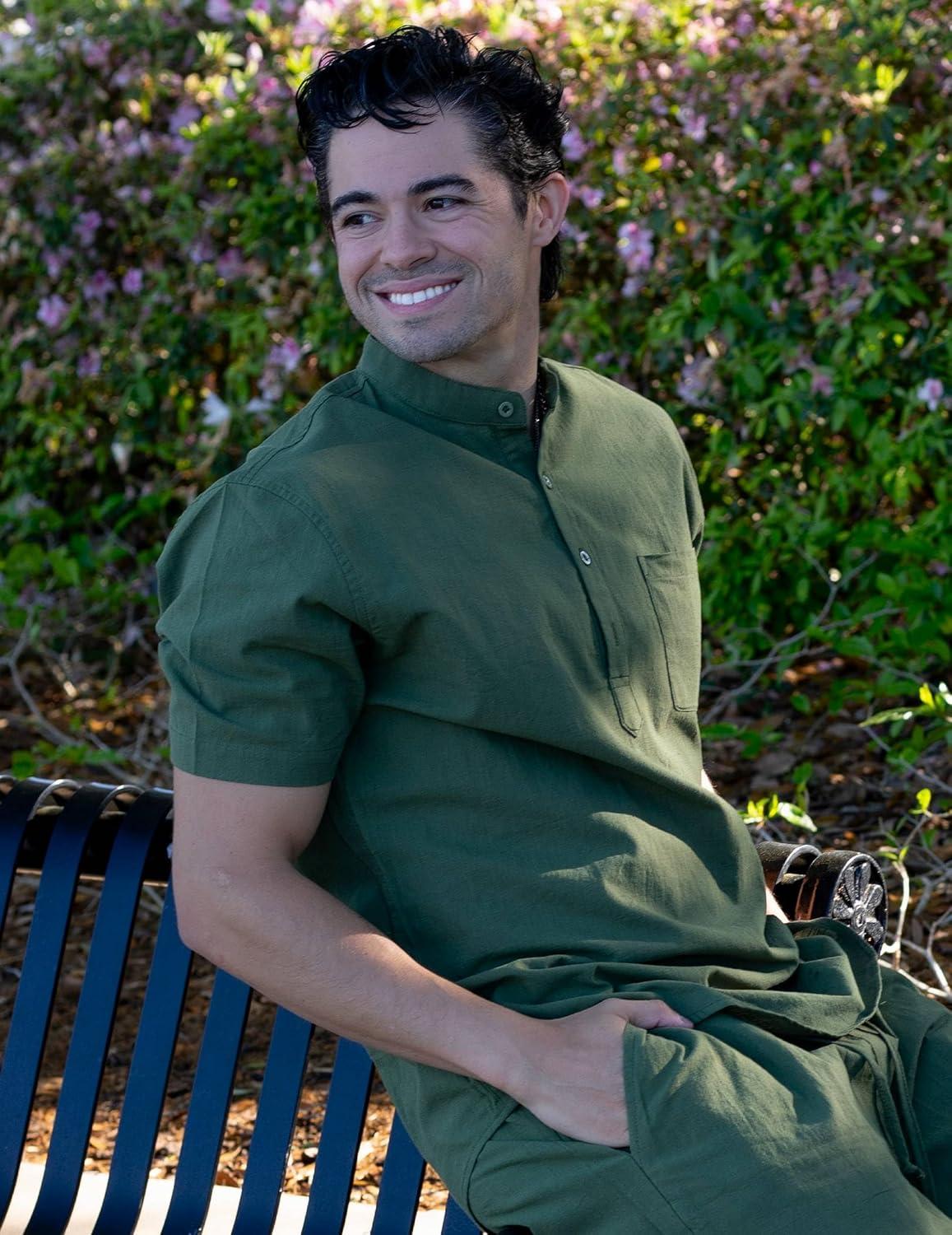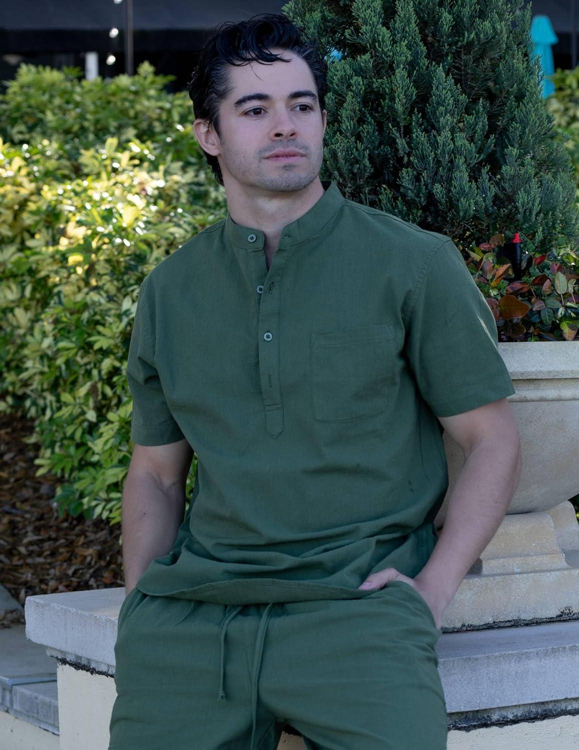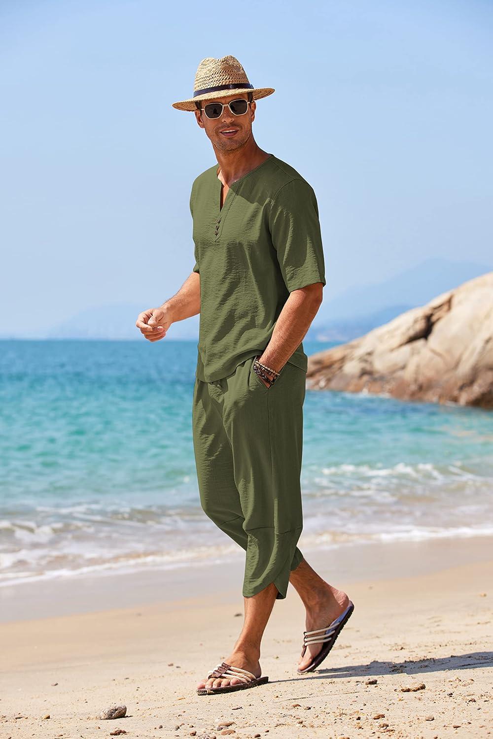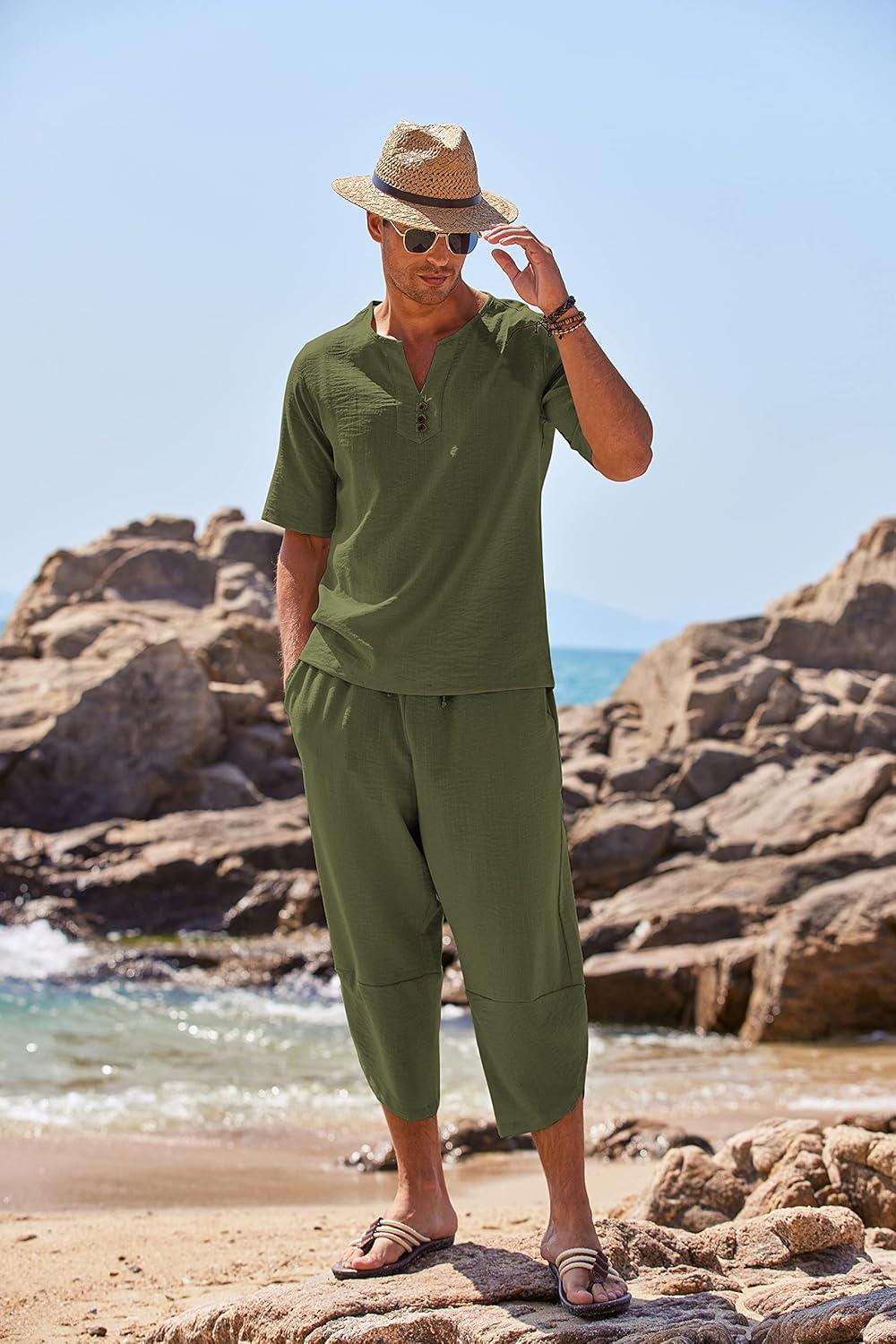 COOFANDY Men’s 2 Piece Cotton Sets Casual Short Sleeve Henley Shirts and Beach Pants with Pockets Summer Vacation Outfits(Army Green)