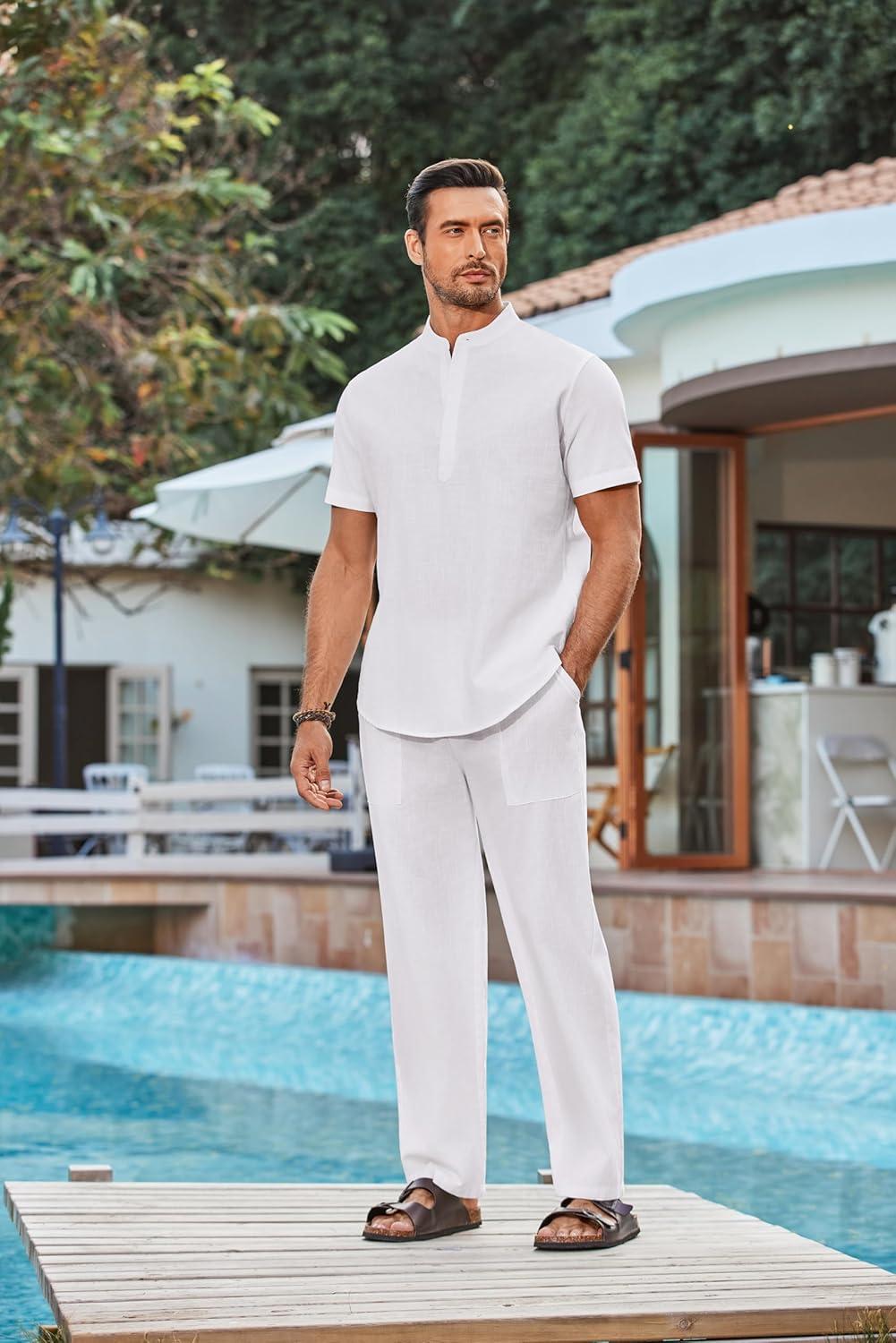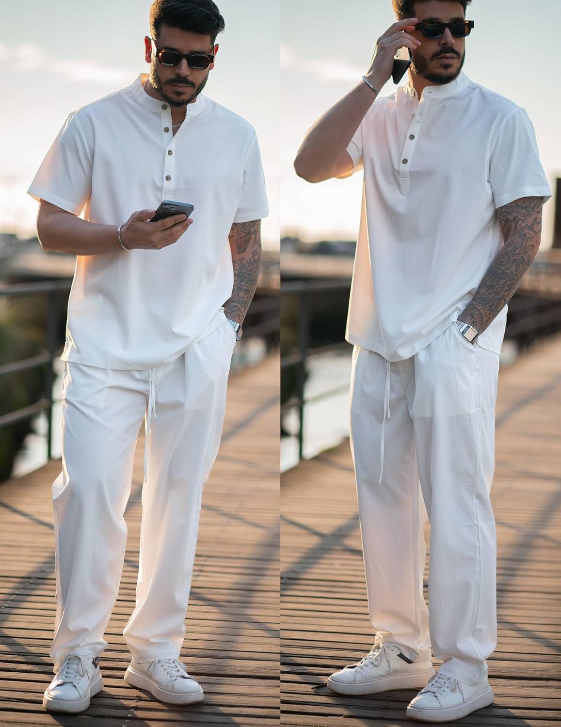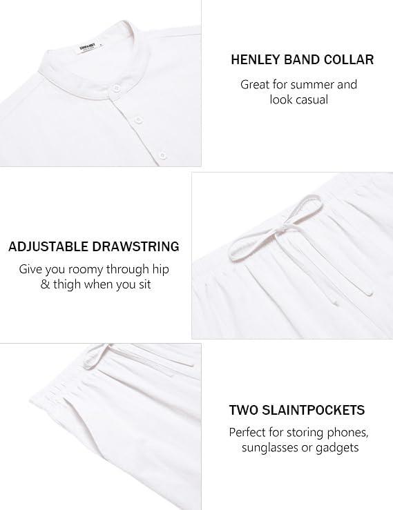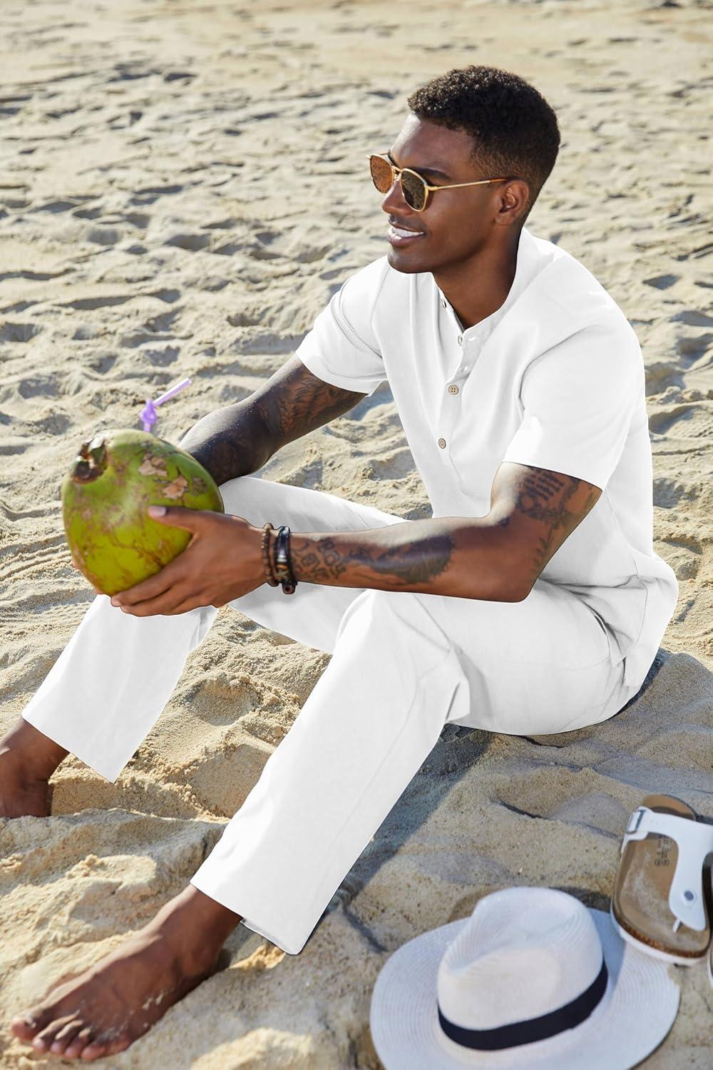 COOFANDY Men’s 2 Piece Cotton Sets Casual Short Sleeve Henley Shirts and Beach Pants with Pockets Summer Vacation Outfits(A-white)