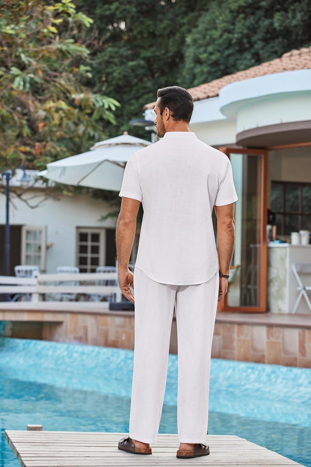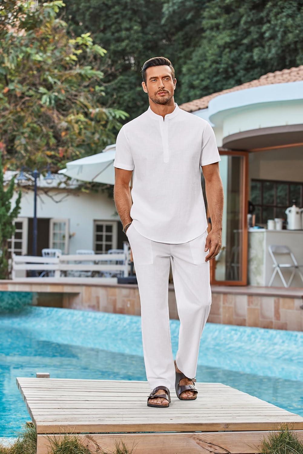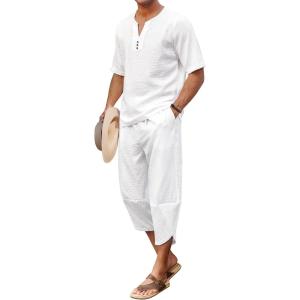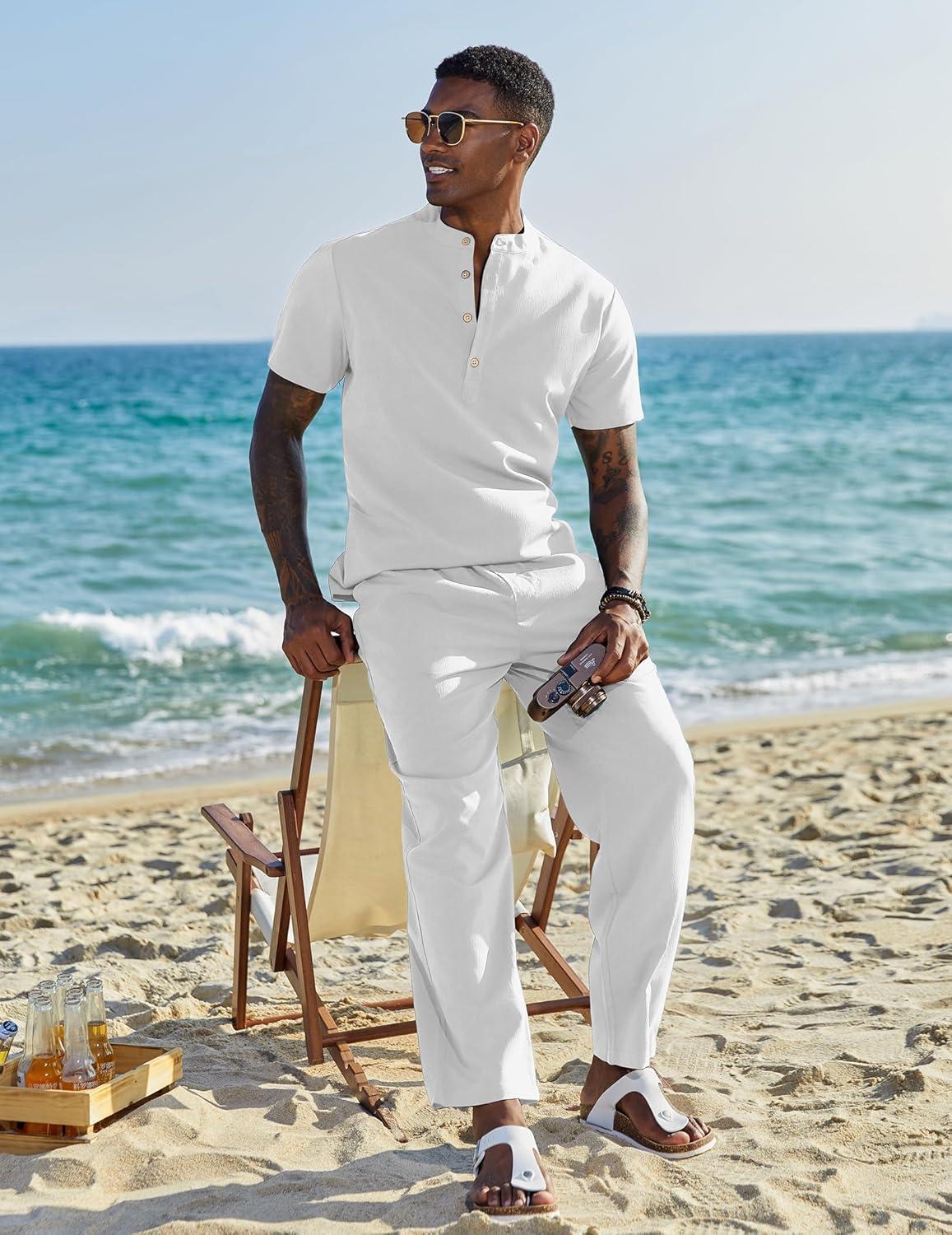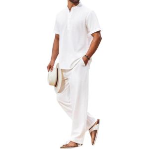 COOFANDY Men’s 2 Piece Cotton Sets Casual Short Sleeve Henley Shirts and Beach Pants with Pockets Summer Vacation Outfits(A-white)