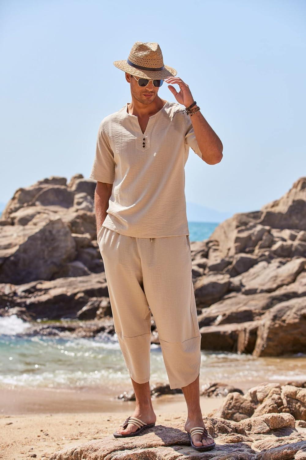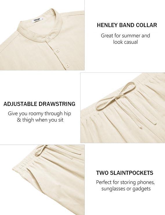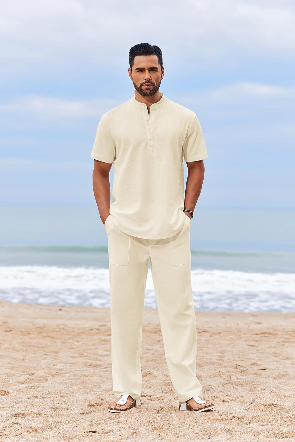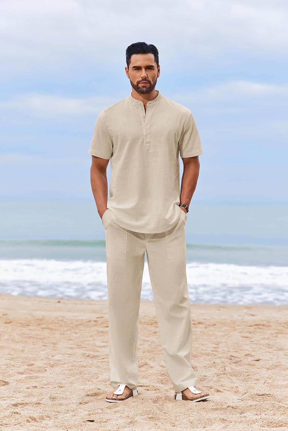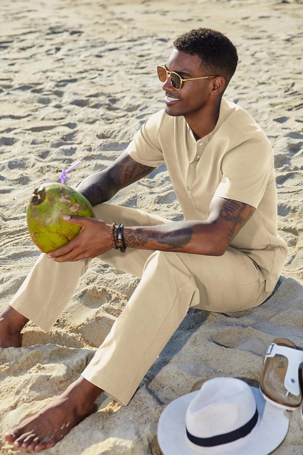 COOFANDY Men’s 2 Piece Cotton Sets Casual Short Sleeve Henley Shirts and Beach Pants with Pockets Summer Vacation Outfits(Beige)