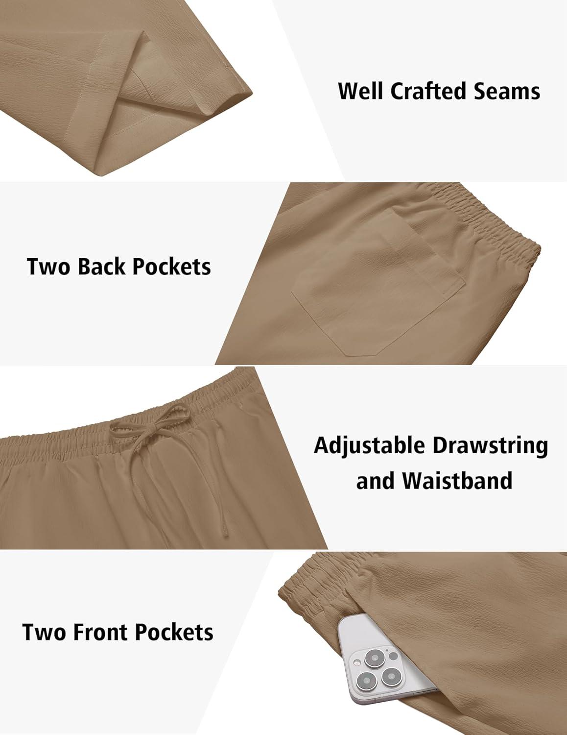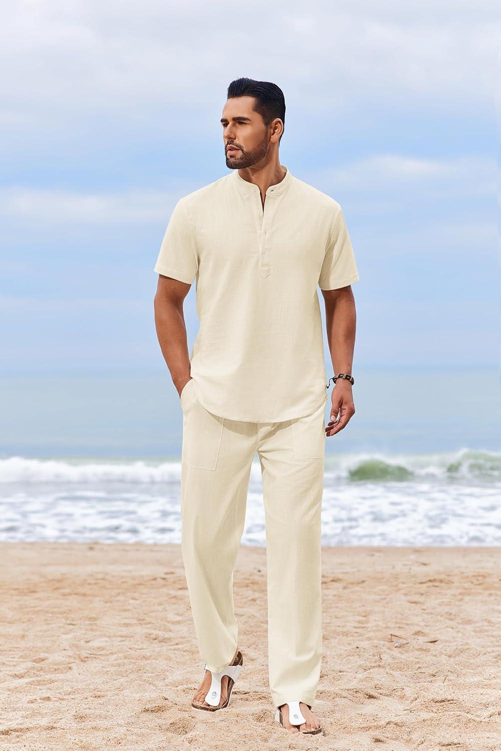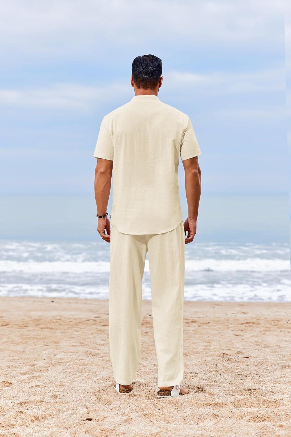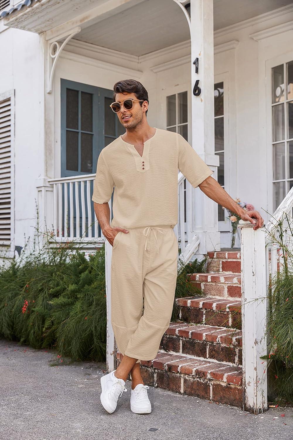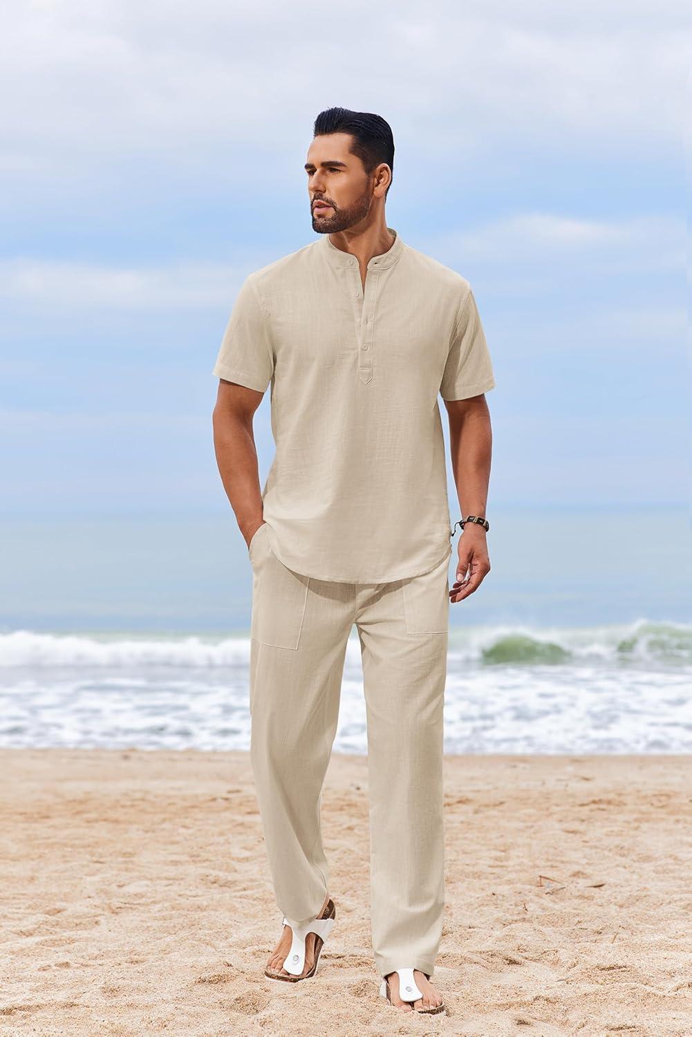 COOFANDY Men’s 2 Piece Cotton Sets Casual Short Sleeve Henley Shirts and Beach Pants with Pockets Summer Vacation Outfits(Beige)