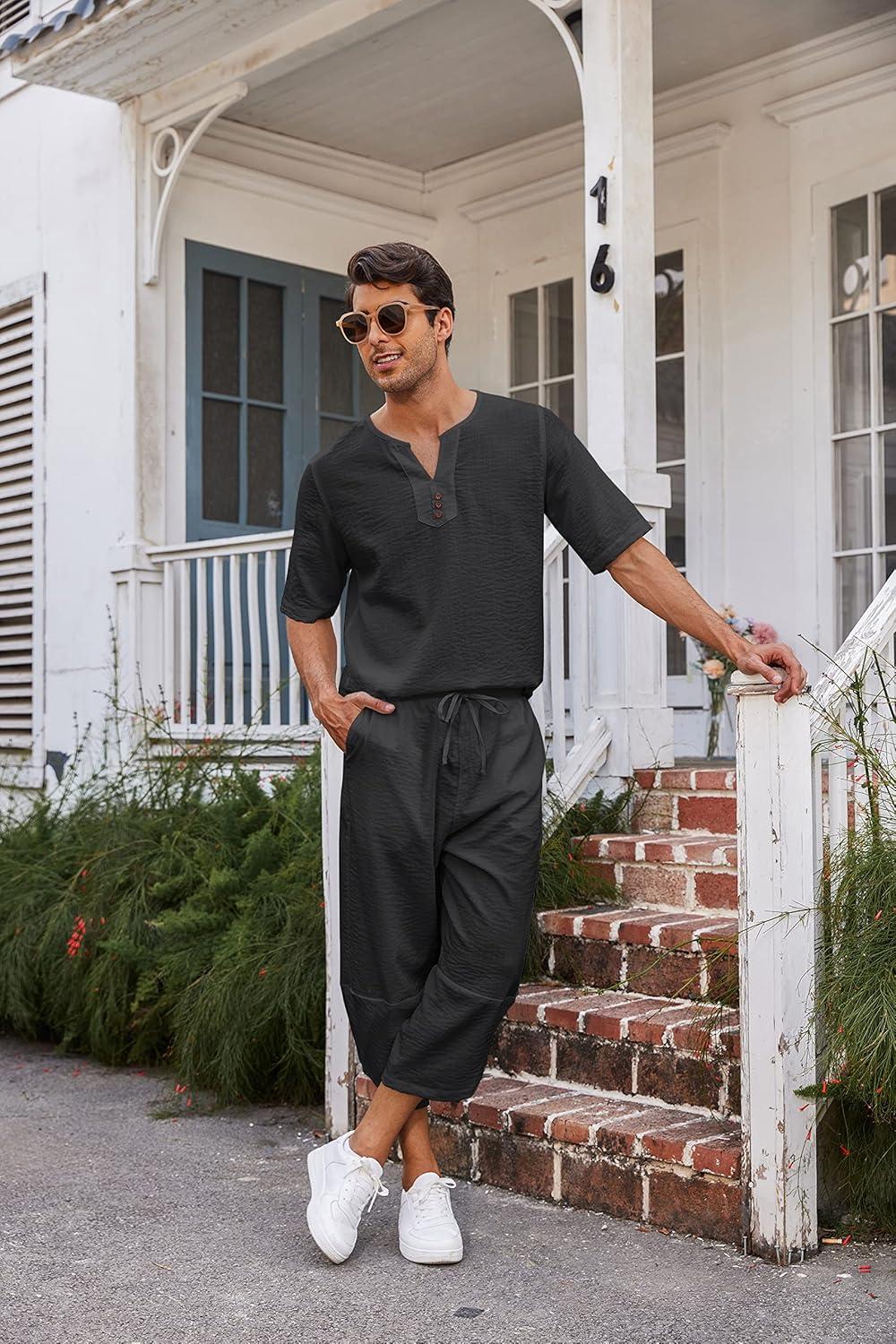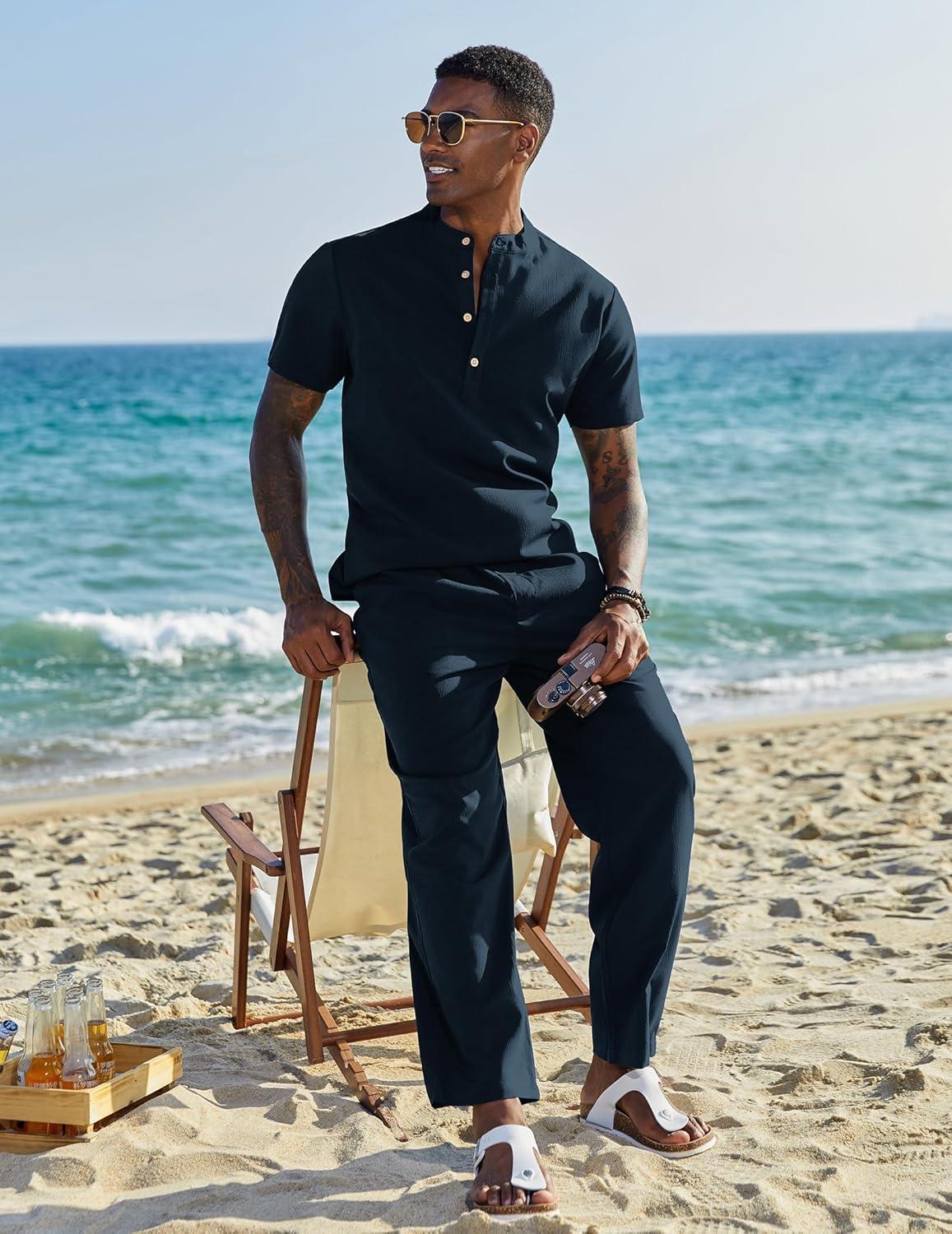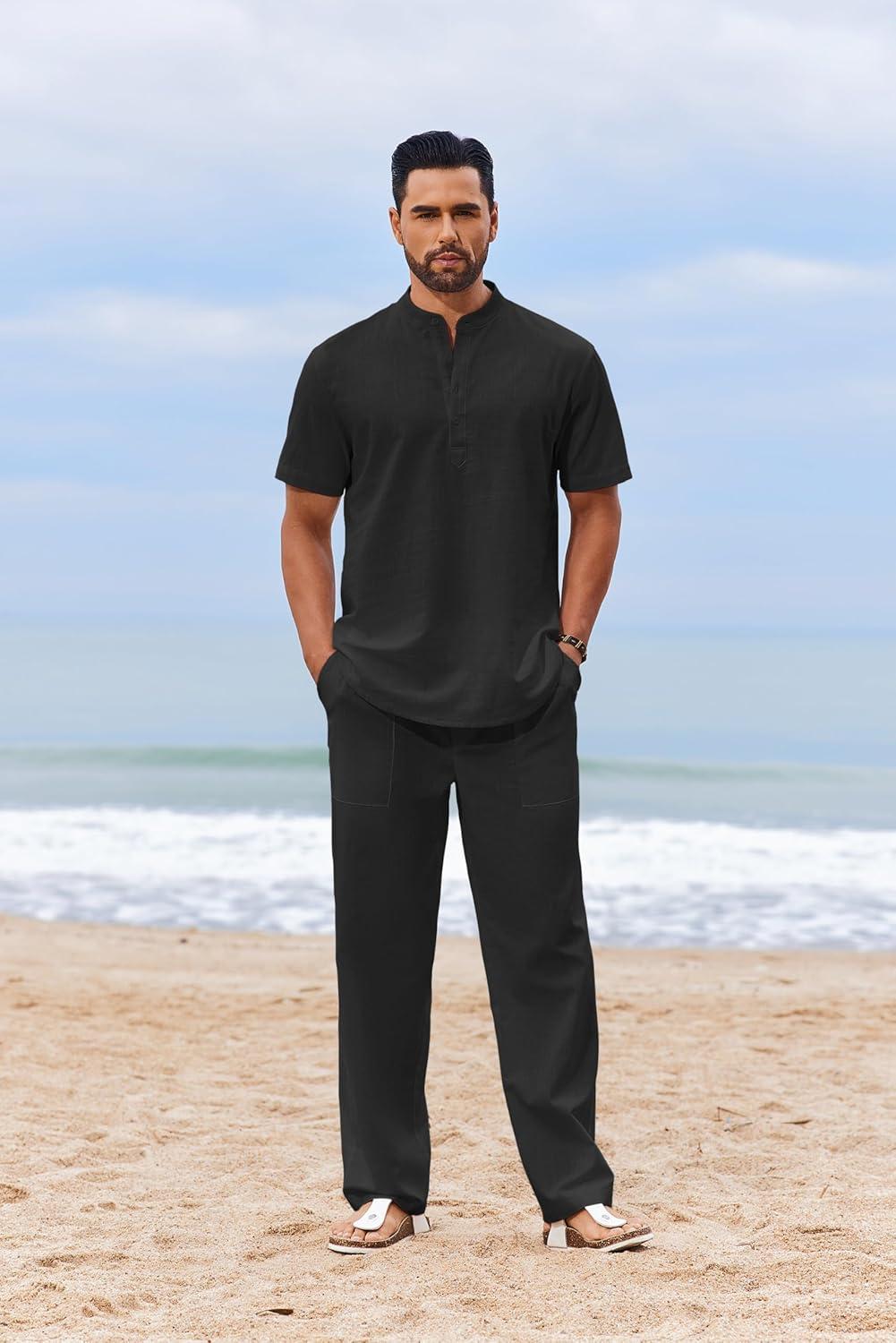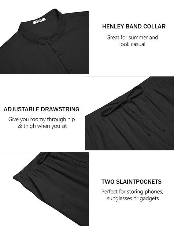 COOFANDY Men’s 2 Piece Cotton Sets Casual Short Sleeve Henley Shirts and Beach Pants with Pockets Summer Vacation Outfits(Black)