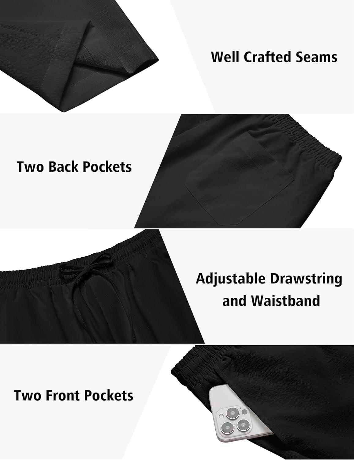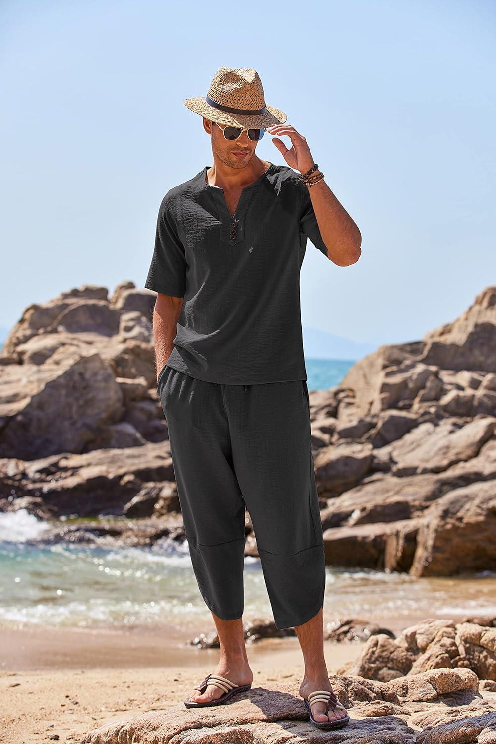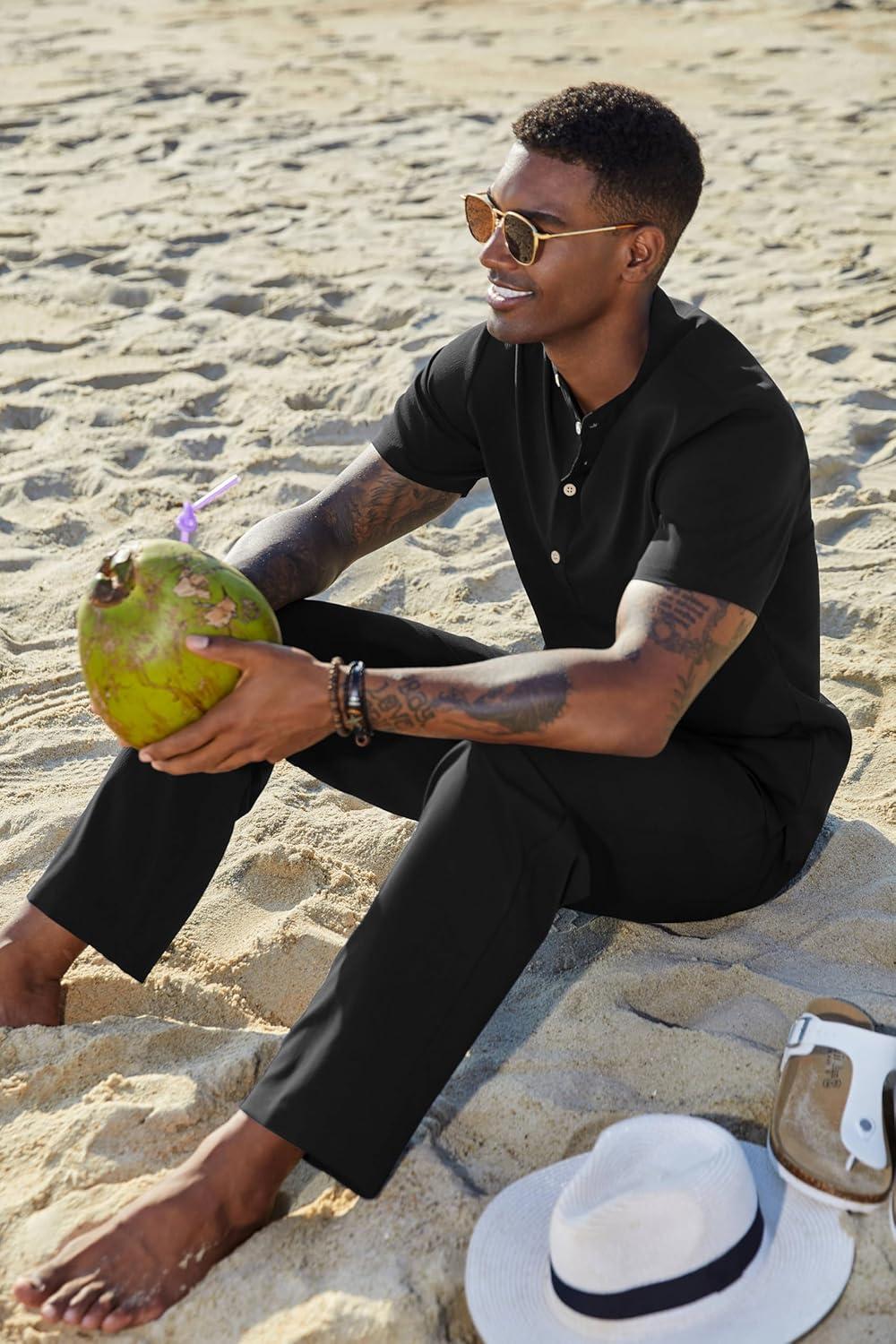 COOFANDY Men’s 2 Piece Cotton Sets Casual Short Sleeve Henley Shirts and Beach Pants with Pockets Summer Vacation Outfits(Black)