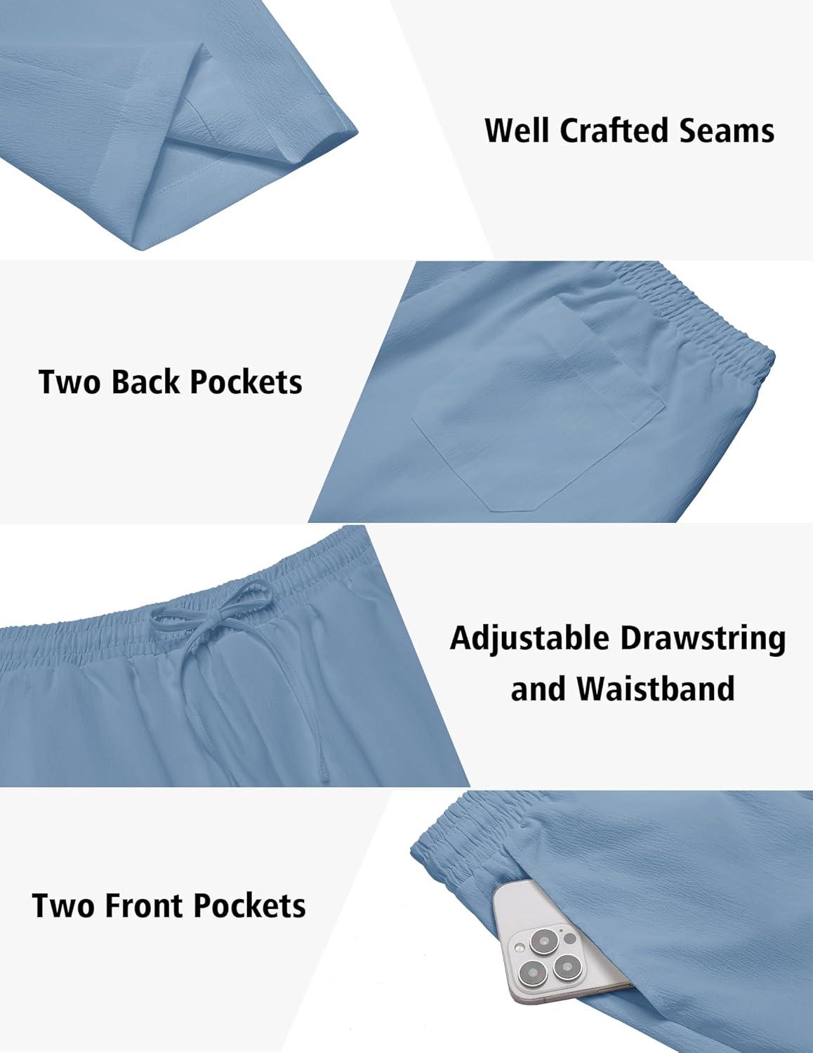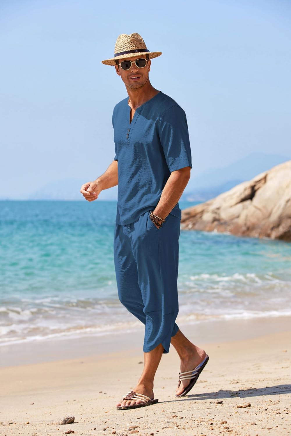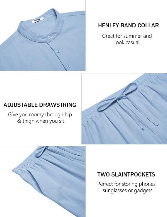 COOFANDY Men’s 2 Piece Cotton Sets Casual Short Sleeve Henley Shirts and Beach Pants with Pockets Summer Vacation Outfits(Blue)