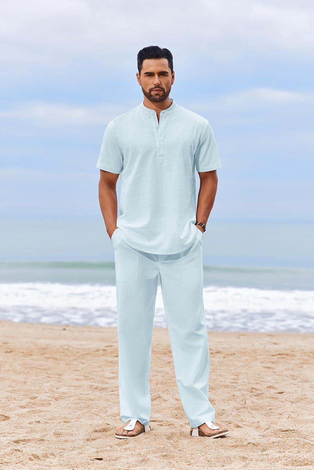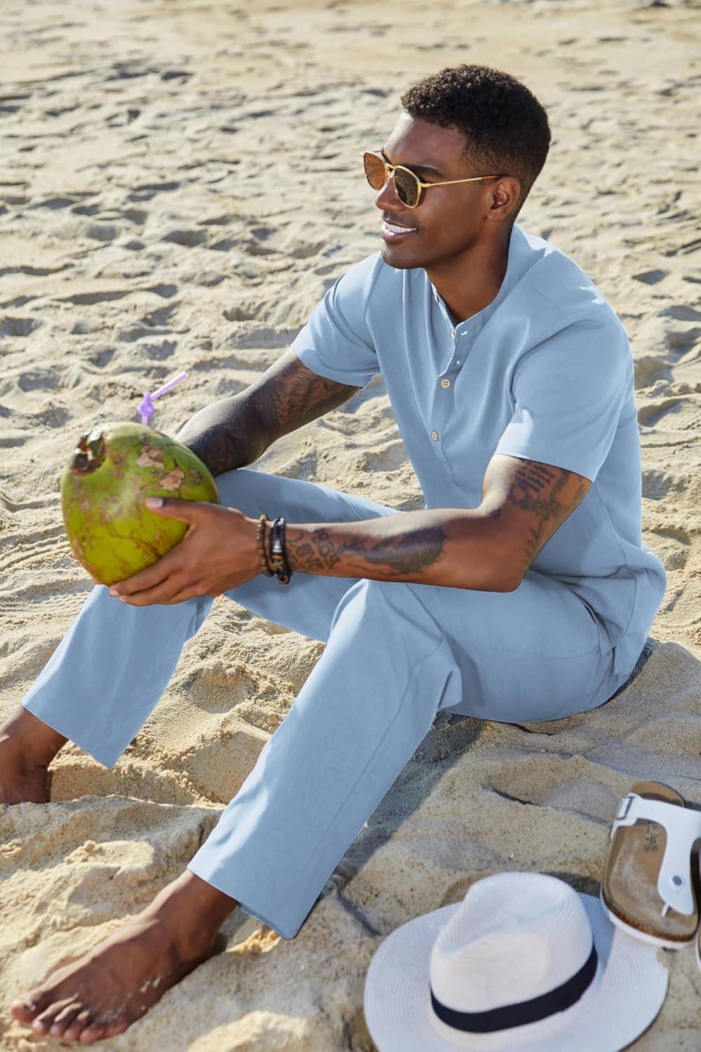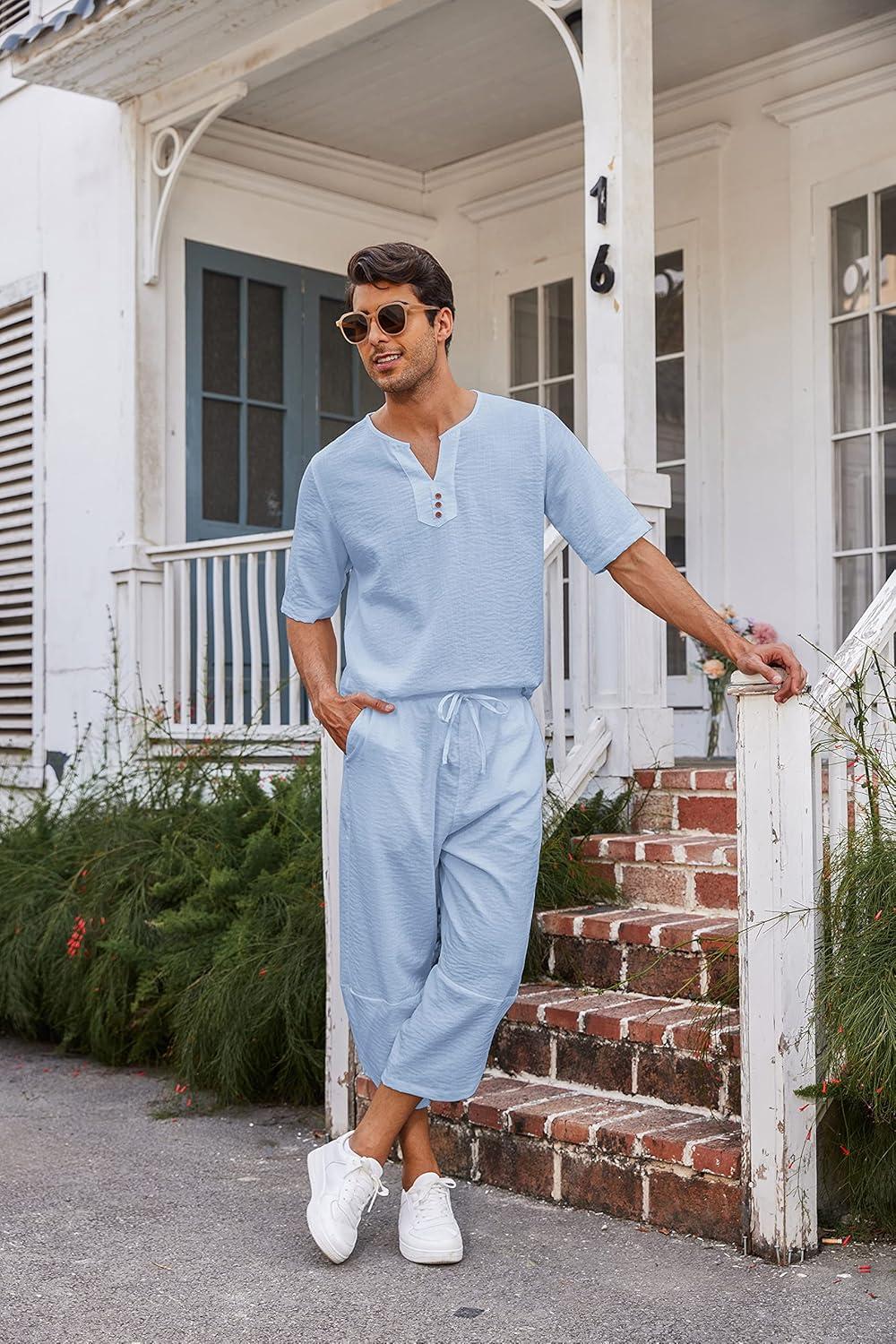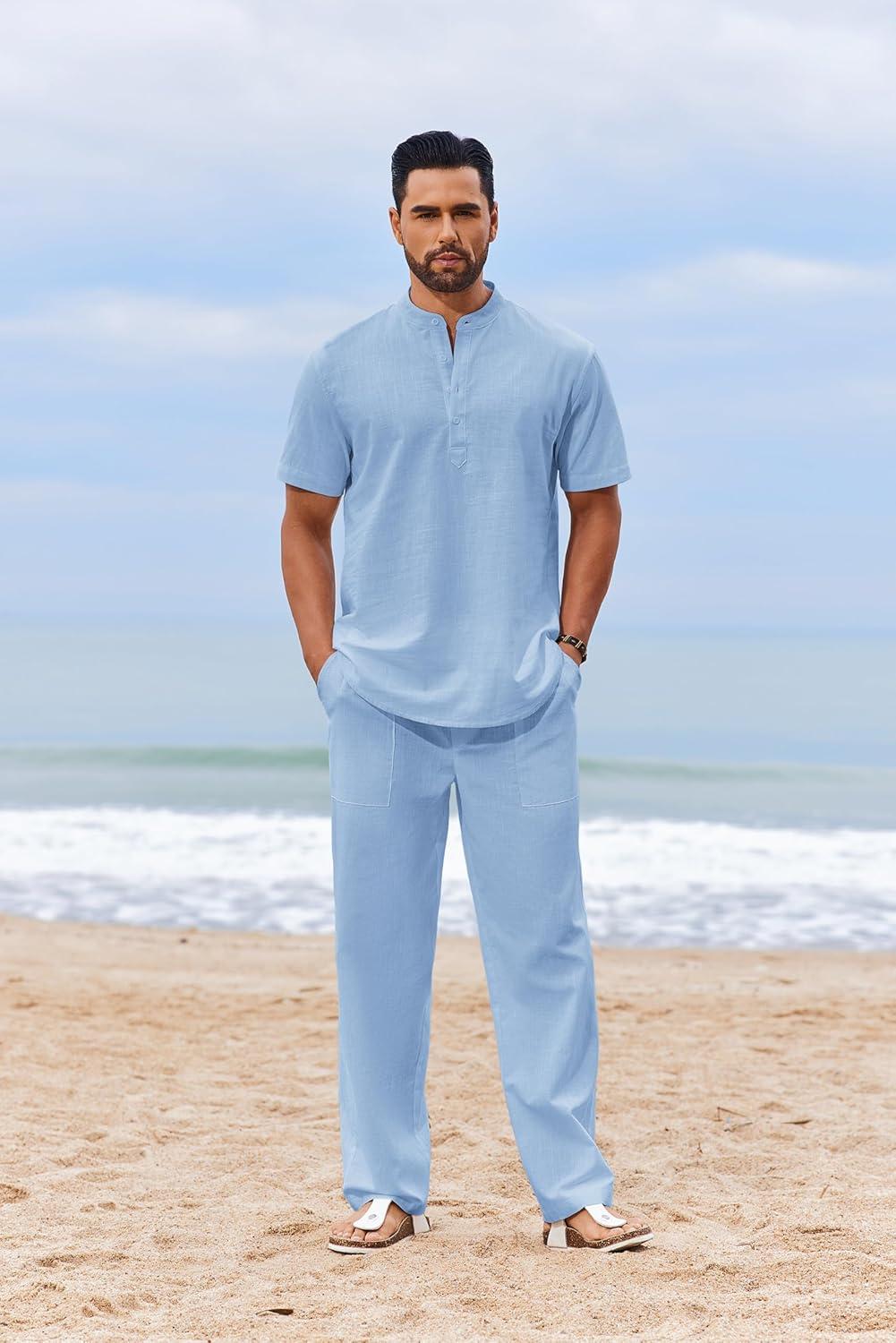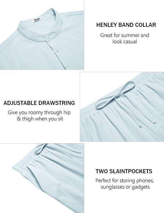 COOFANDY Men’s 2 Piece Cotton Sets Casual Short Sleeve Henley Shirts and Beach Pants with Pockets Summer Vacation Outfits(Light Blue)
