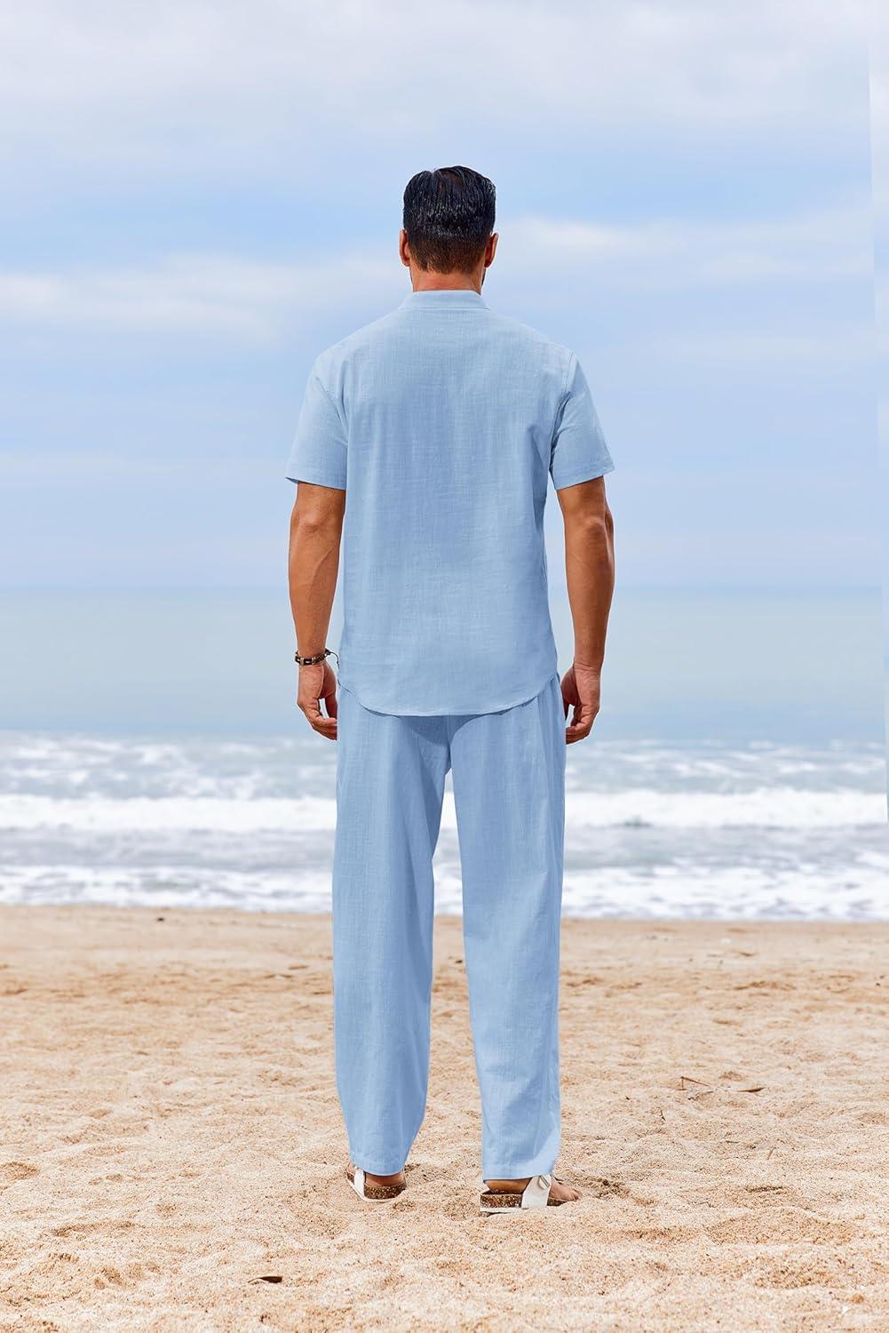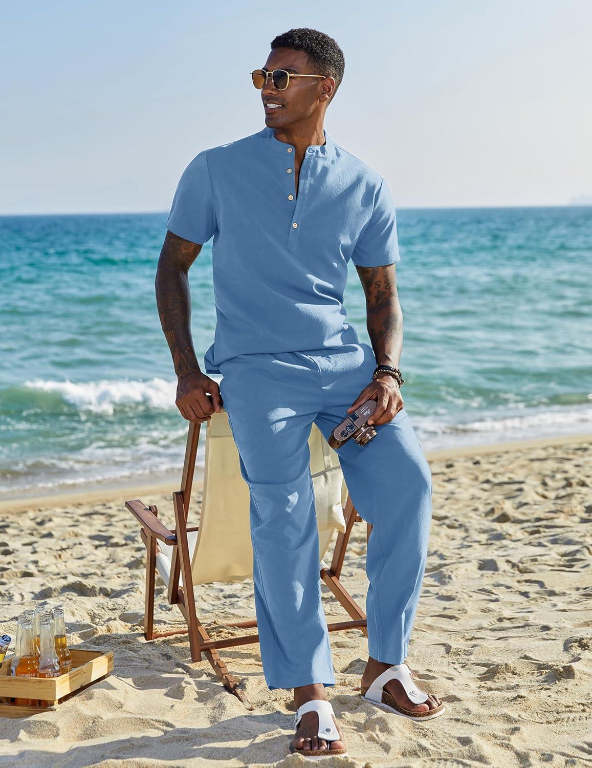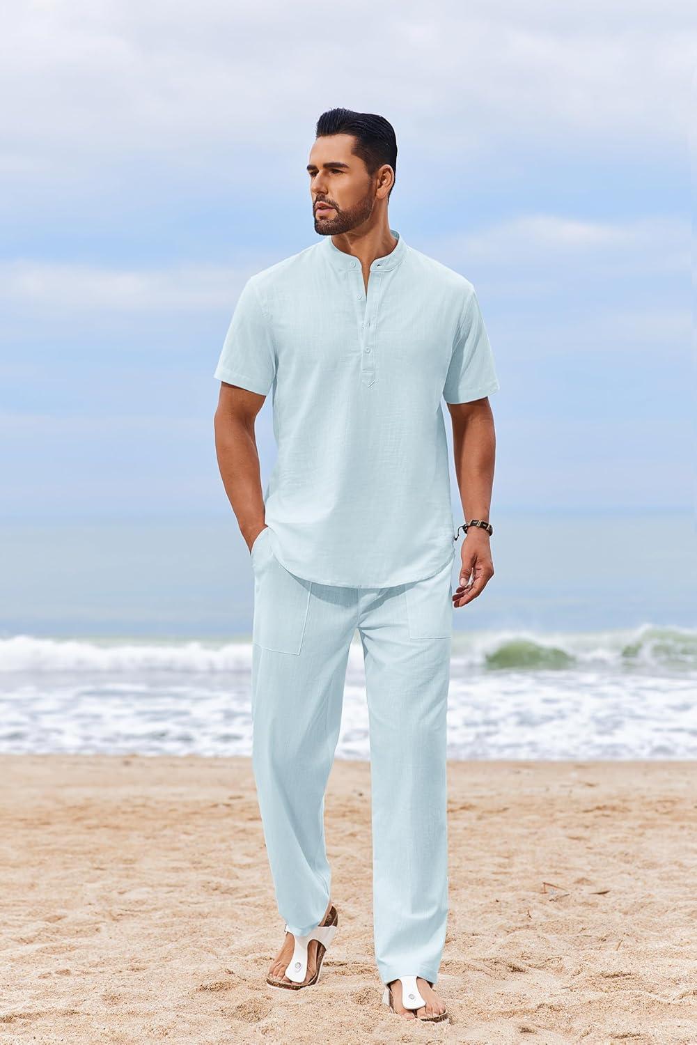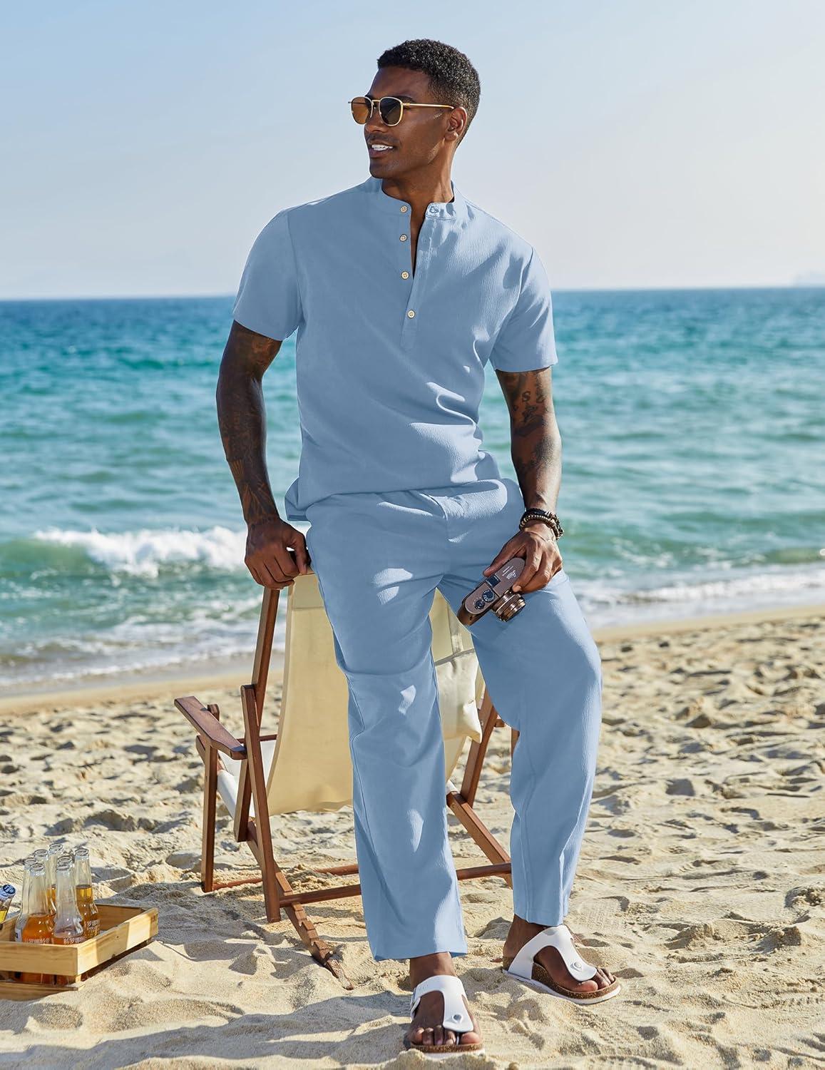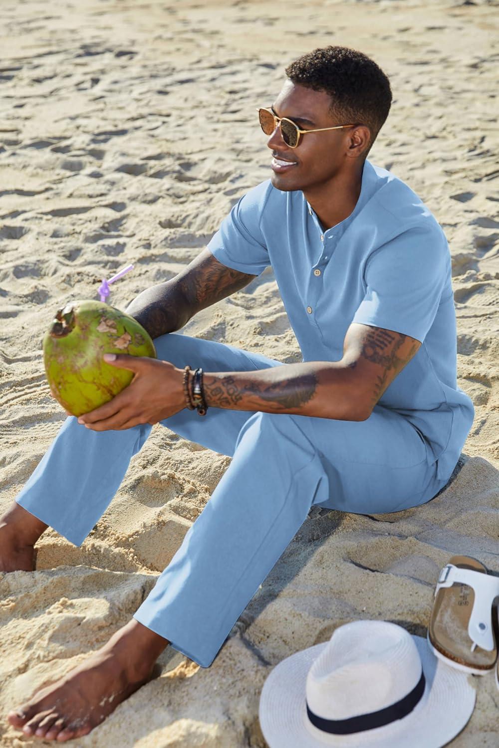 COOFANDY Men’s 2 Piece Cotton Sets Casual Short Sleeve Henley Shirts and Beach Pants with Pockets Summer Vacation Outfits(Light Blue)