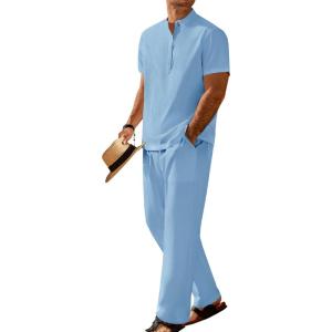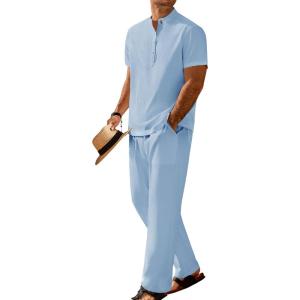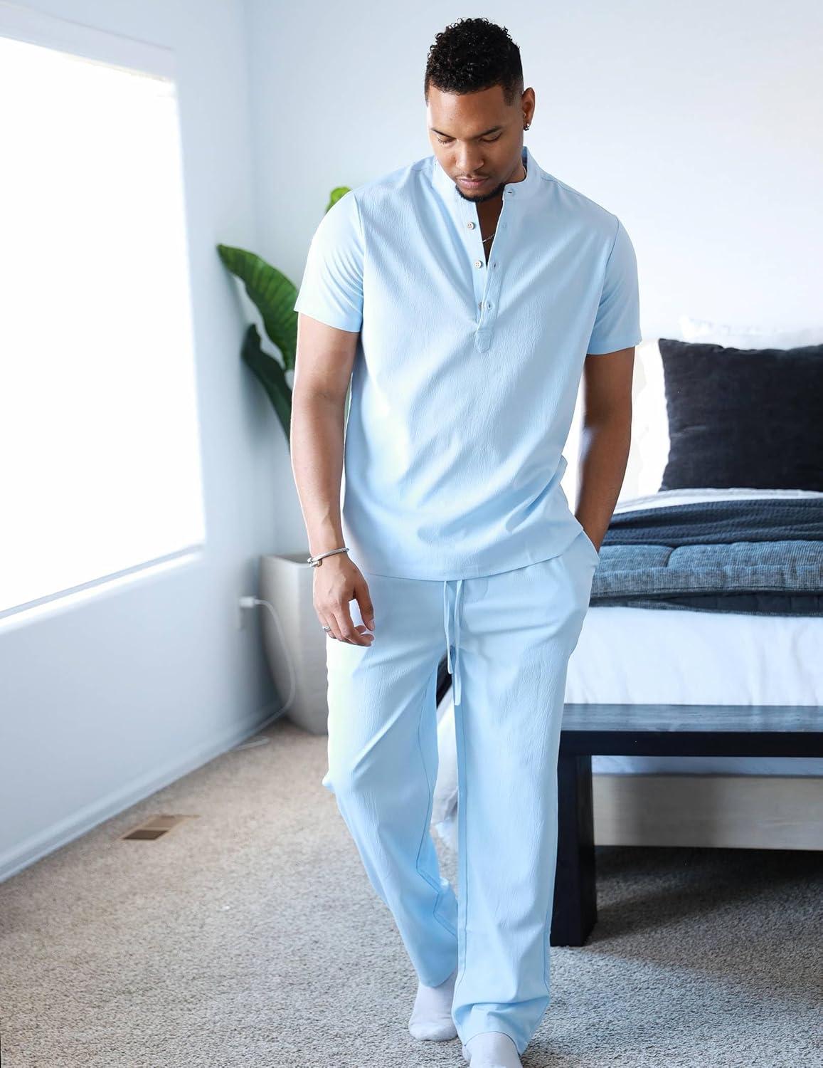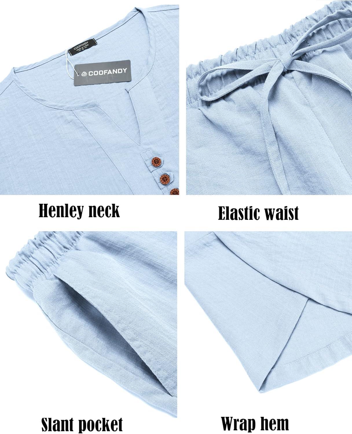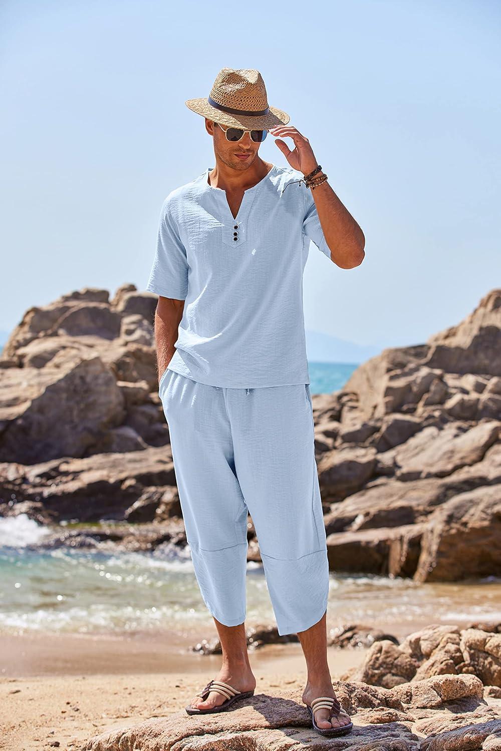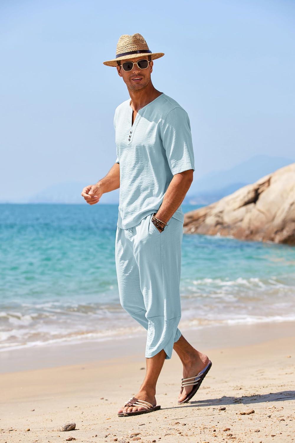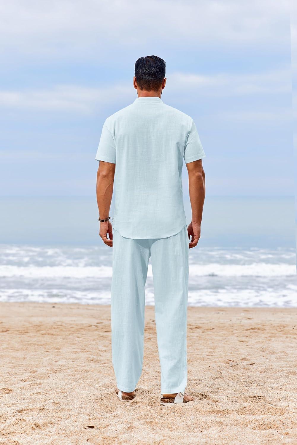 COOFANDY Men’s 2 Piece Cotton Sets Casual Short Sleeve Henley Shirts and Beach Pants with Pockets Summer Vacation Outfits(Light Blue)