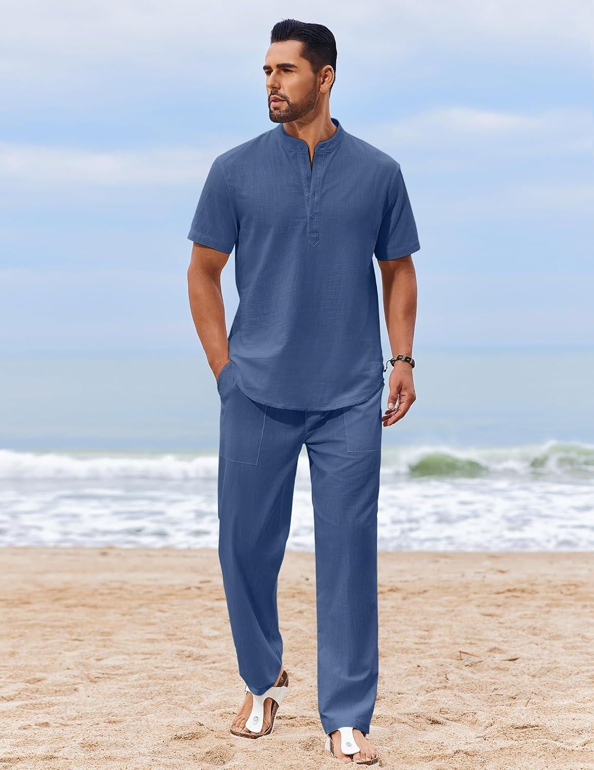 COOFANDY Men’s 2 Piece Cotton Sets Casual Short Sleeve Henley Shirts and Beach Pants with Pockets Summer Vacation Outfits(Denim Blue)