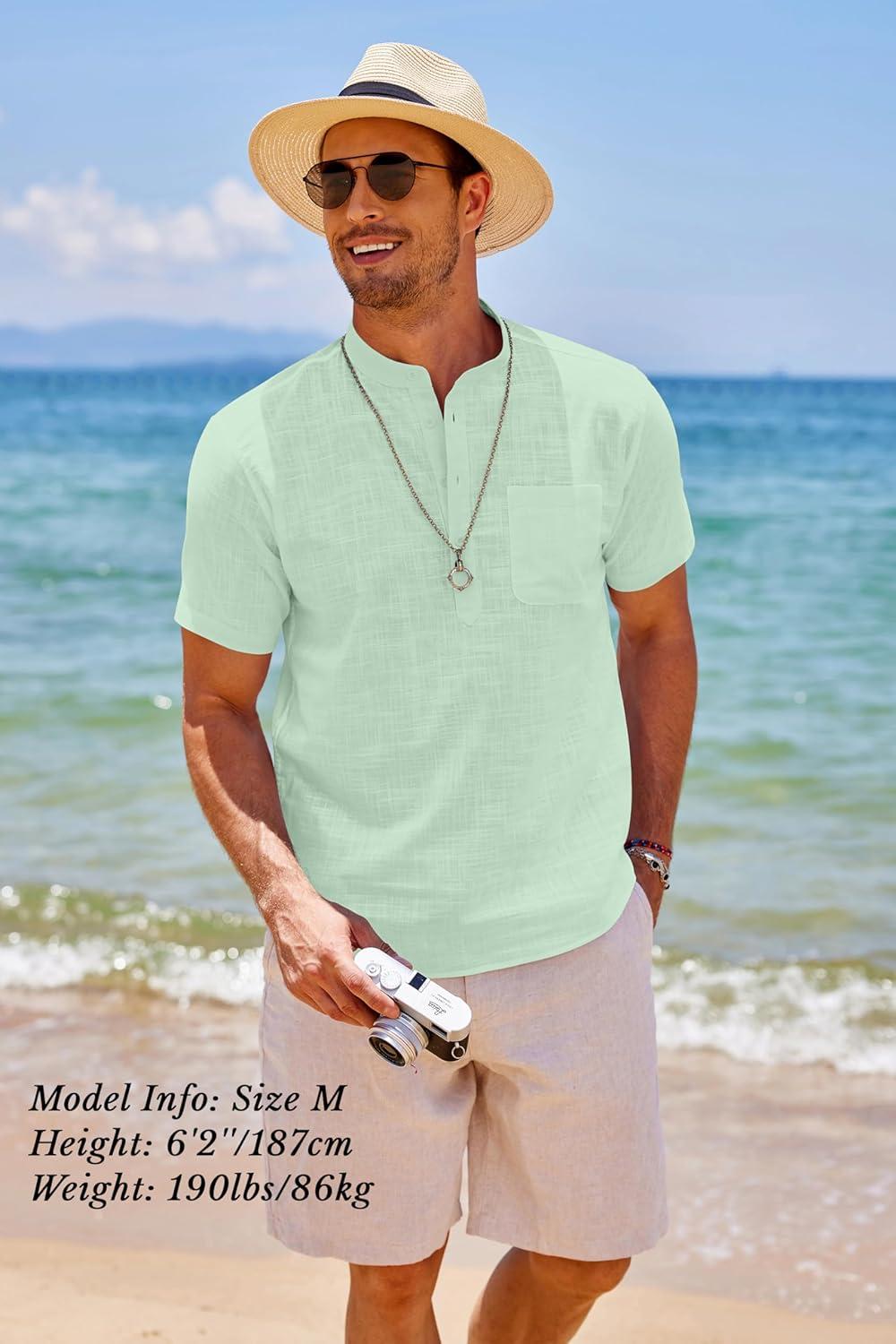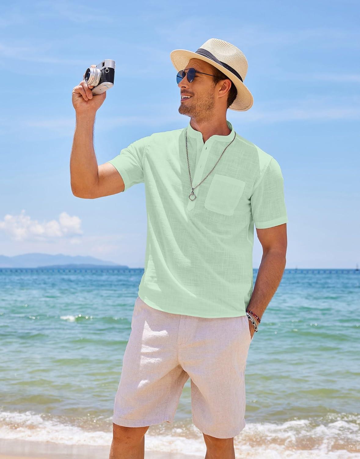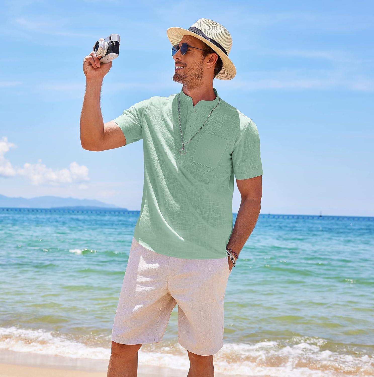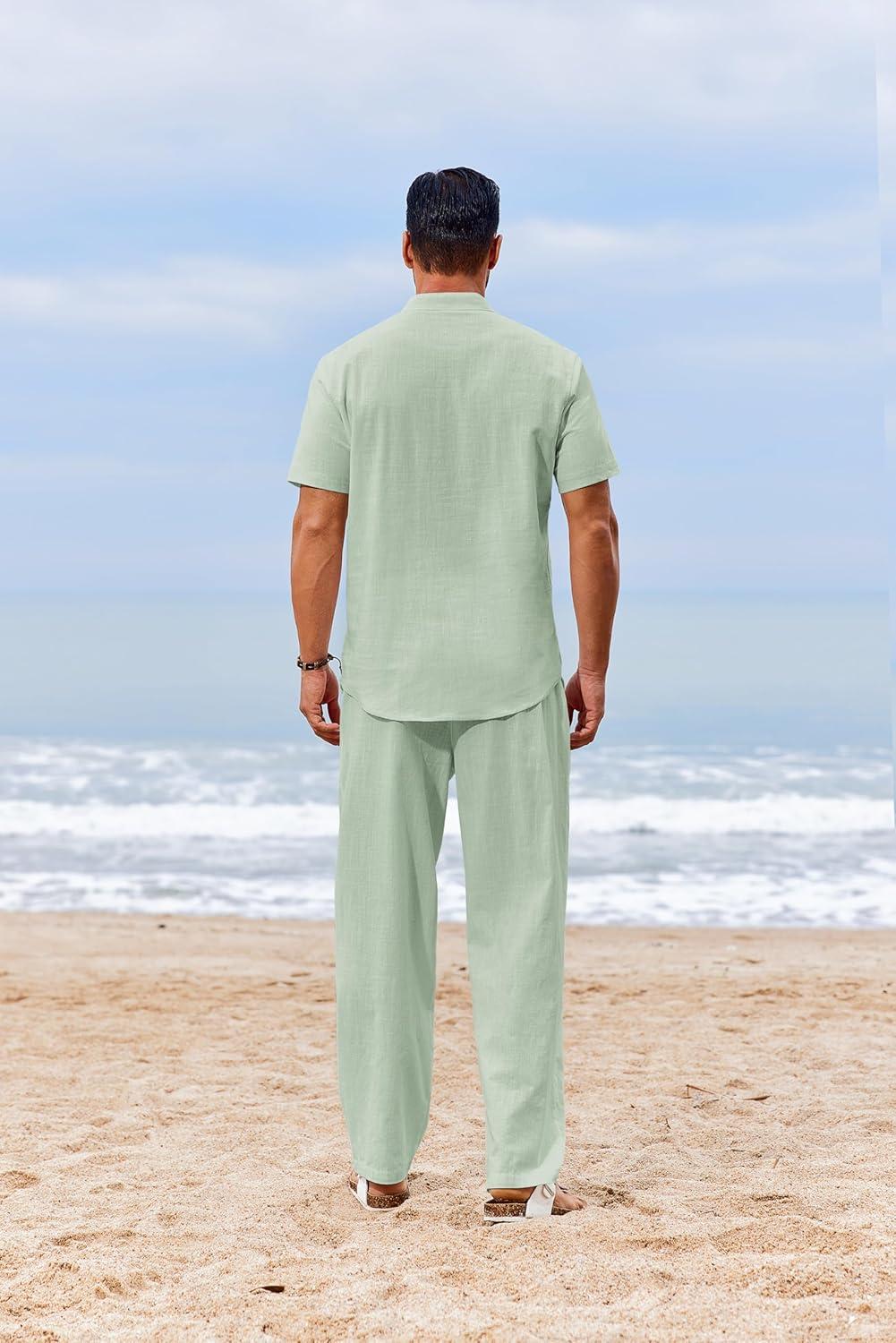 COOFANDY Men’s 2 Piece Cotton Linen Sets Summer Beach Outfits Casual Short Sleeve Henley Shirts and Vacation Shorts(Light Green)