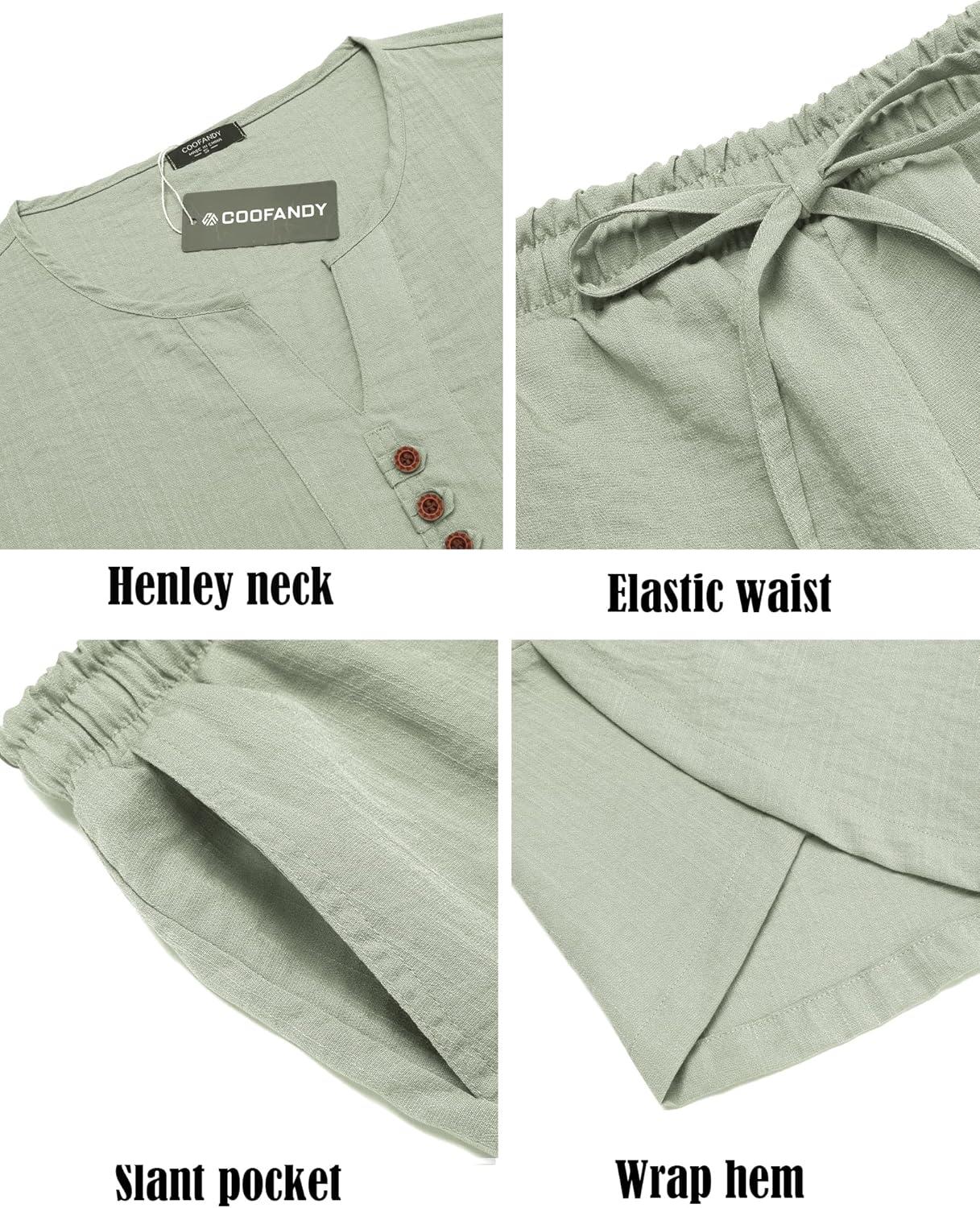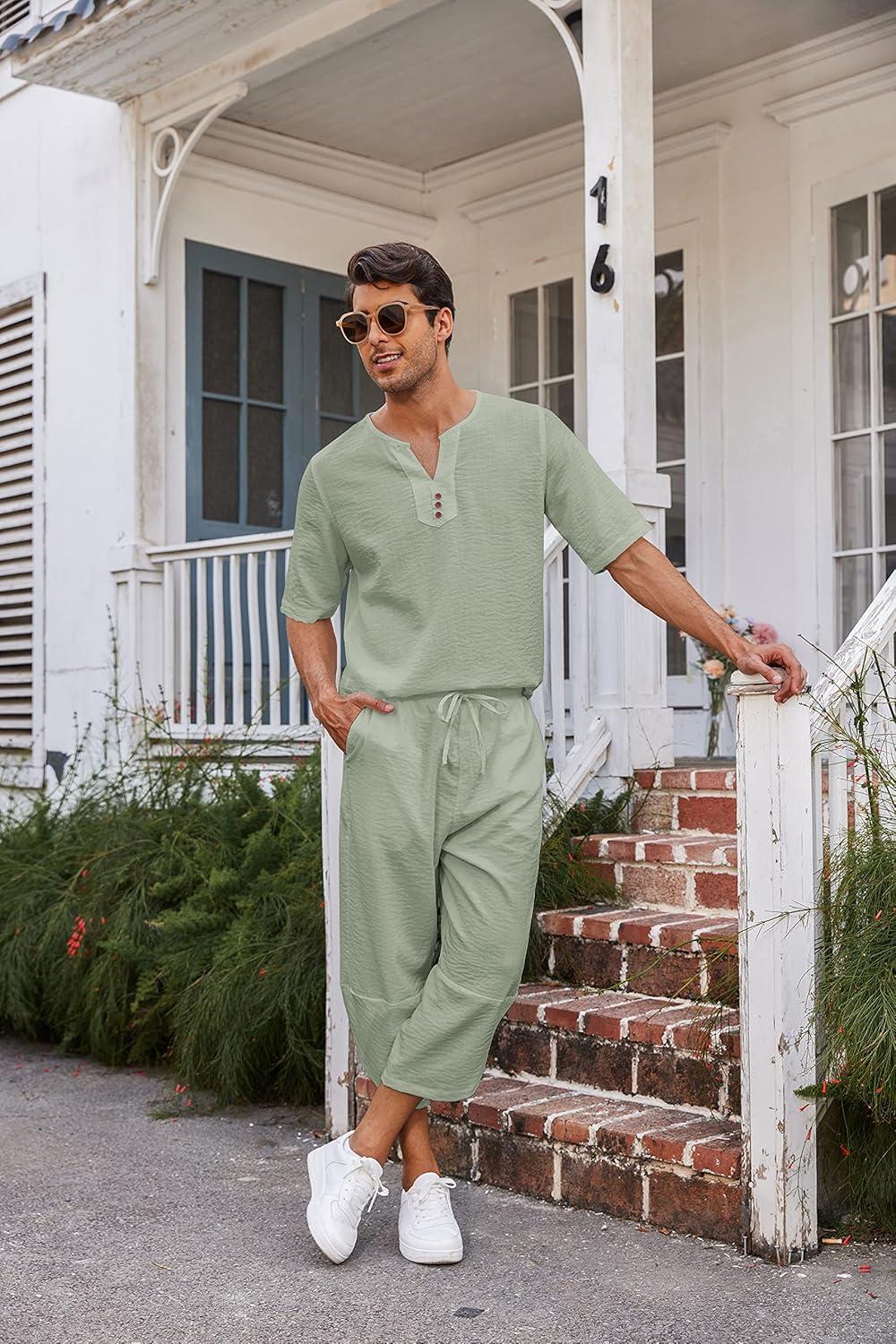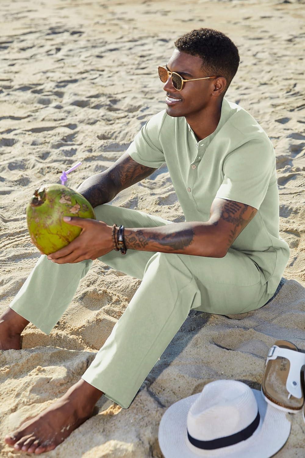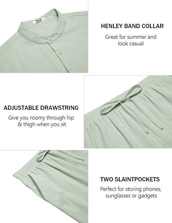 COOFANDY Men’s 2 Piece Cotton Sets Casual Short Sleeve Henley Shirts and Beach Pants with Pockets Summer Vacation Outfits(Green)