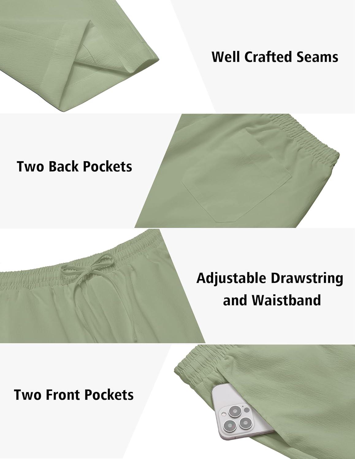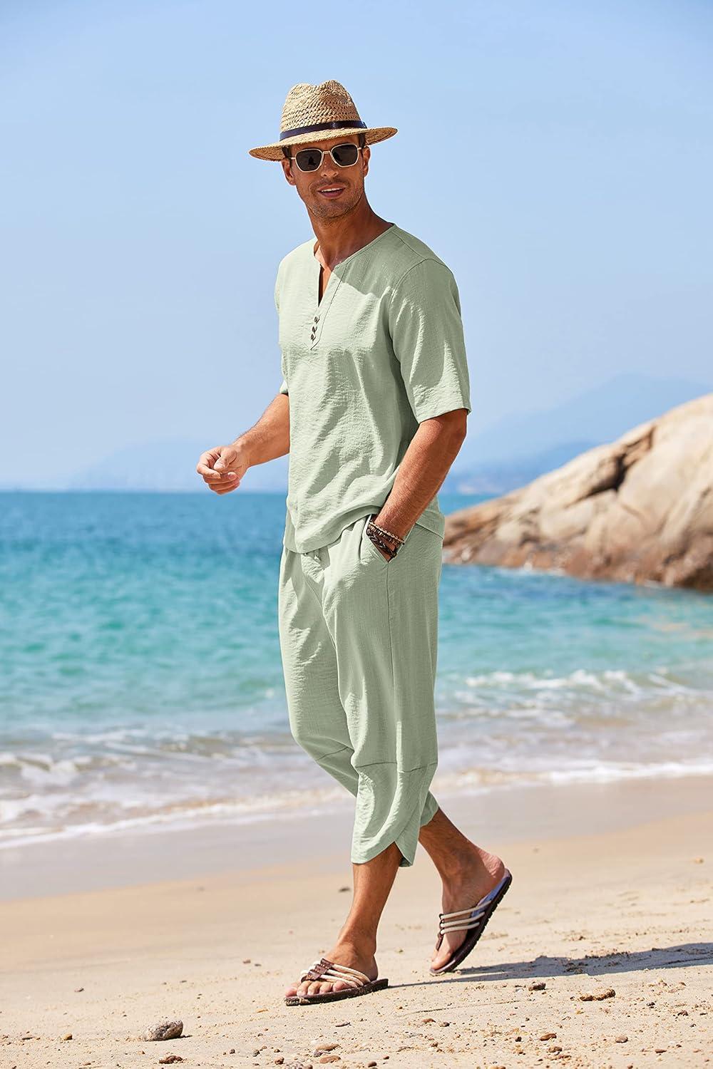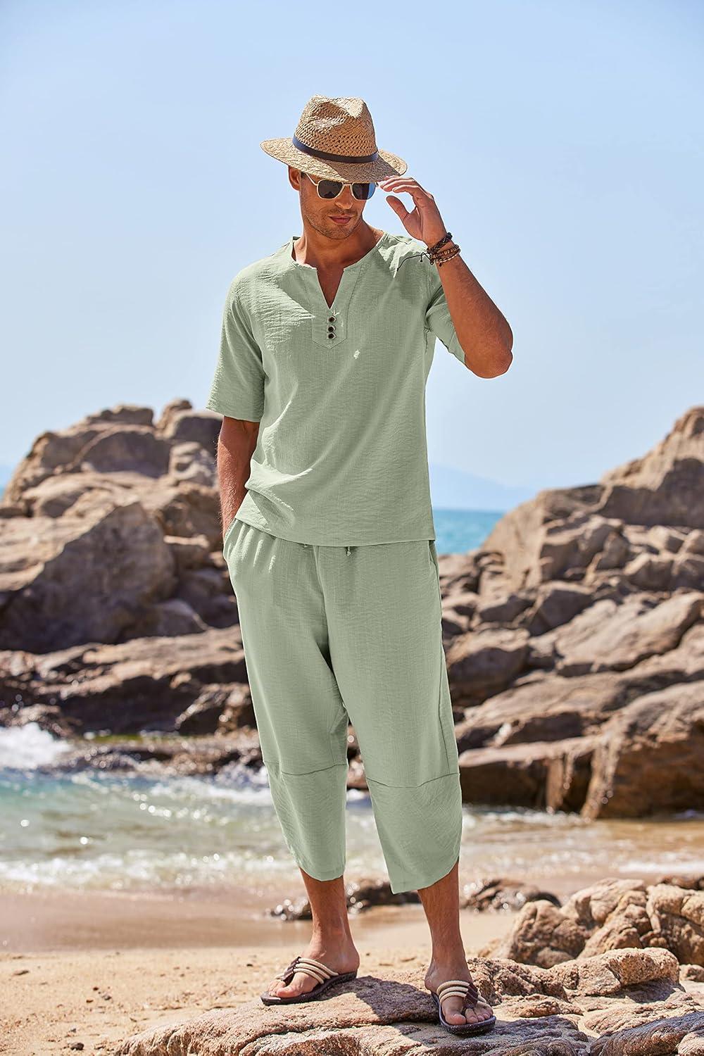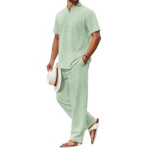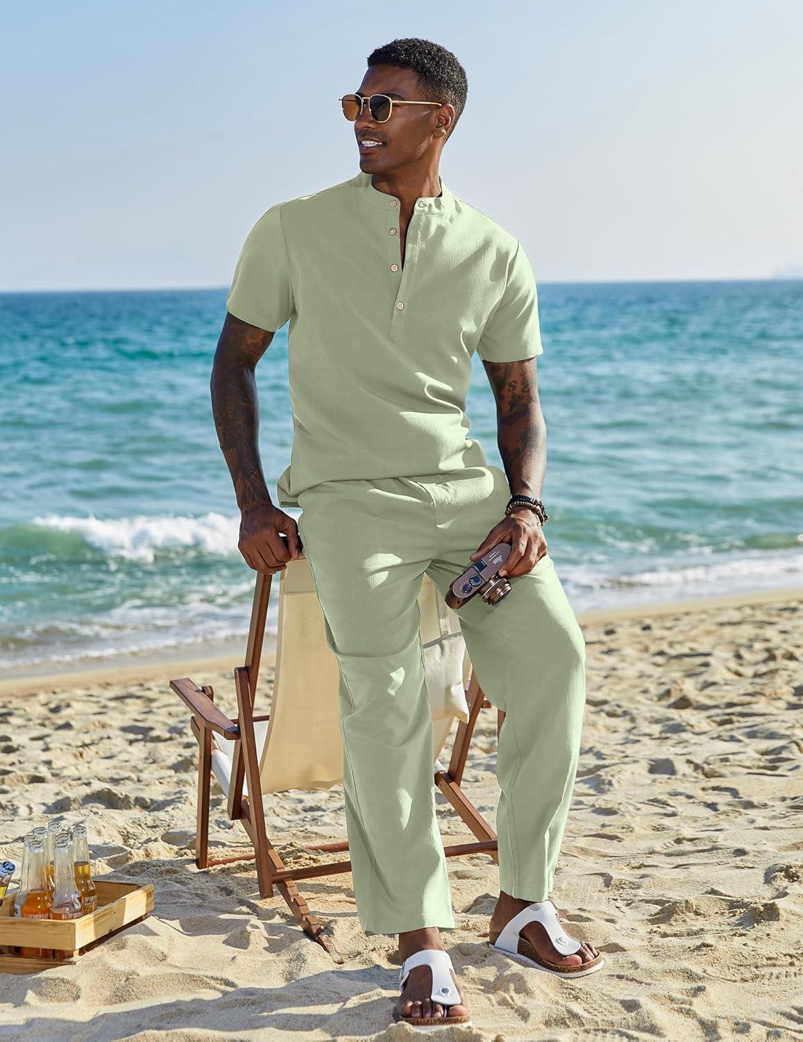 COOFANDY Men’s 2 Piece Cotton Sets Casual Short Sleeve Henley Shirts and Beach Pants with Pockets Summer Vacation Outfits(Green)
