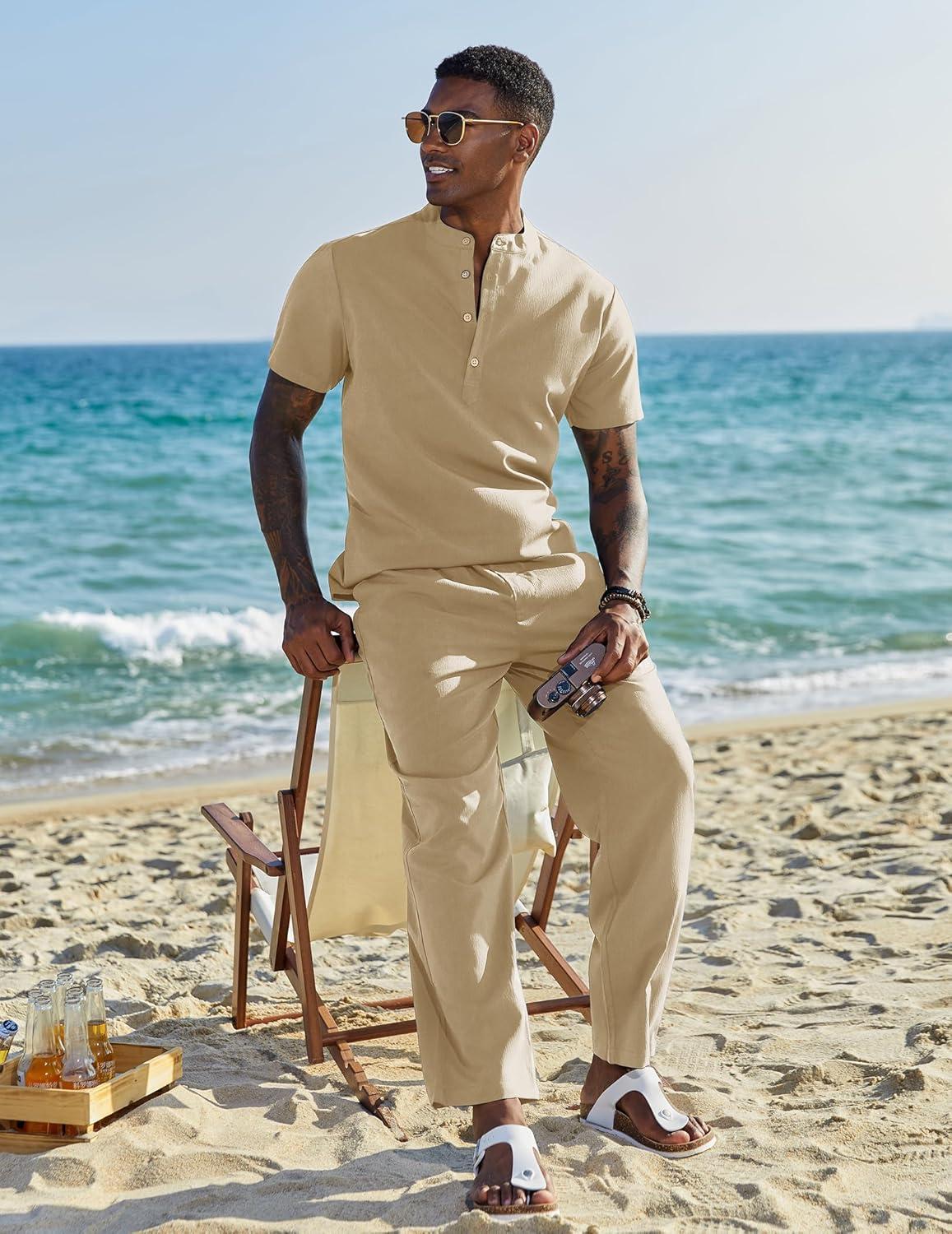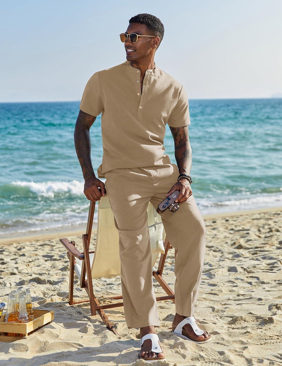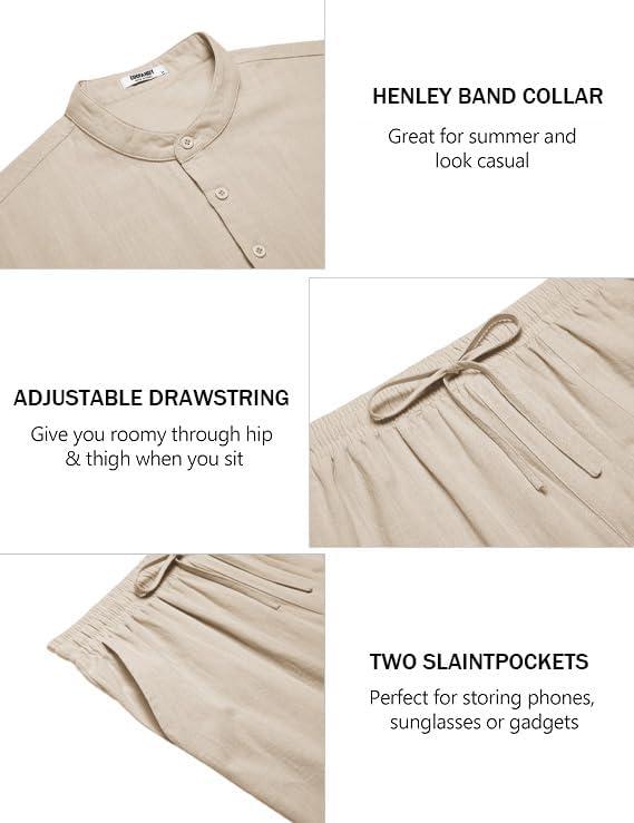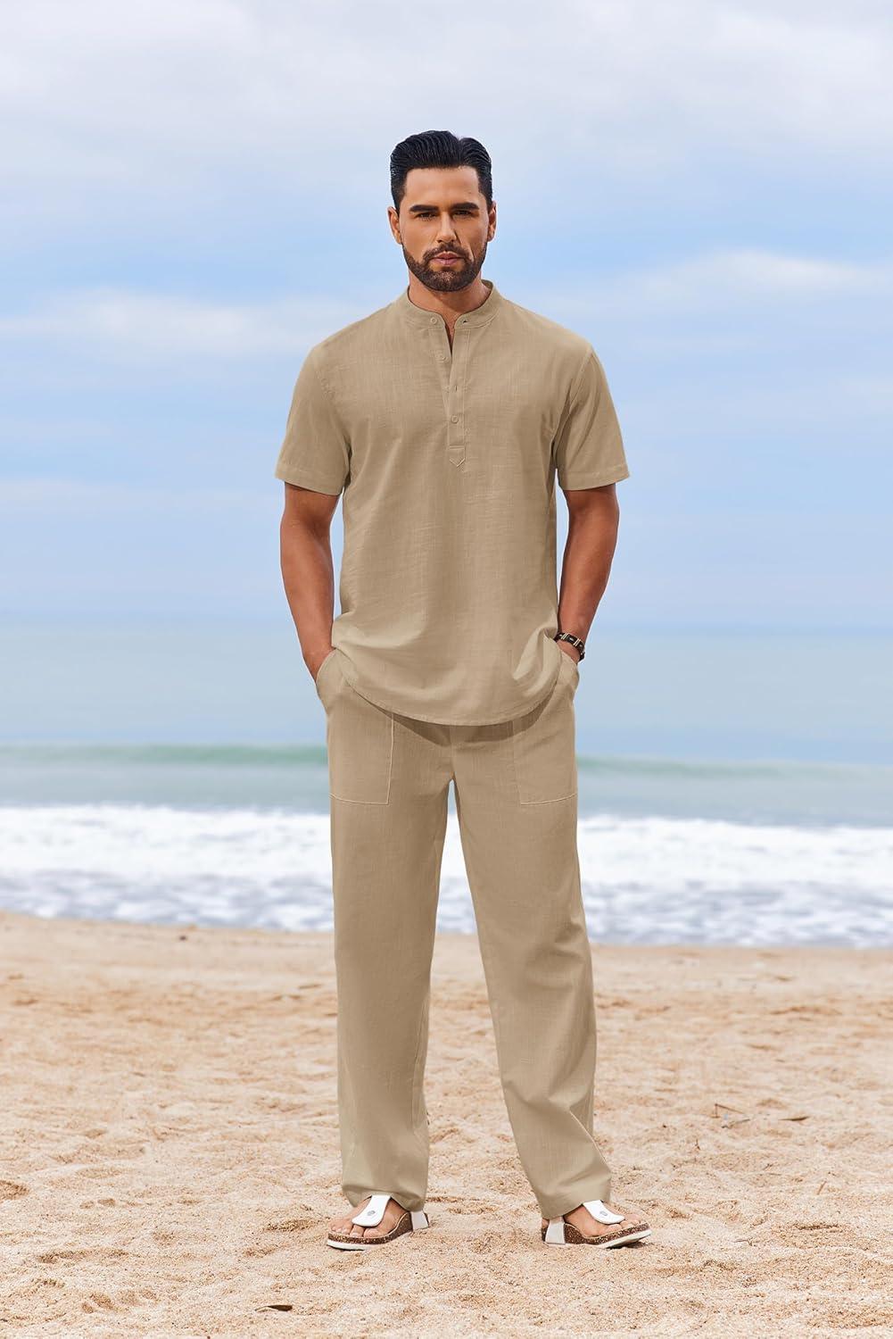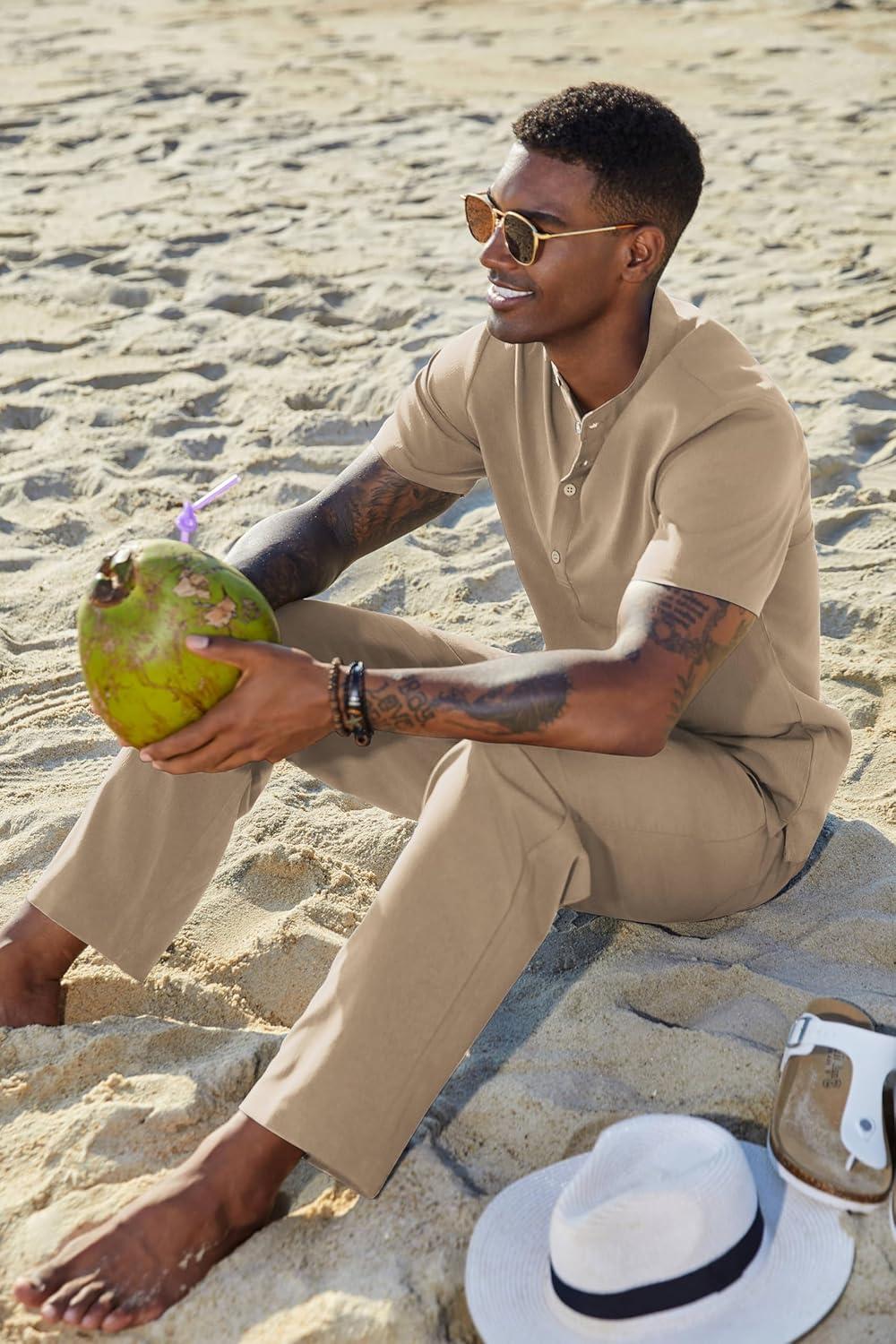 COOFANDY Men’s 2 Piece Cotton Sets Casual Short Sleeve Henley Shirts and Beach Pants with Pockets Summer Vacation Outfits(Khaki)