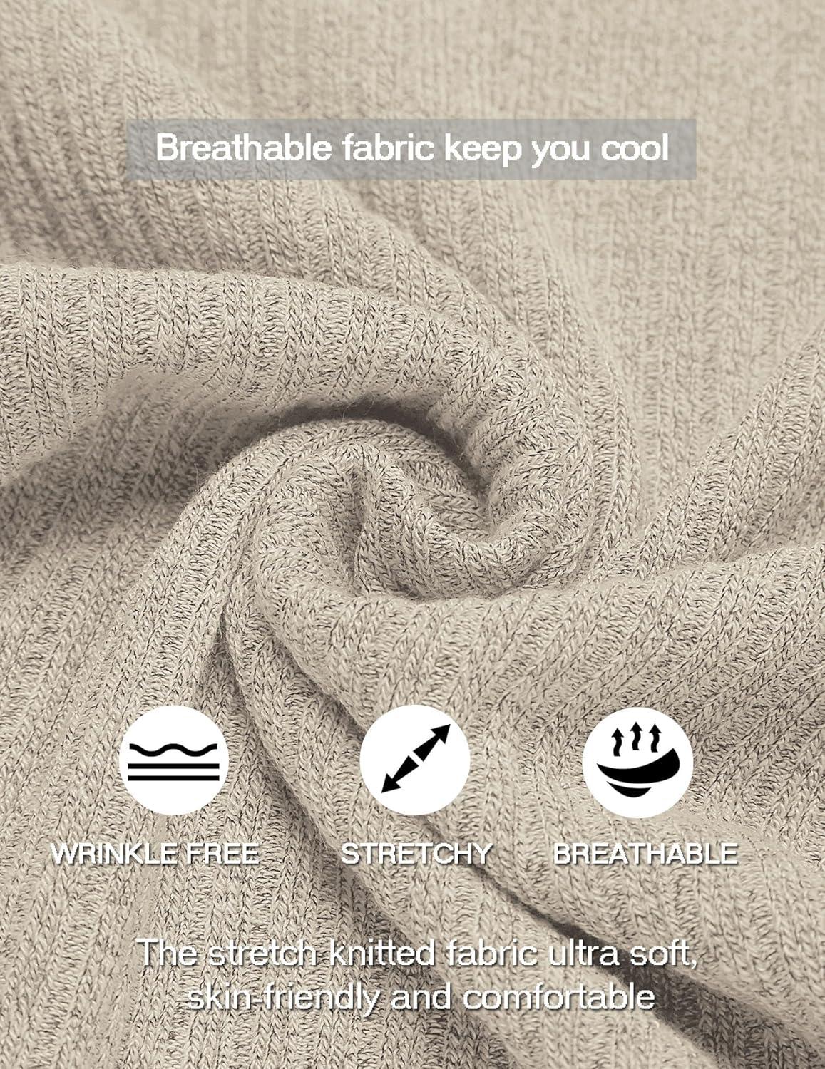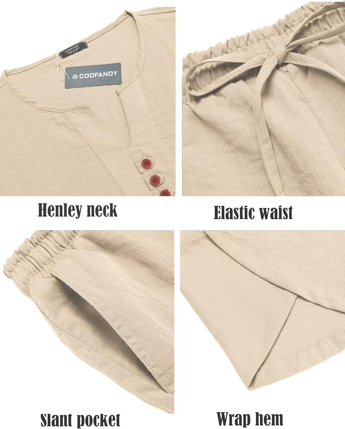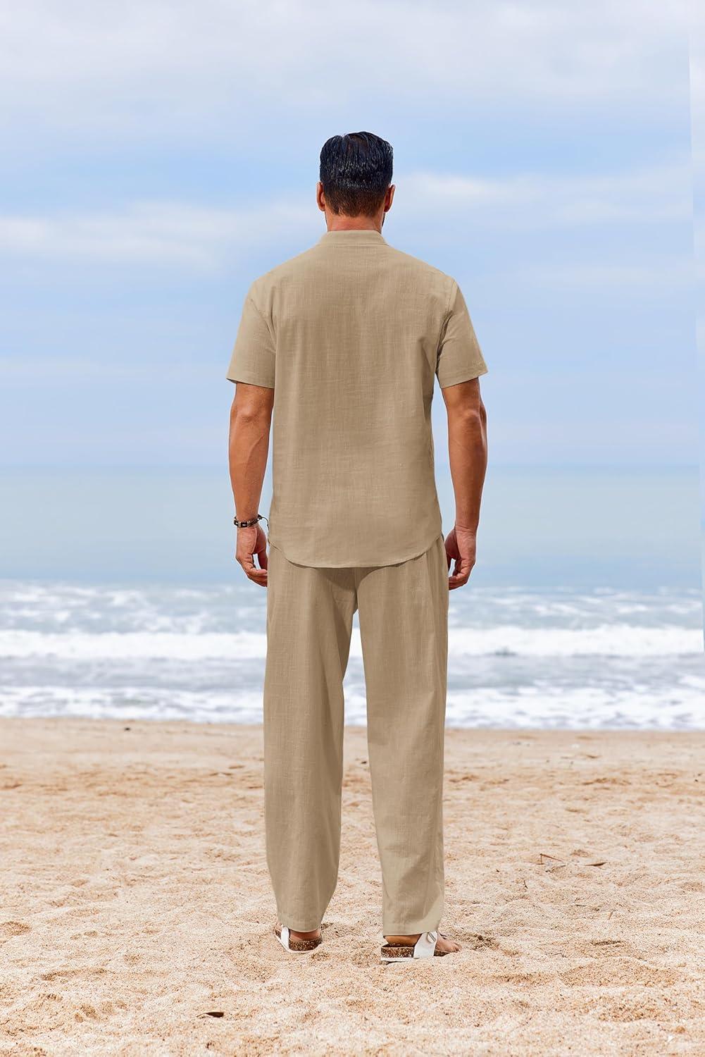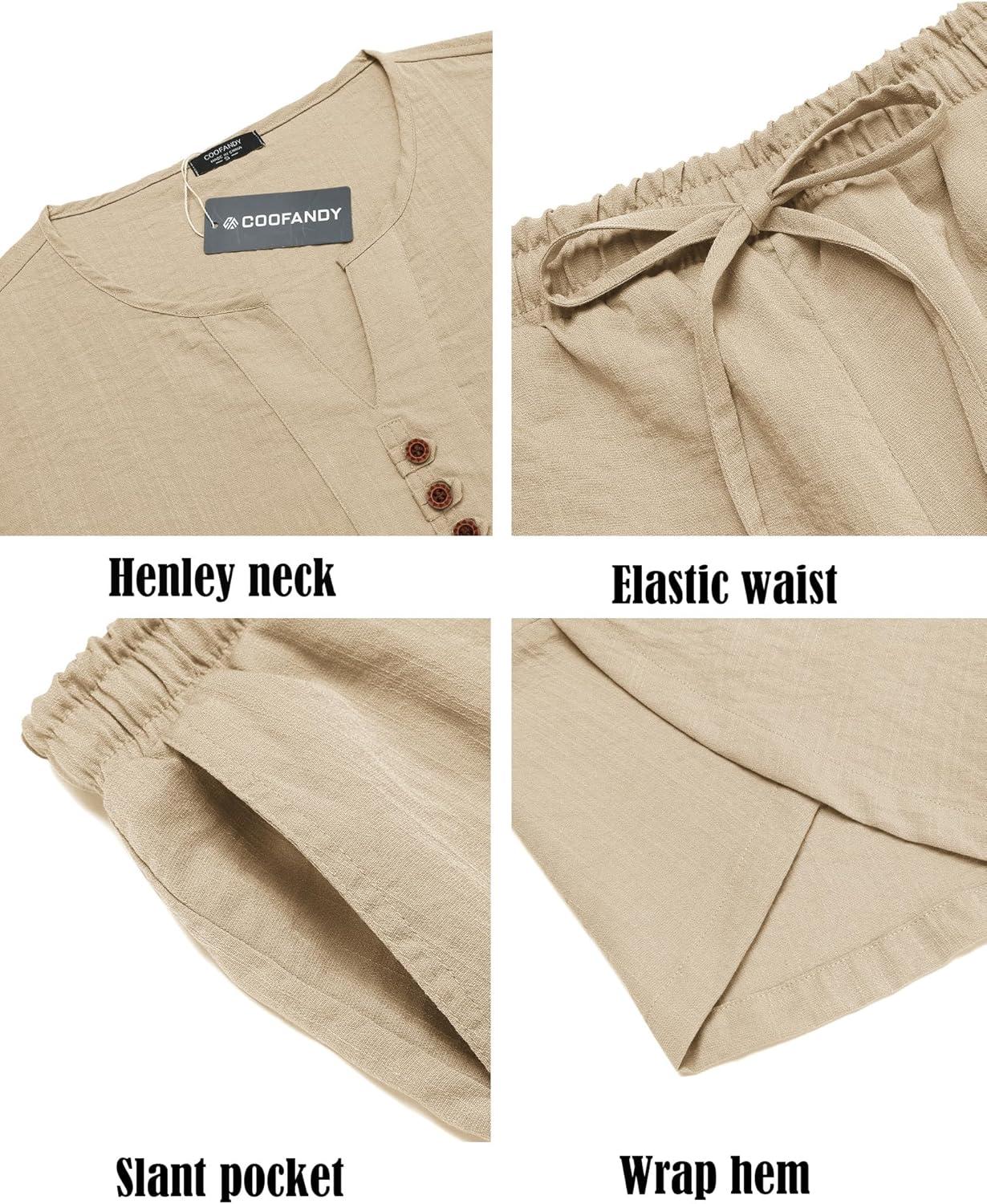 COOFANDY Men’s 2 Piece Cotton Sets Casual Short Sleeve Henley Shirts and Beach Pants with Pockets Summer Vacation Outfits(Khaki)