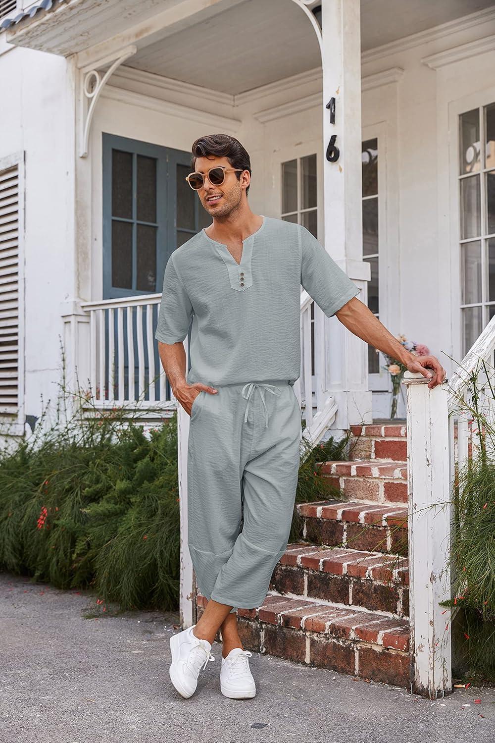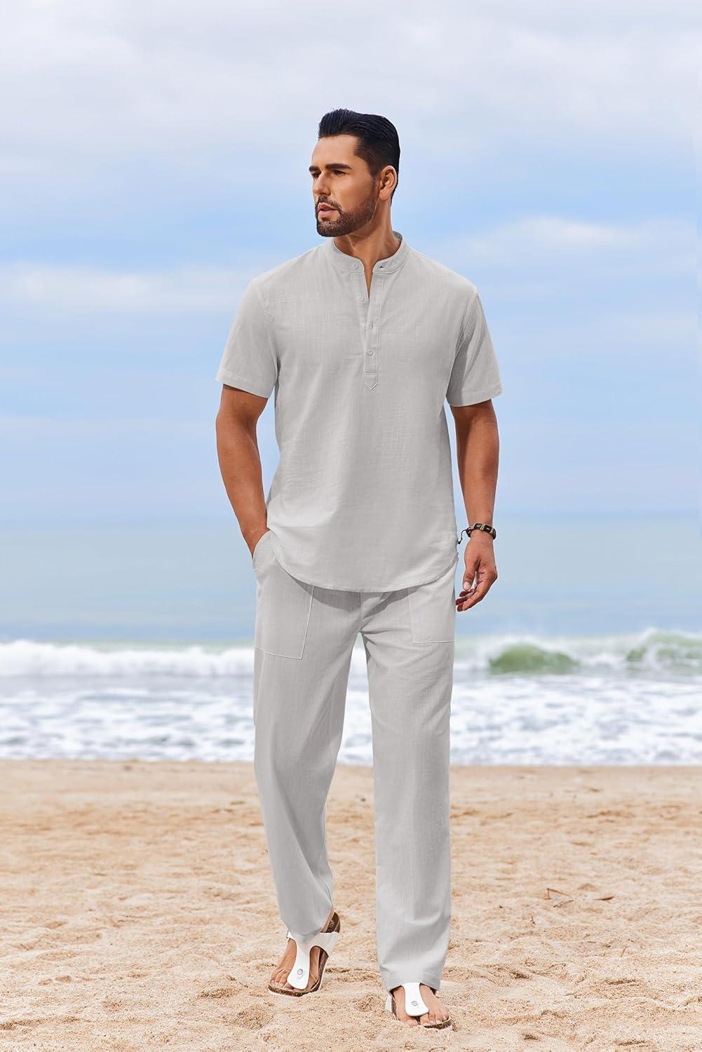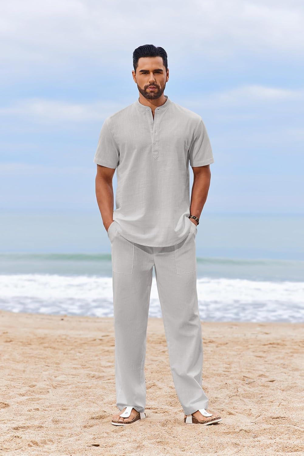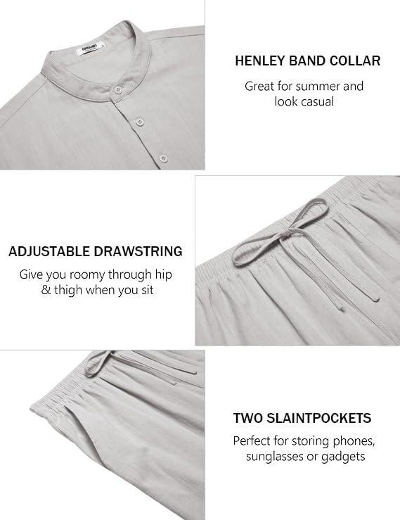 COOFANDY Men’s 2 Piece Cotton Sets Casual Short Sleeve Henley Shirts and Beach Pants with Pockets Summer Vacation Outfits(Light Grey)