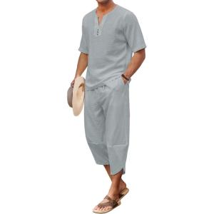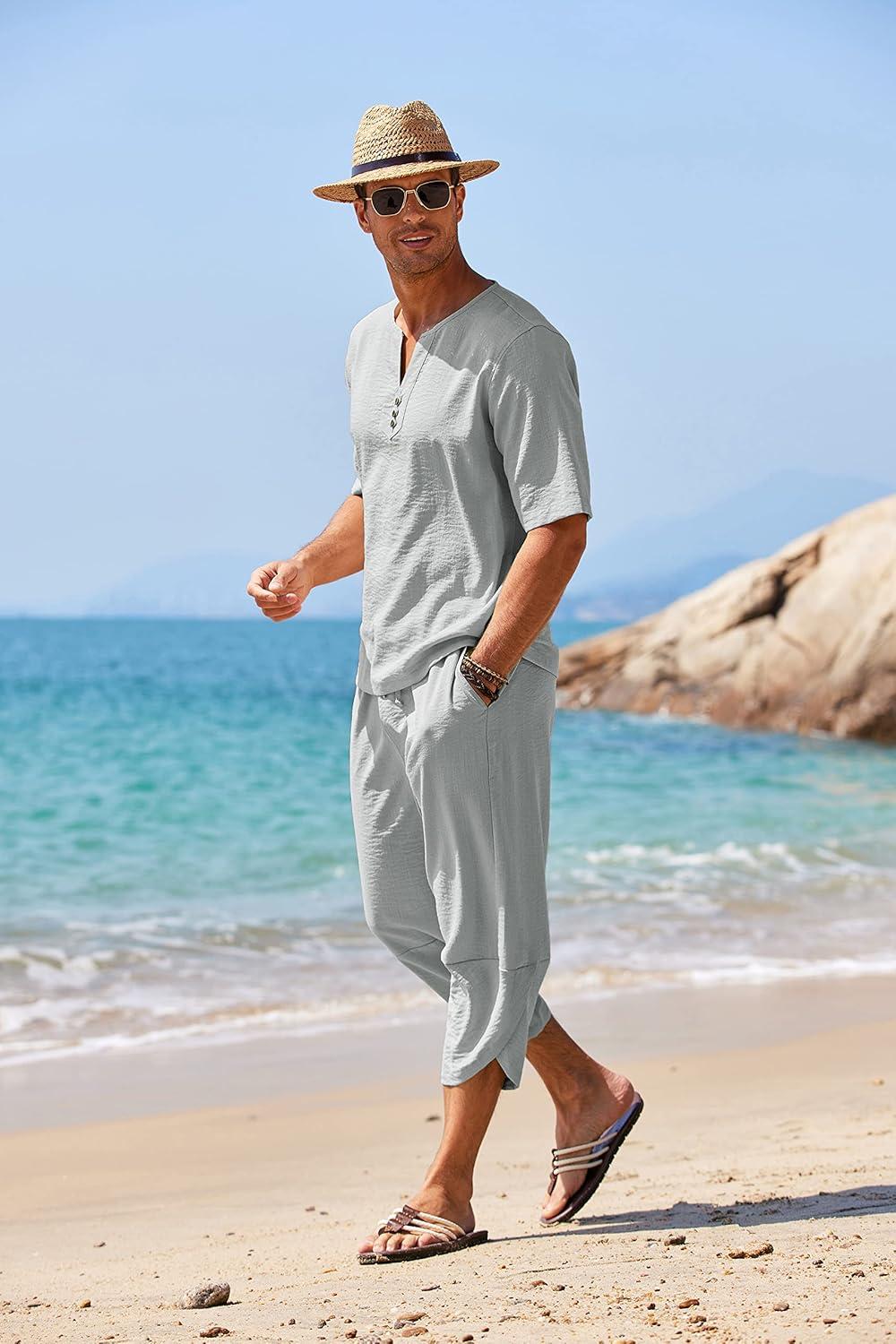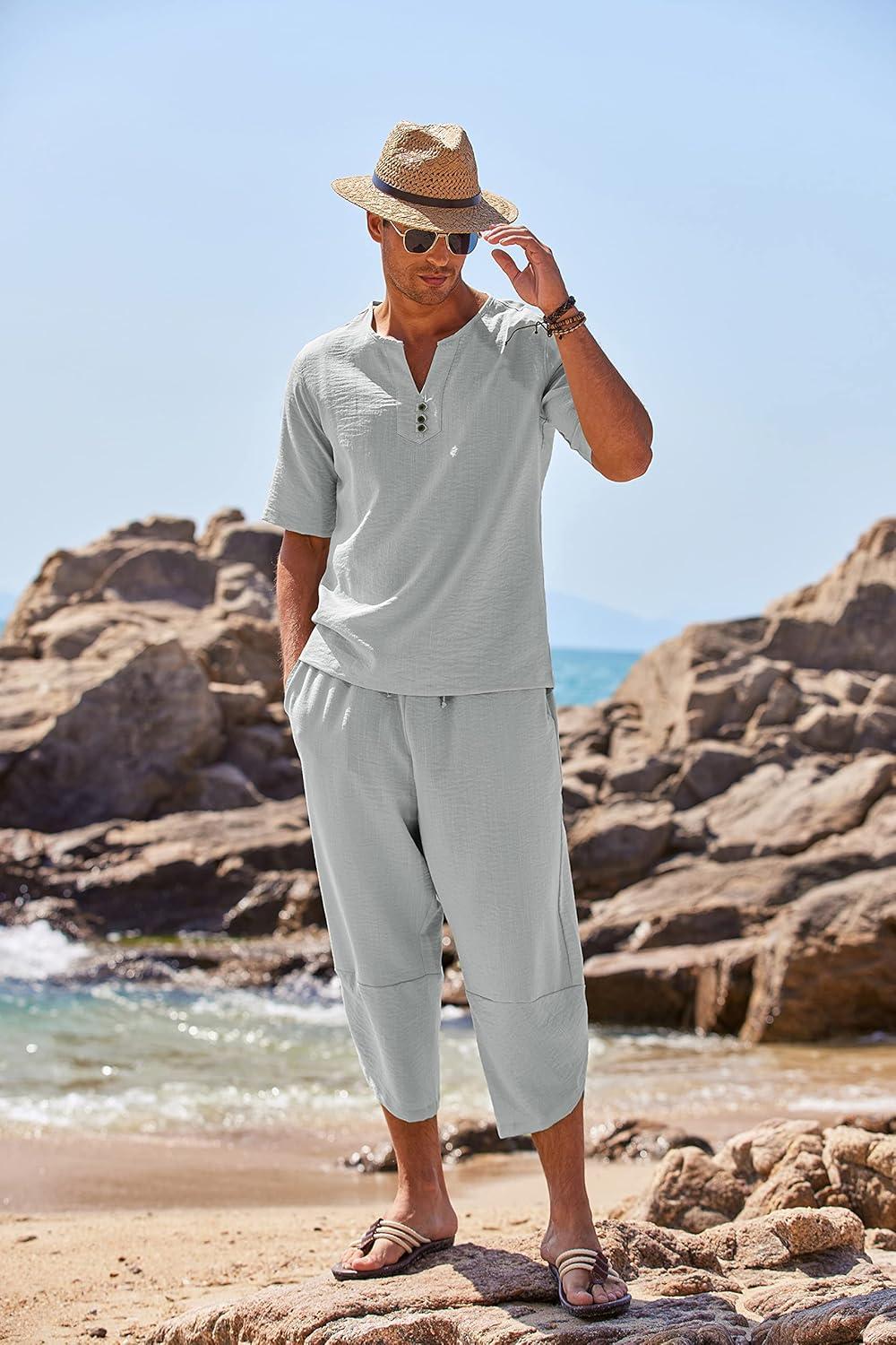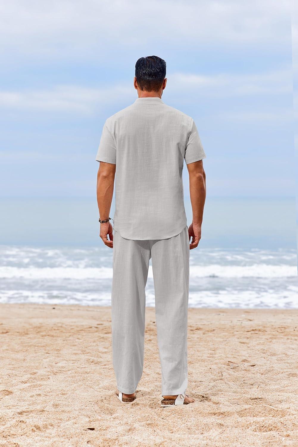 COOFANDY Men’s 2 Piece Cotton Sets Casual Short Sleeve Henley Shirts and Beach Pants with Pockets Summer Vacation Outfits(Light Grey)