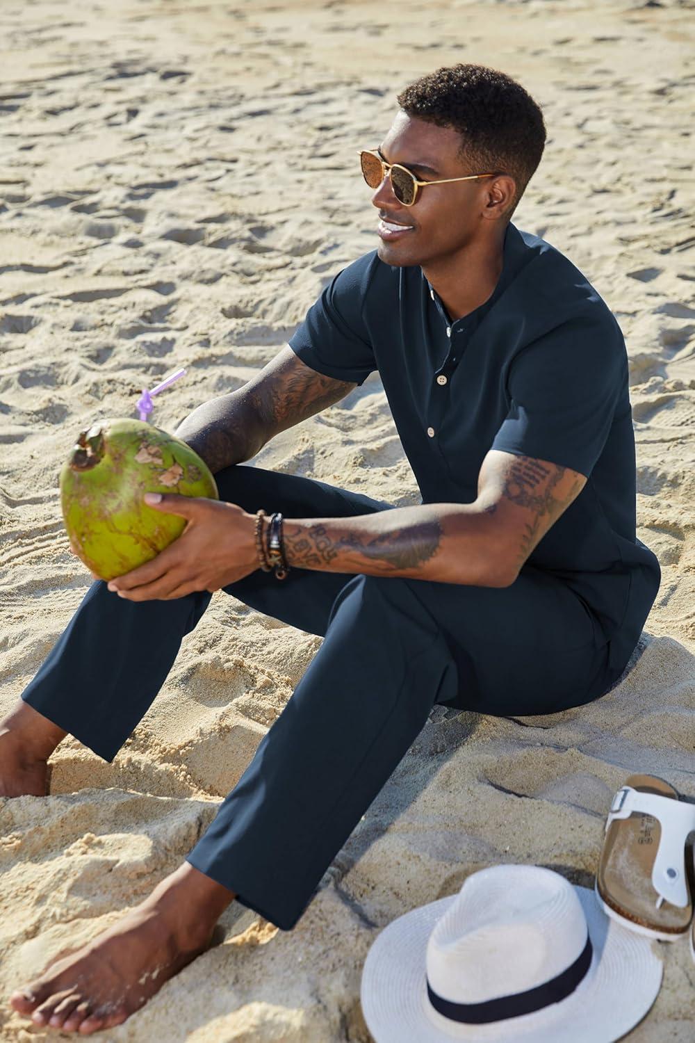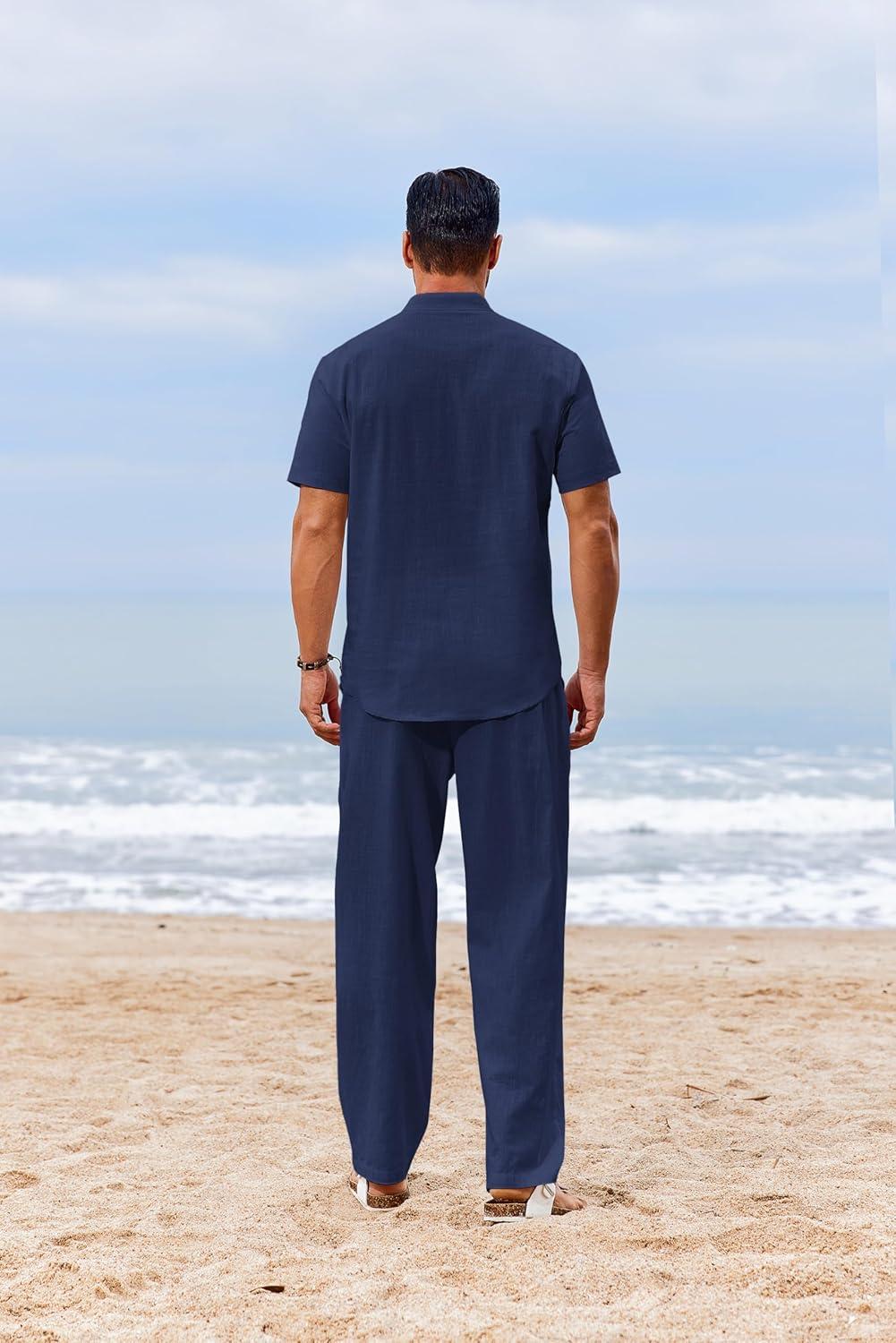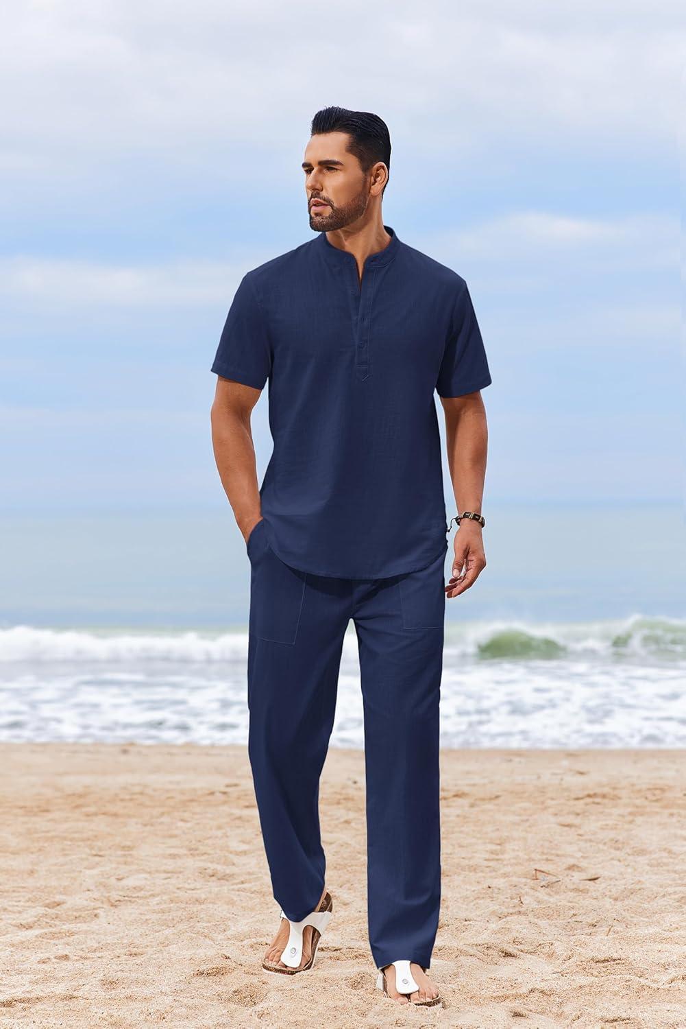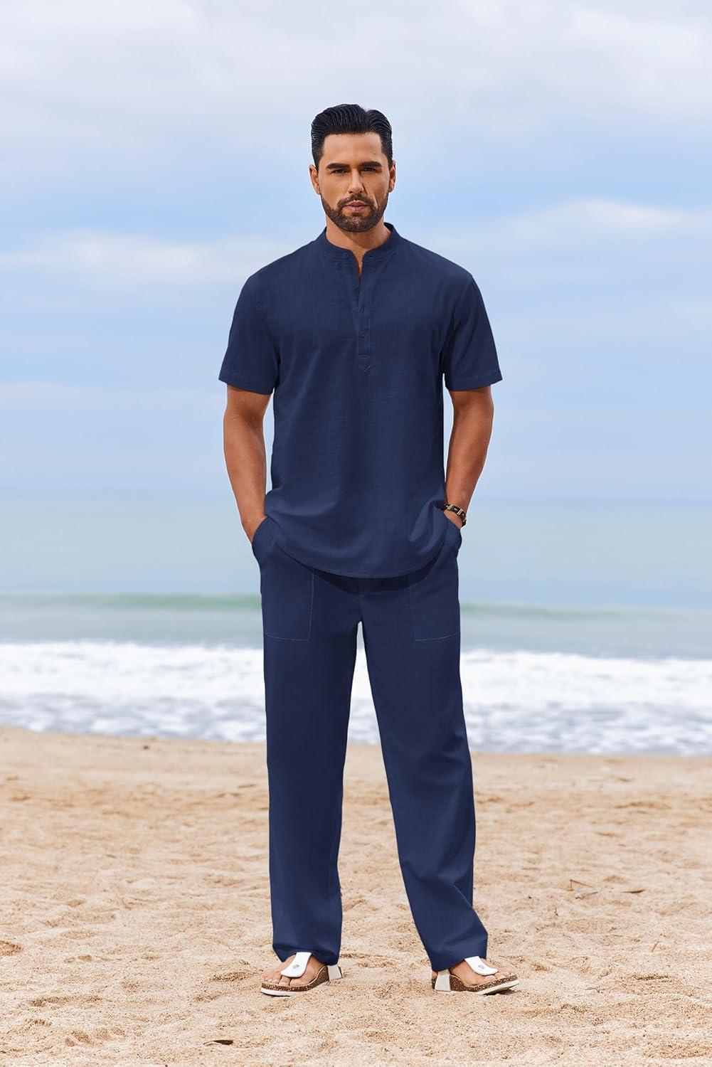 COOFANDY Men’s 2 Piece Cotton Sets Casual Short Sleeve Henley Shirts and Beach Pants with Pockets Summer Vacation Outfits(Navy Blue)