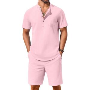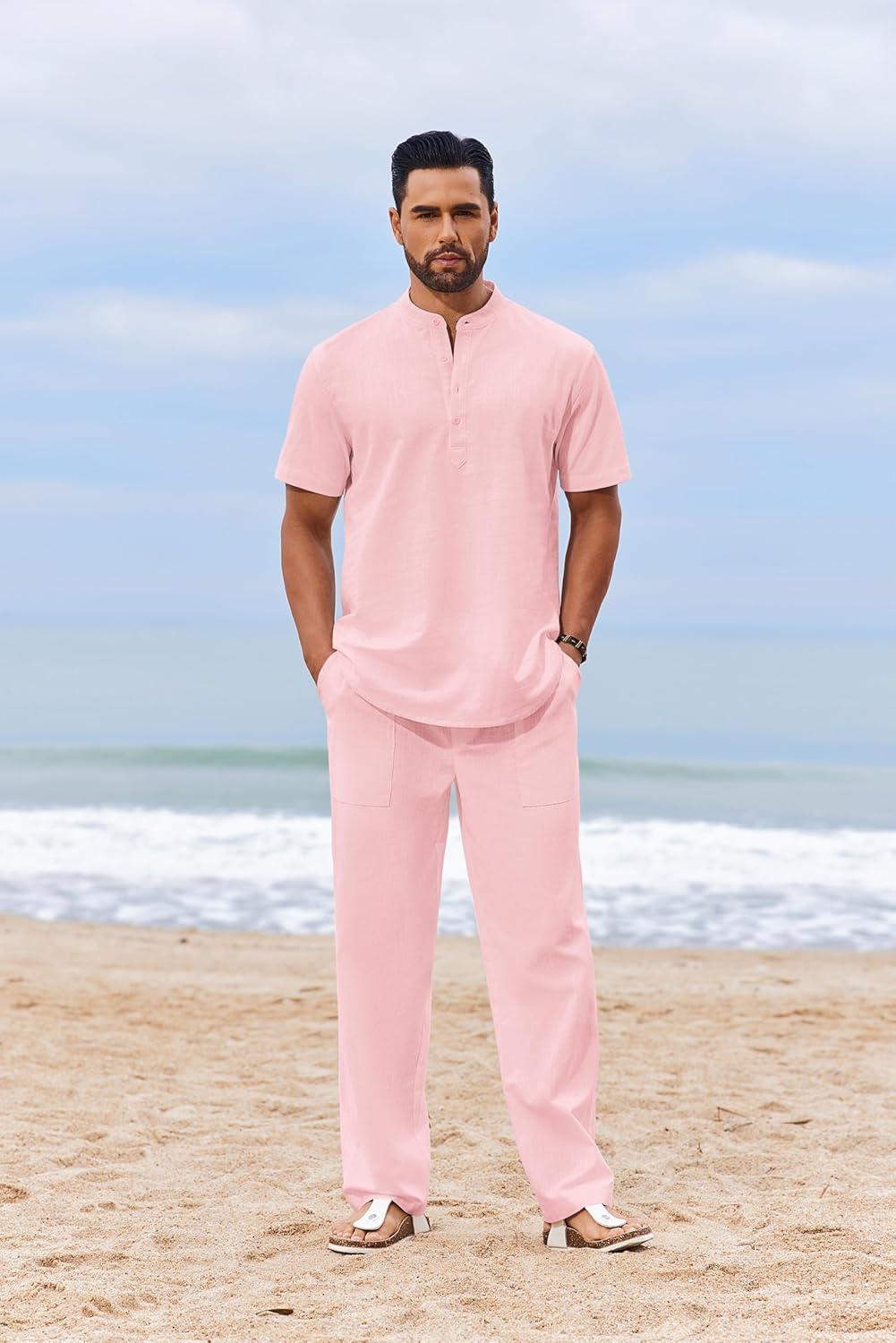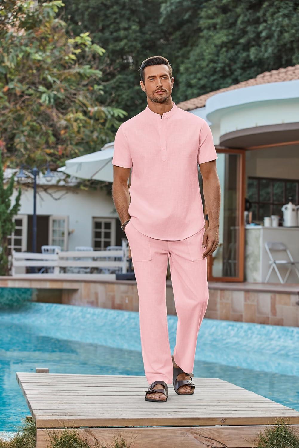 COOFANDY Men’s 2 Piece Cotton Sets Casual Short Sleeve Henley Shirts and Beach Pants with Pockets Summer Vacation Outfits(Pink)