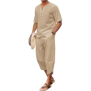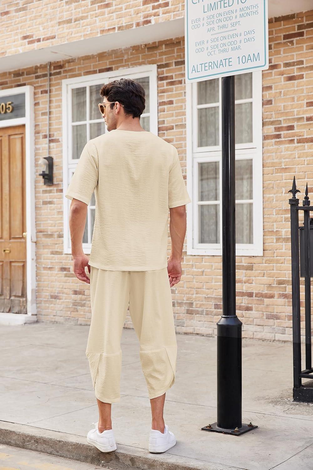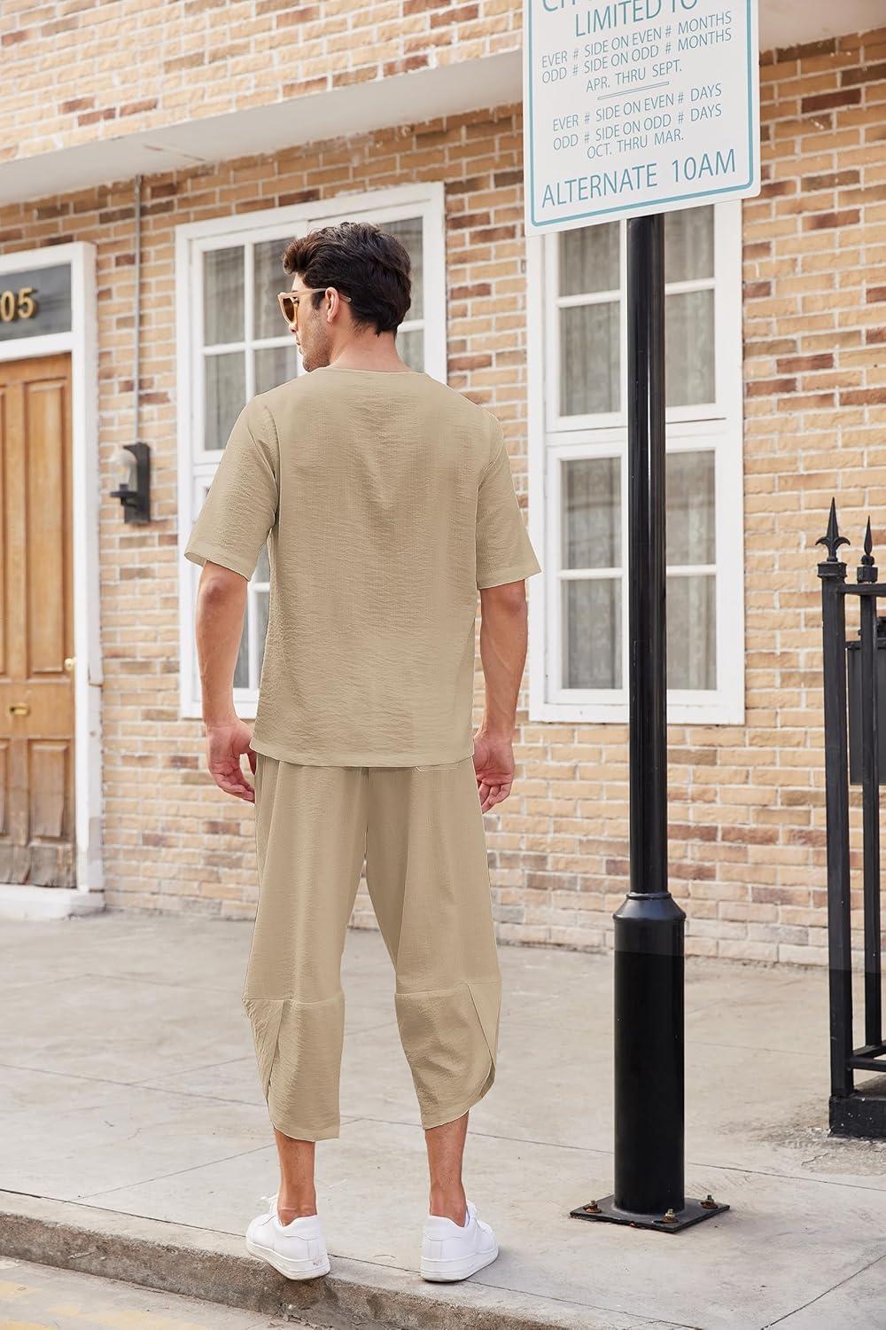 COOFANDY Men’s 2 Pieces Linen Set Henley Shirt Short Sleeve and Harem Capri Pants Wide Leg Baggy Beach Yoga Trousers Outfits(Khaki)