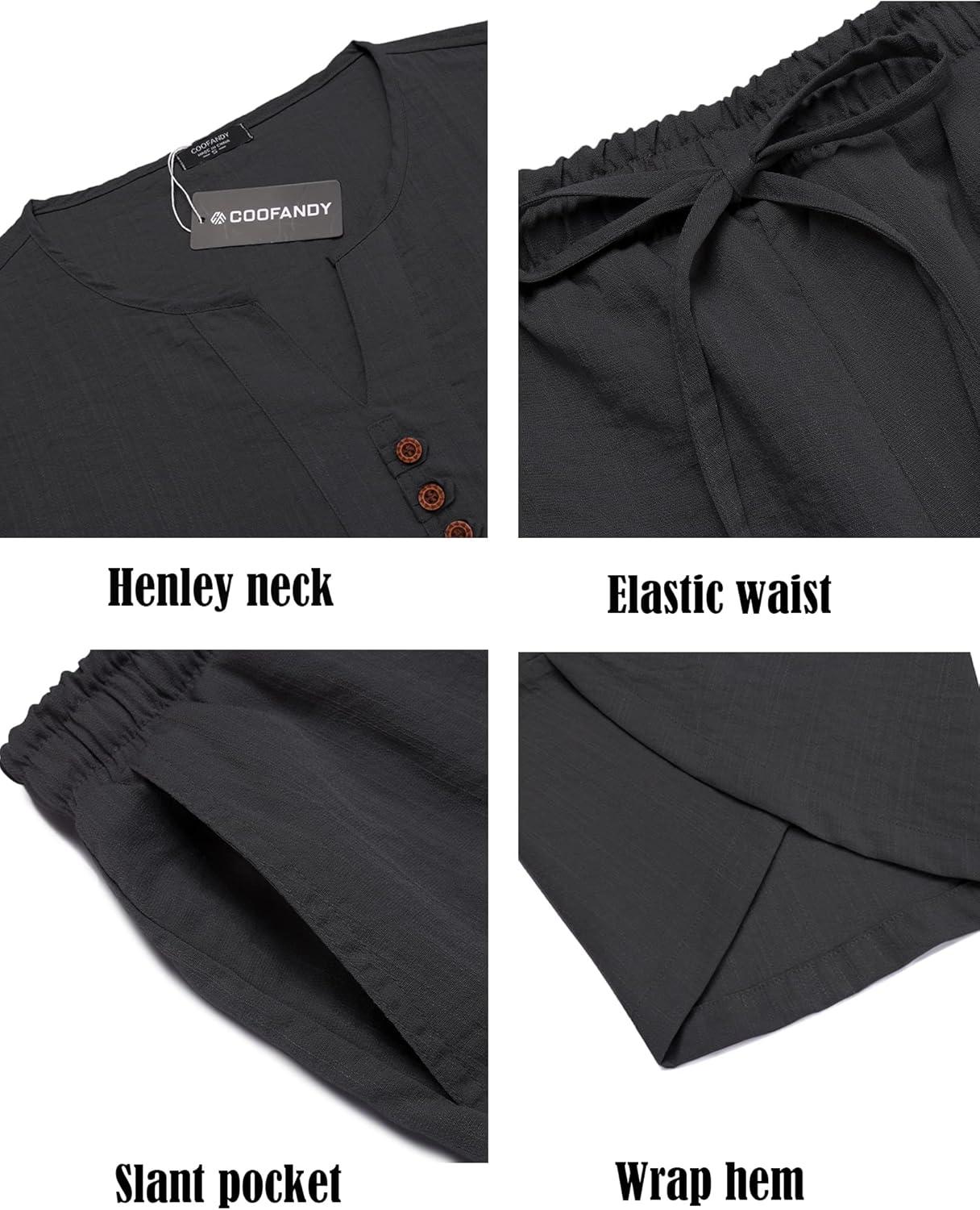 COOFANDY Men’s 2 Piece Cotton Linen Sets Summer Beach Outfits Casual Short Sleeve Henley Shirts and Vacation Shorts(Black)