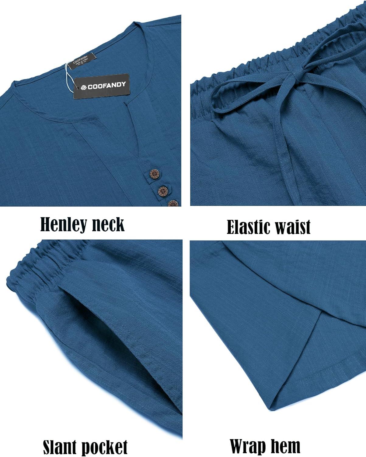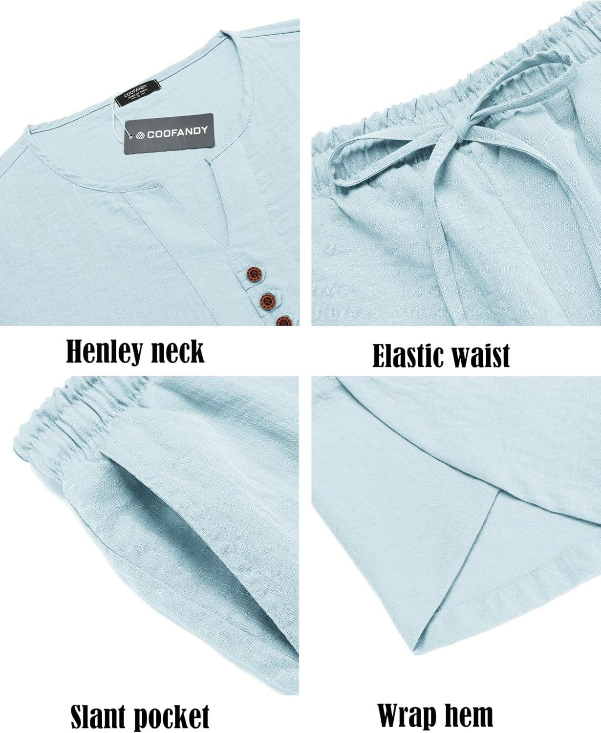 COOFANDY Men’s 2 Piece Cotton Linen Sets Summer Beach Outfits Casual Short Sleeve Henley Shirts and Vacation Shorts(Blue)