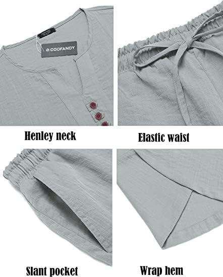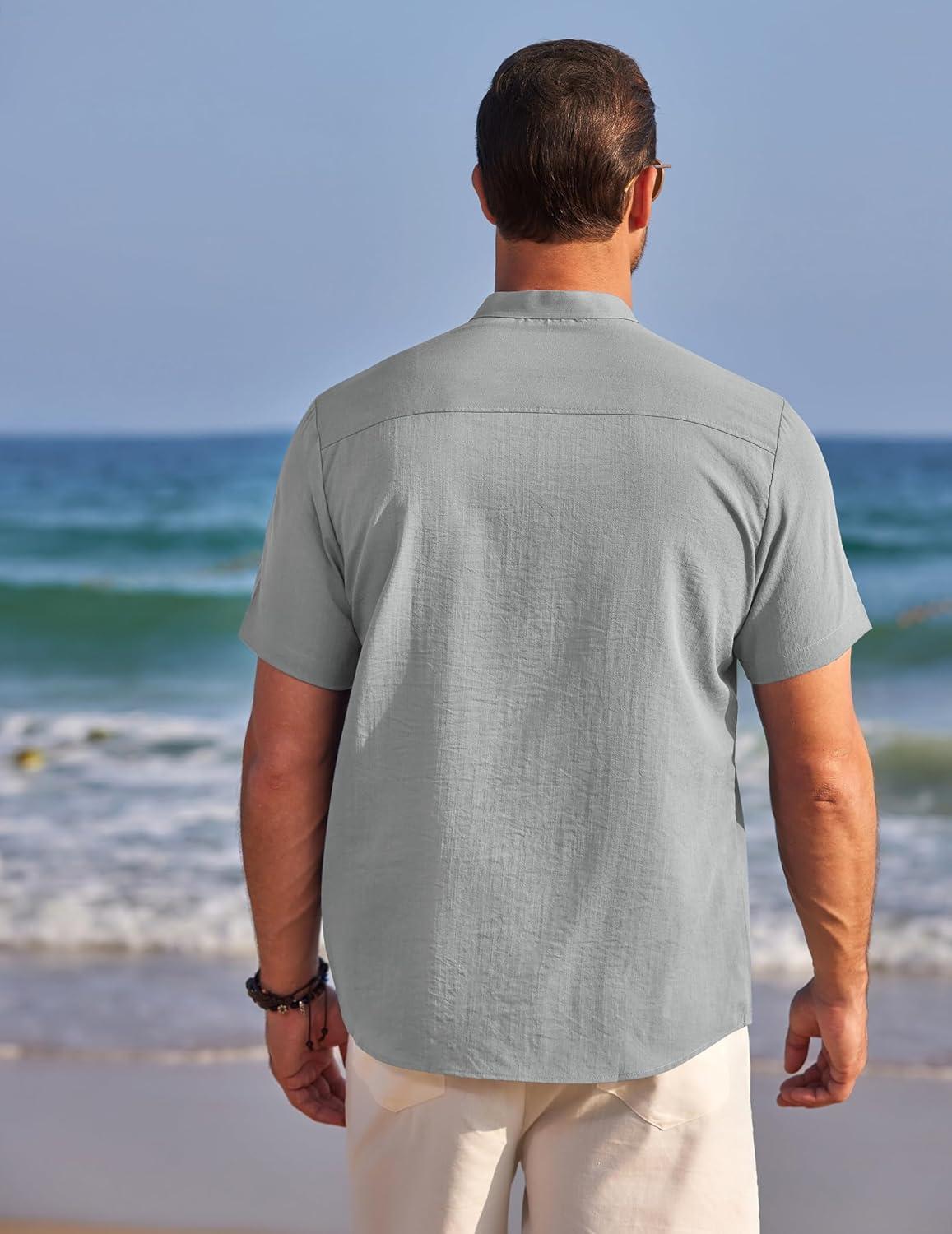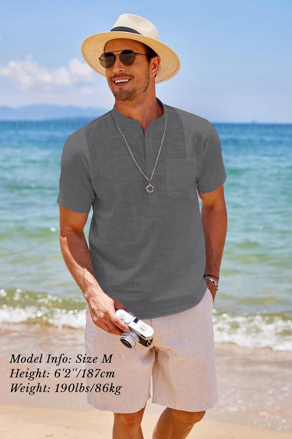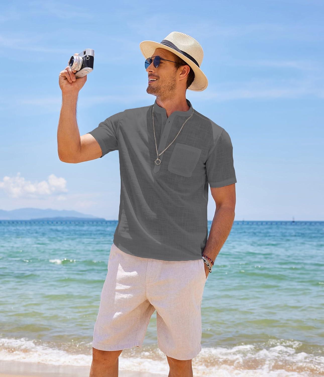 COOFANDY Men’s 2 Piece Cotton Linen Sets Summer Beach Outfits Casual Short Sleeve Henley Shirts and Vacation Shorts(Grey)