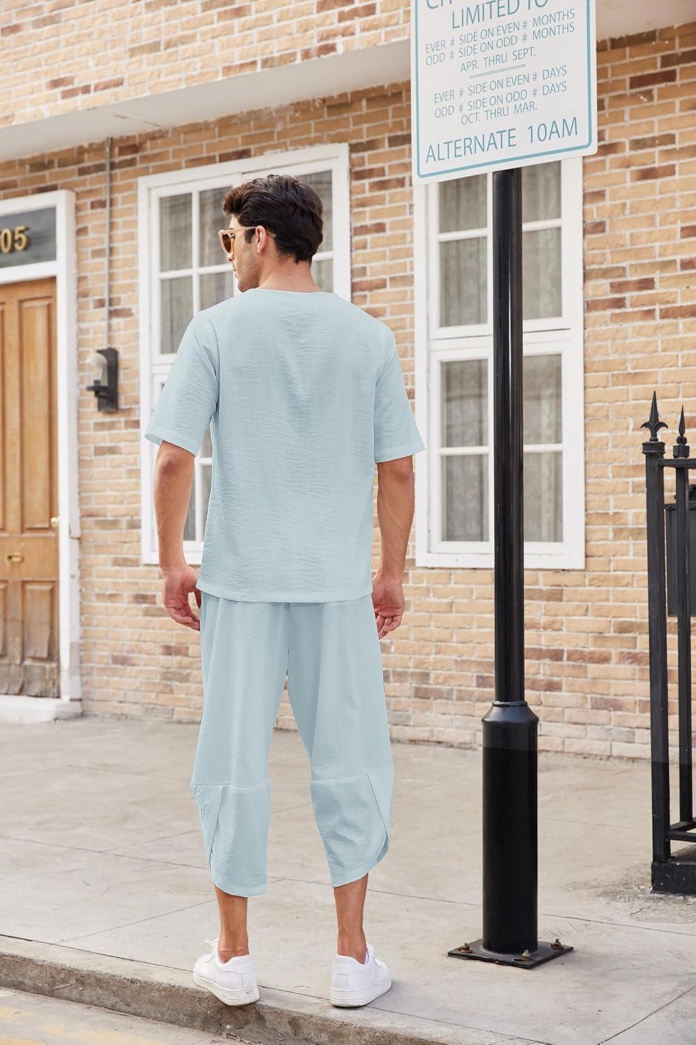 COOFANDY Men’s 2 Pieces Linen Set Henley Shirt Short Sleeve and Harem Capri Pants Wide Leg Baggy Beach Yoga Trousers Outfits(Light Blue)