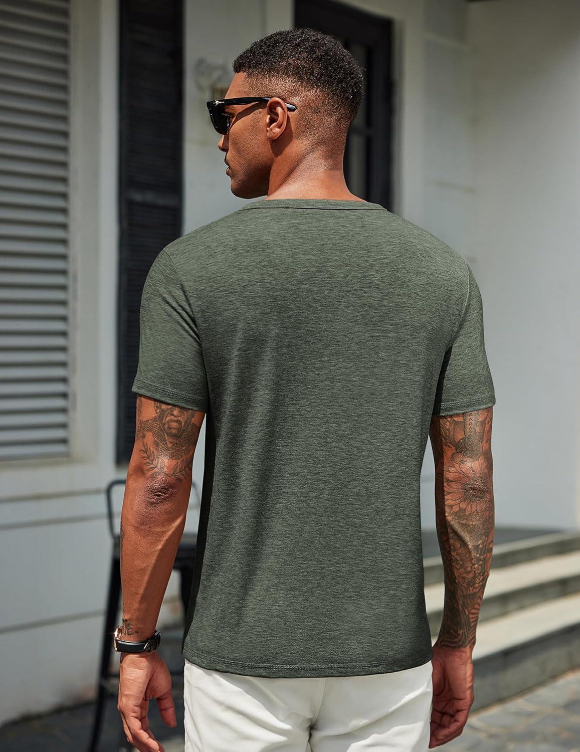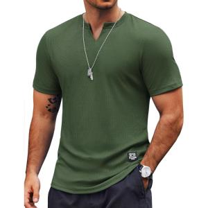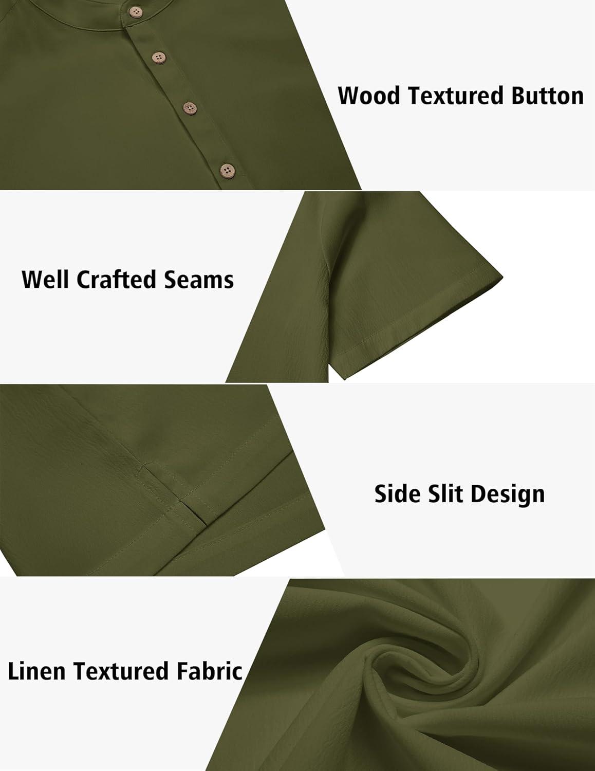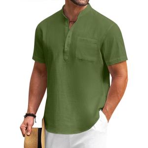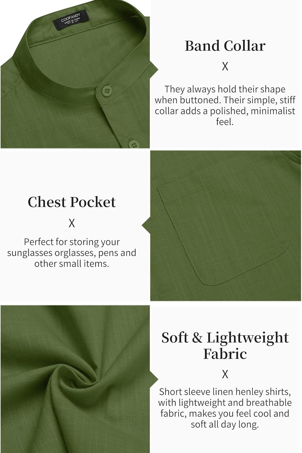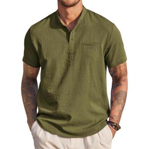 COOFANDY Men Casual Henley Tee Shirt Short Sleeve Band Collar Summer Beach Textured T-Shirt(Army Green)