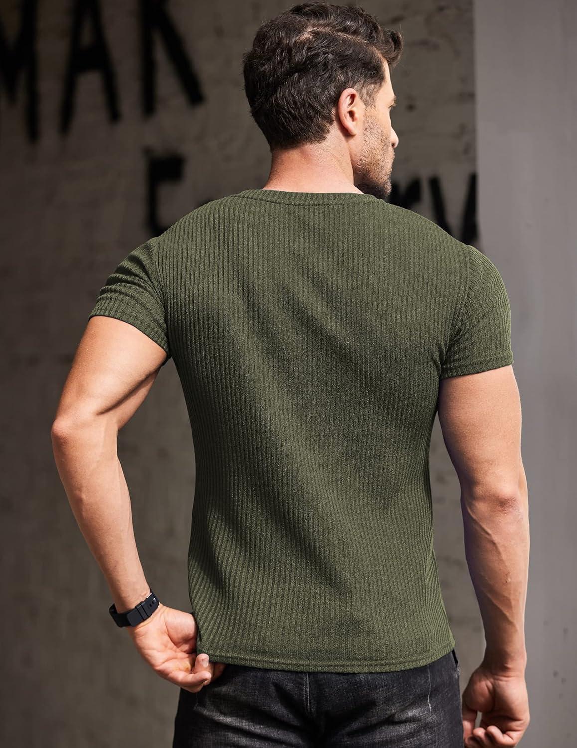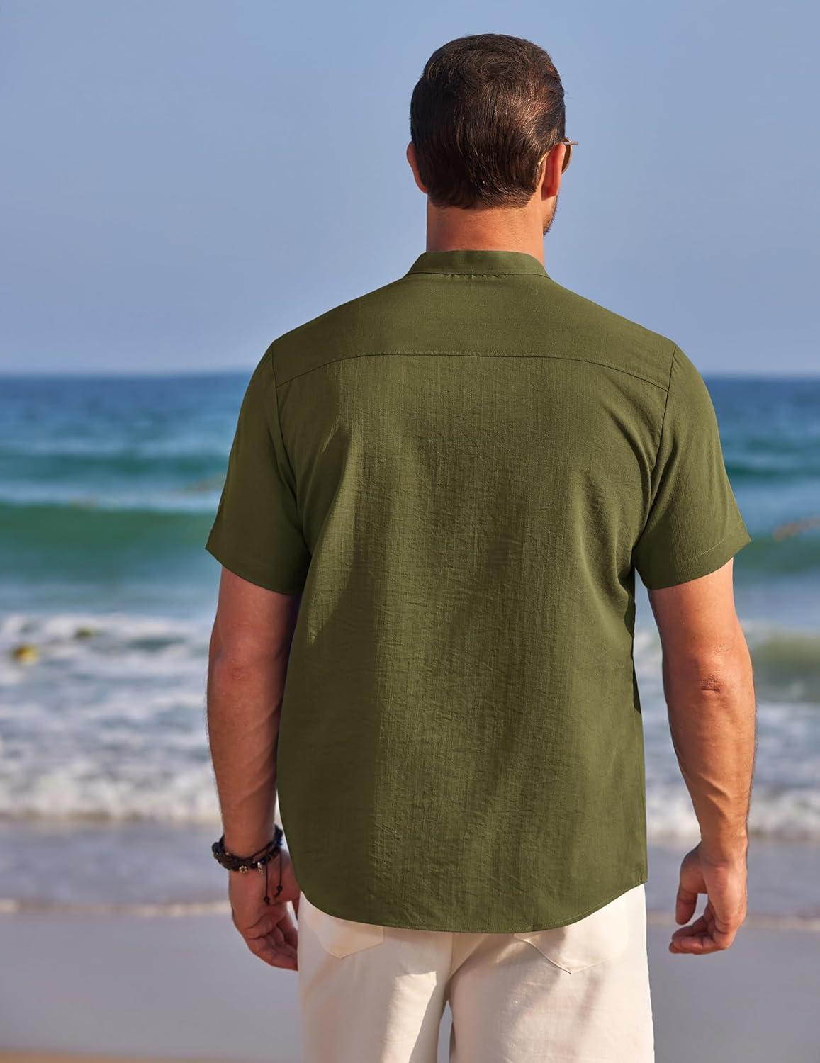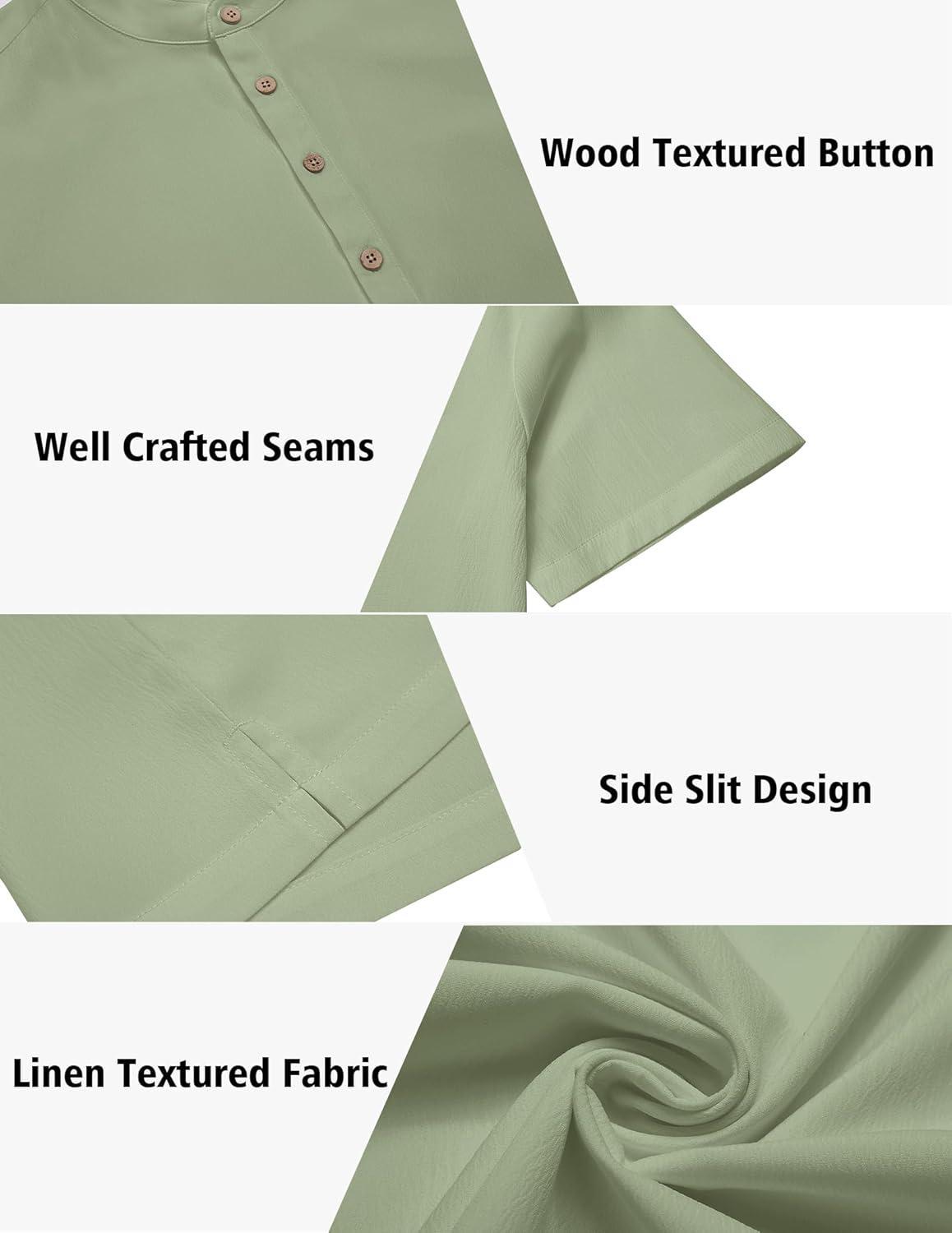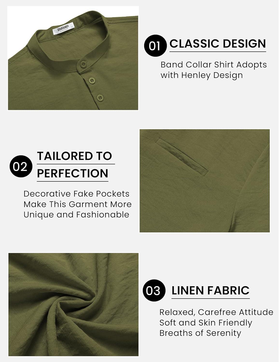 COOFANDY Men Casual Henley Tee Shirt Short Sleeve Band Collar Summer Beach Textured T-Shirt(Army Green)