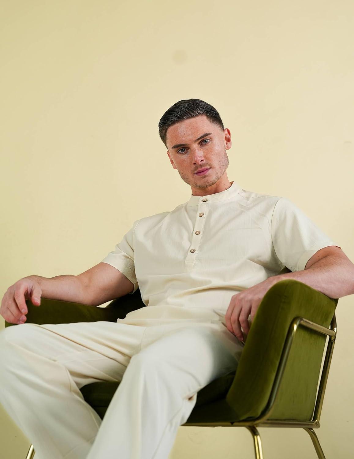 COOFANDY Men Casual Henley Tee Shirt Short Sleeve Band Collar Summer Beach Textured T-Shirt(Cream Color)