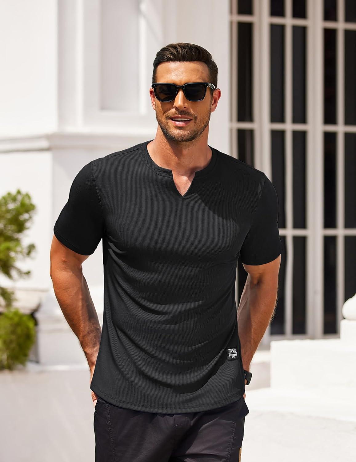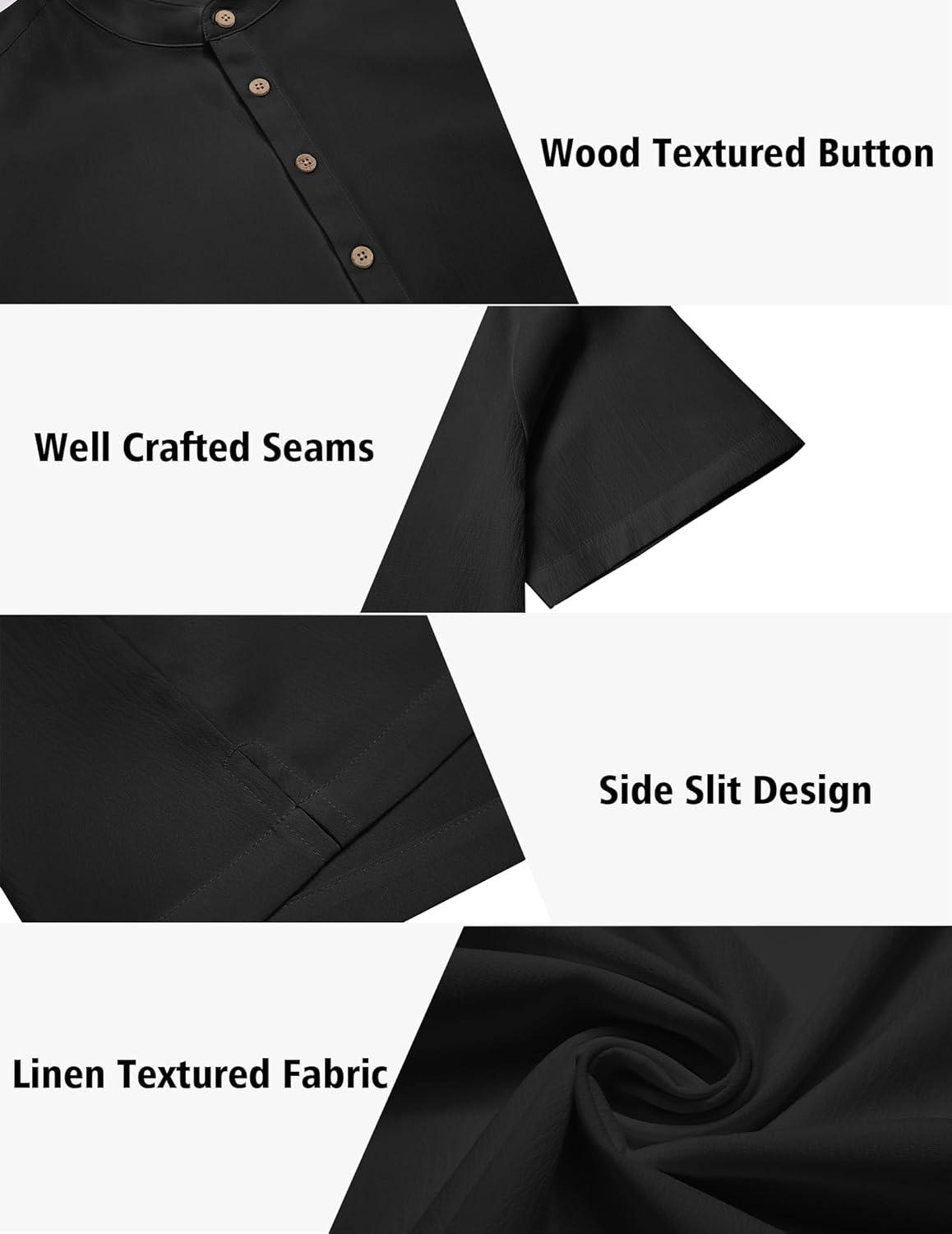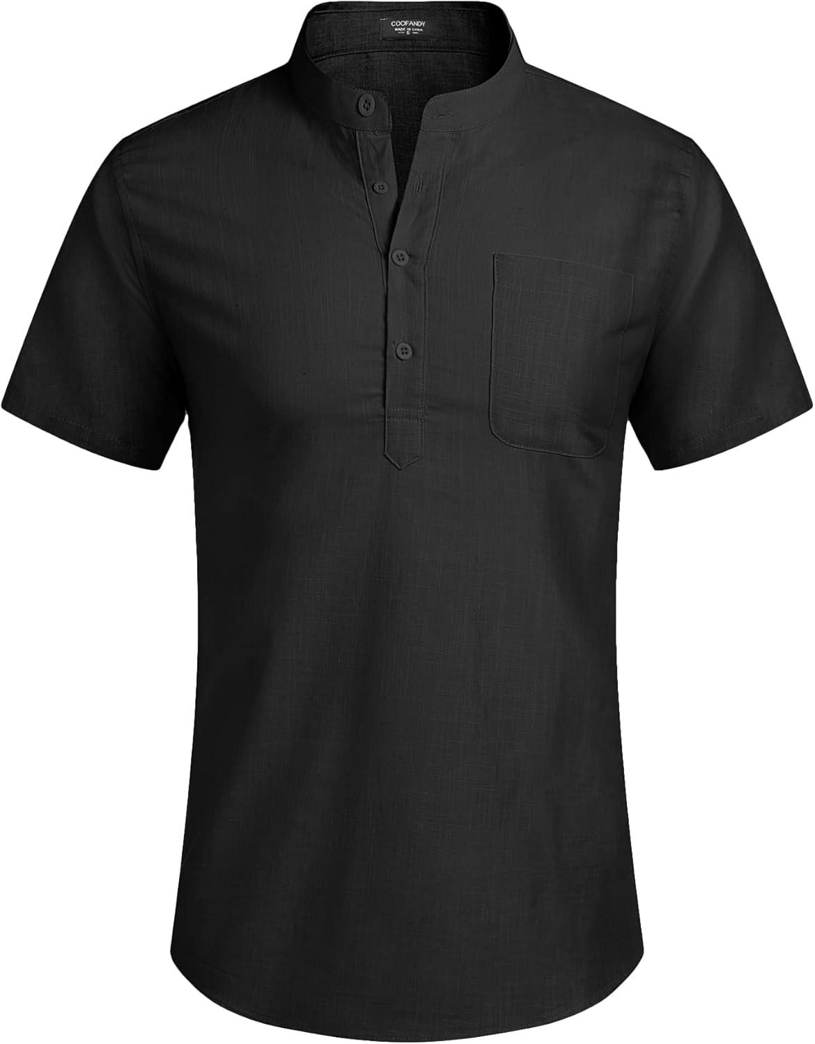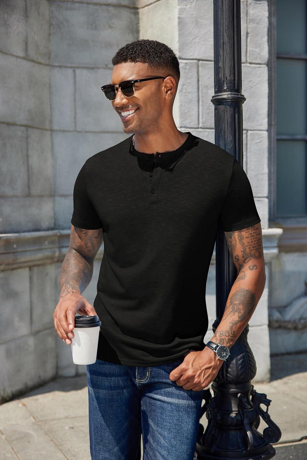 COOFANDY Men Casual Henley Tee Shirt Short Sleeve Band Collar Summer Beach Textured T-Shirt(Black)
