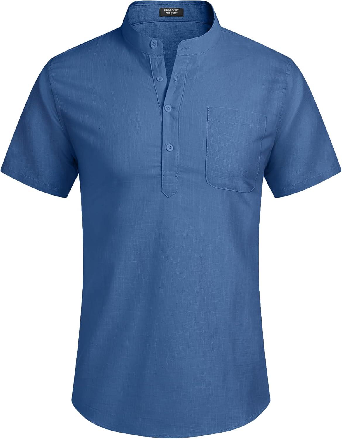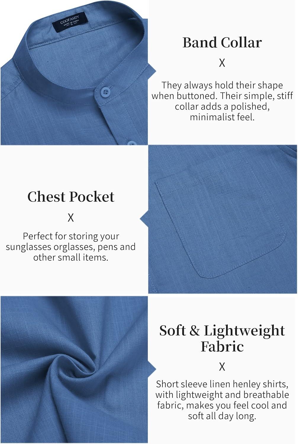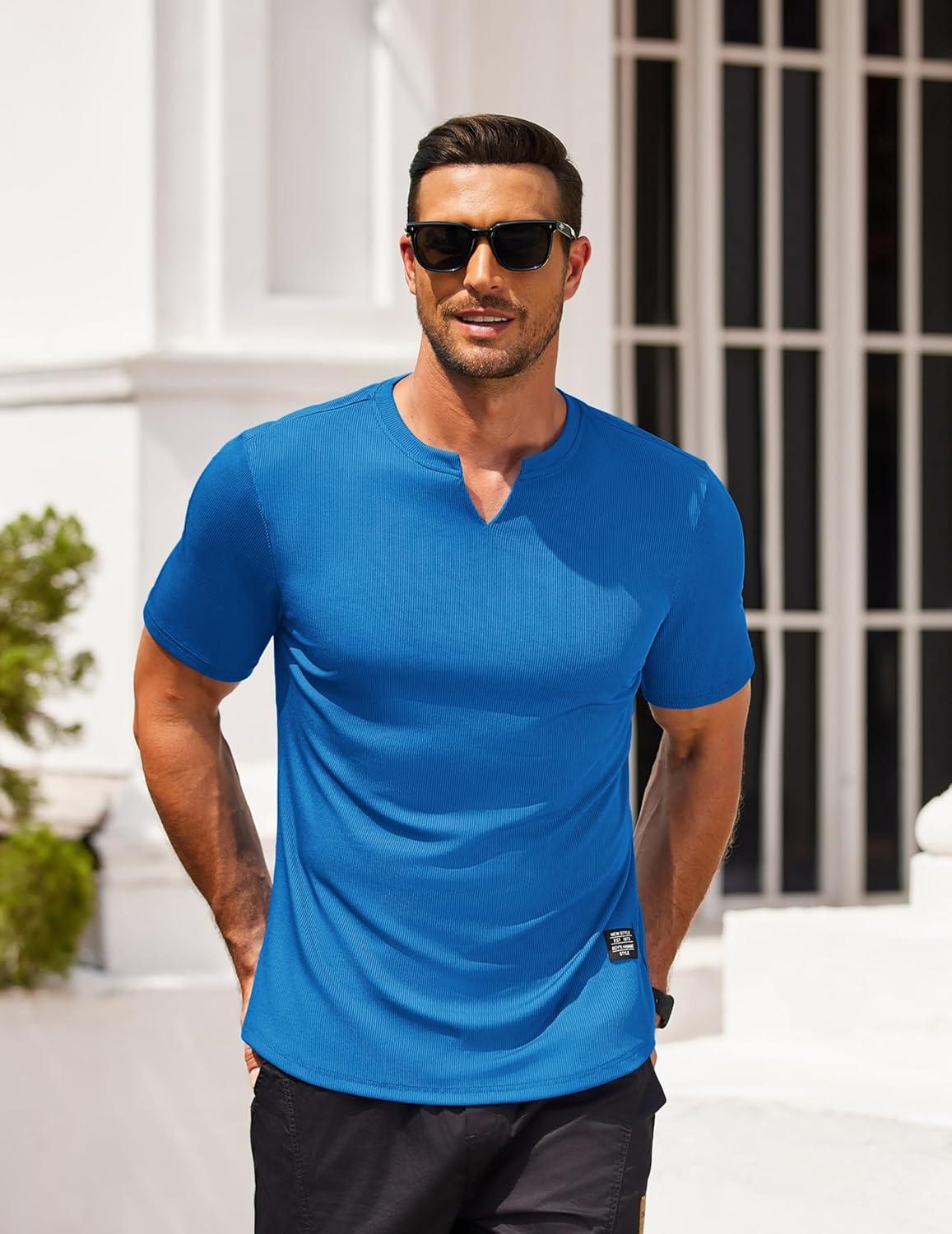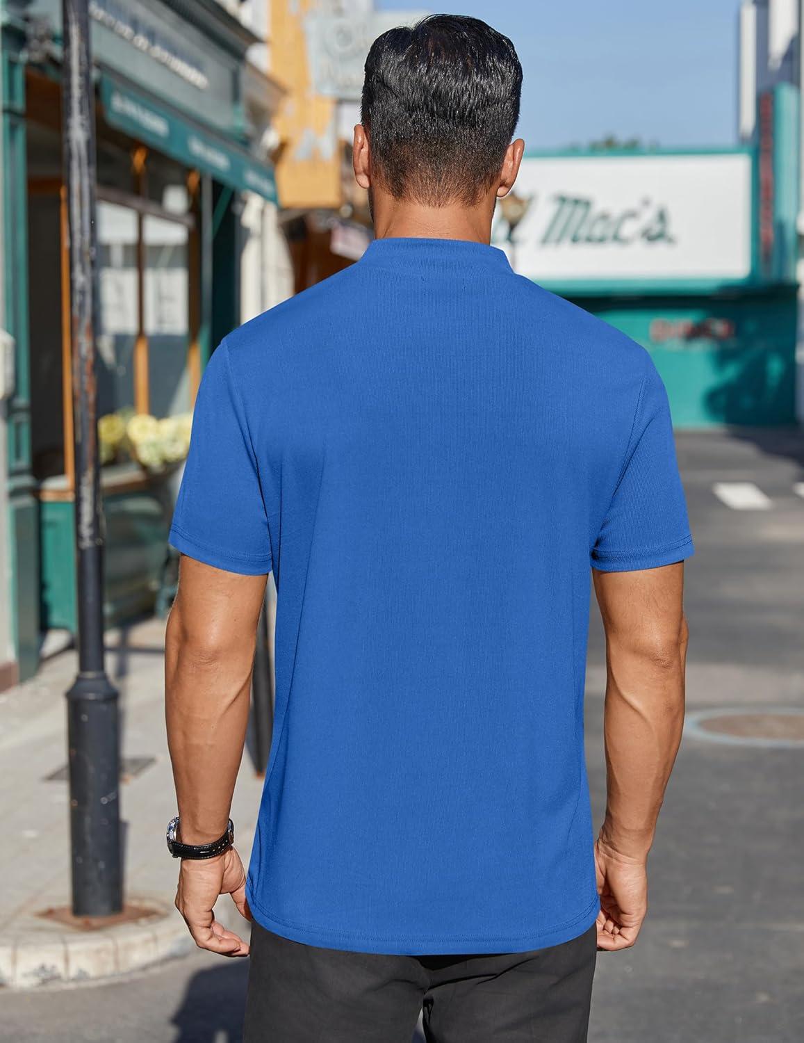 COOFANDY Men Casual Henley Tee Shirt Short Sleeve Band Collar Summer Beach Textured T-Shirt(Blue)