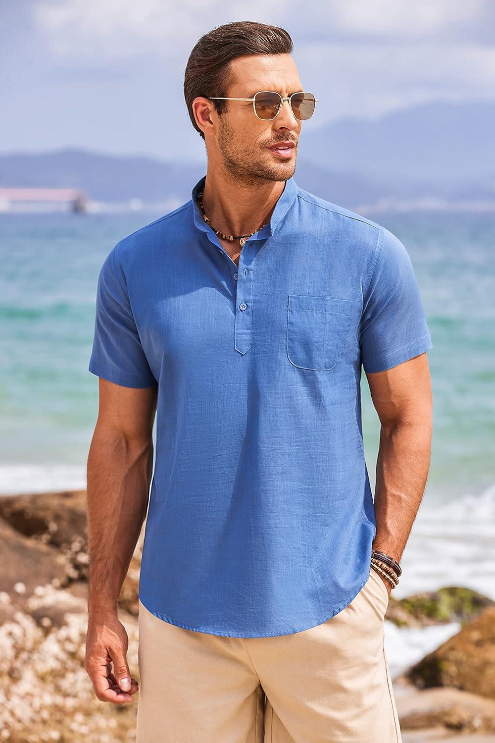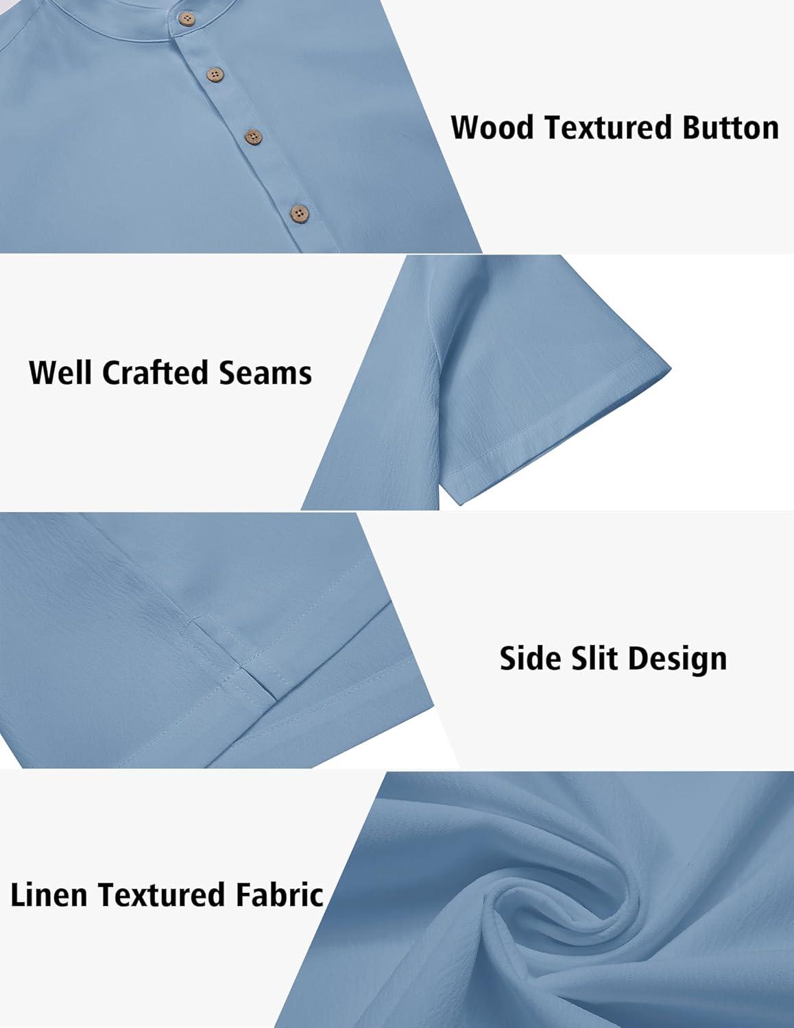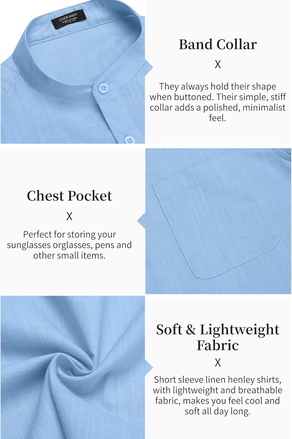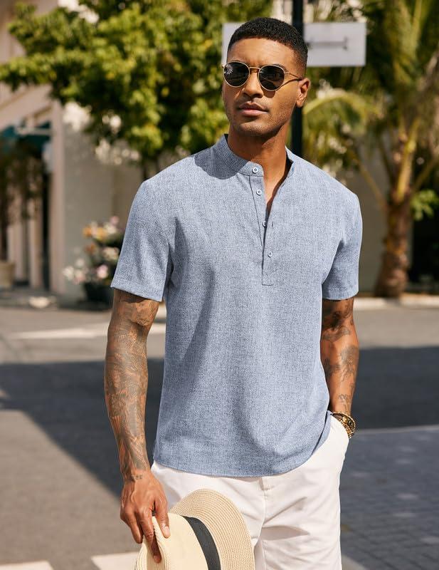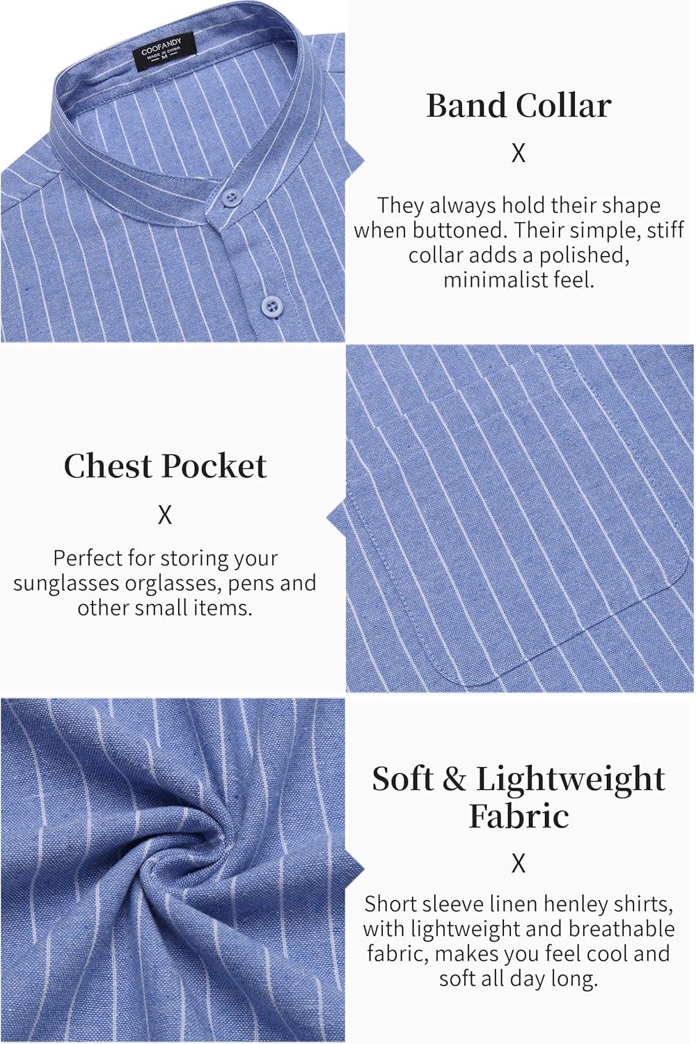 COOFANDY Men Casual Henley Tee Shirt Short Sleeve Band Collar Summer Beach Textured T-Shirt(Blue)