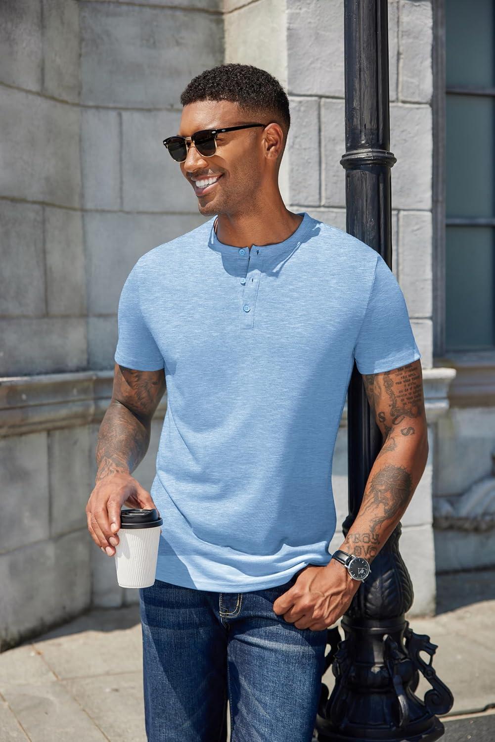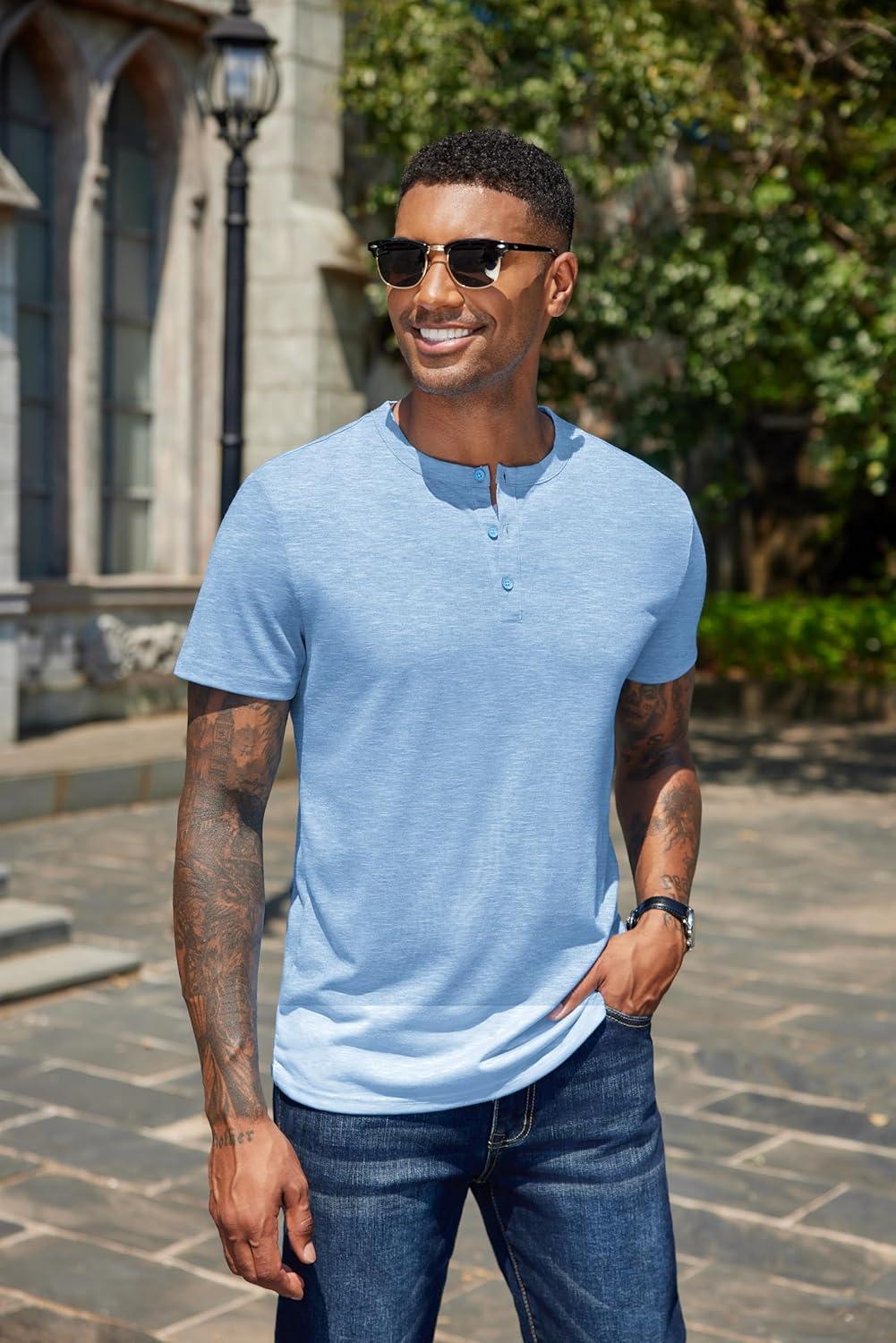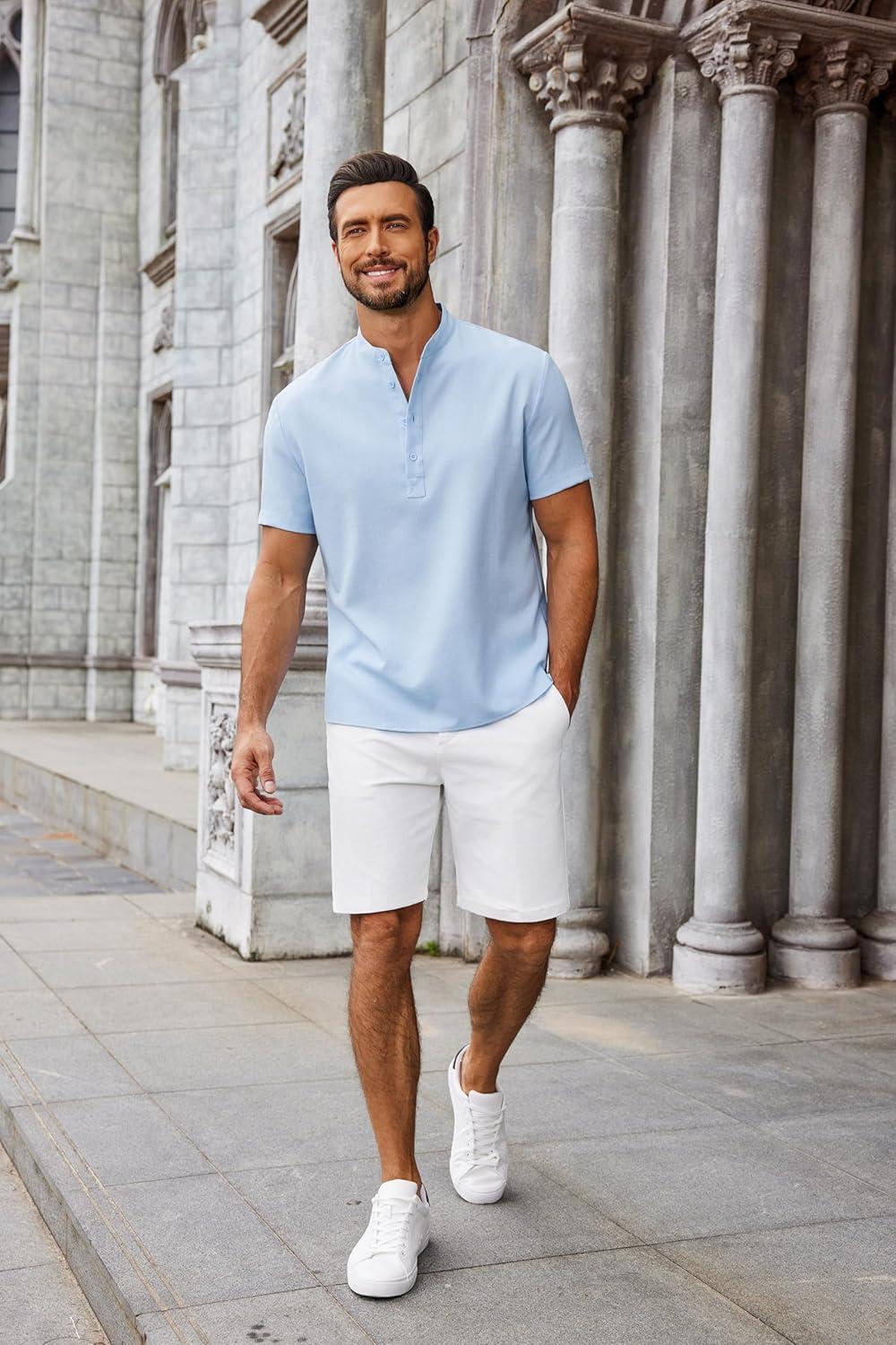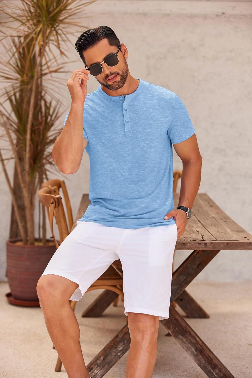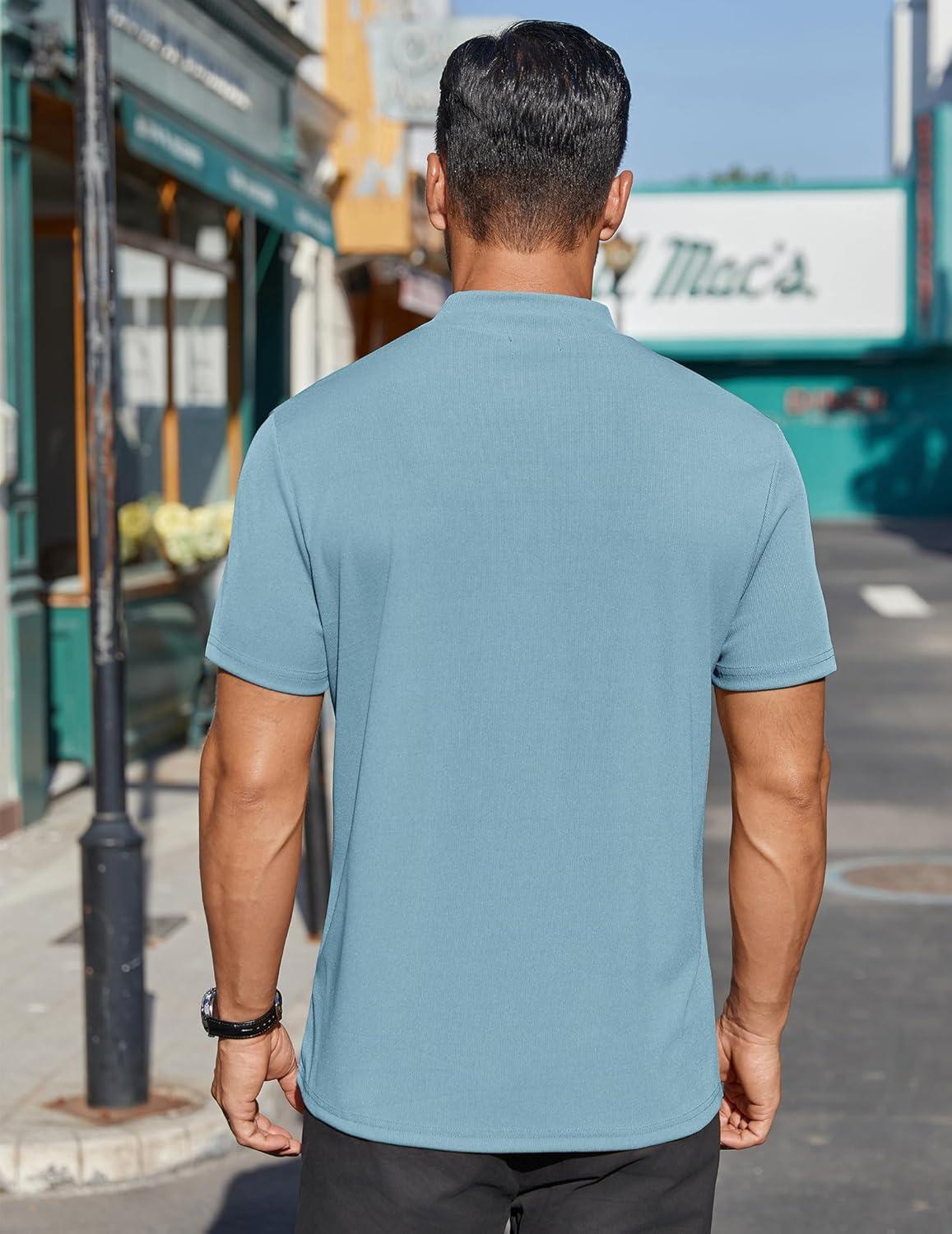 COOFANDY Men Casual Henley Tee Shirt Short Sleeve Band Collar Summer Beach Textured T-Shirt(Light Blue)