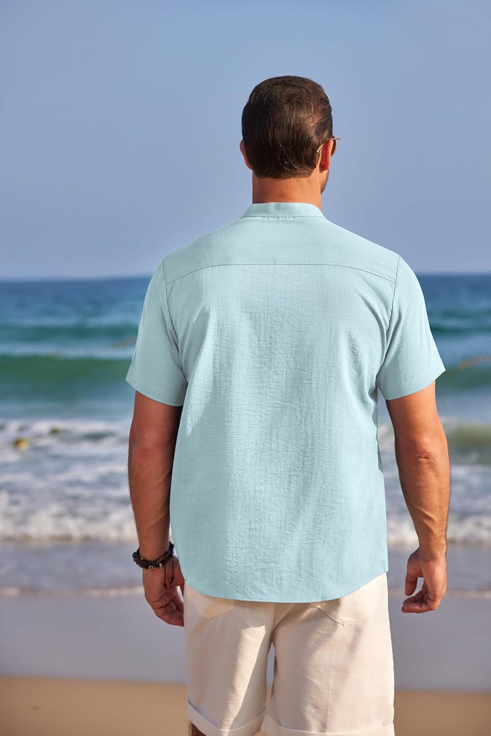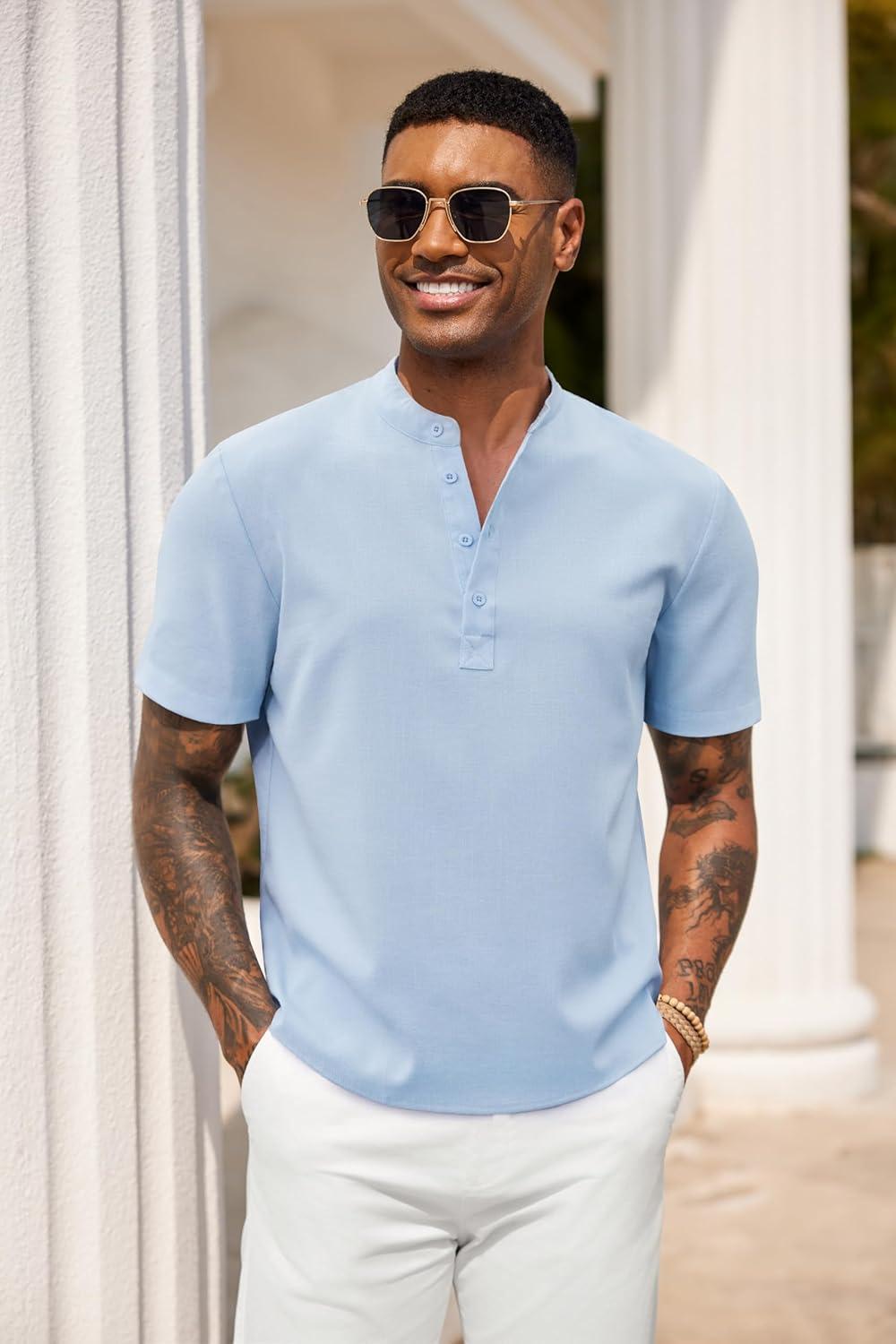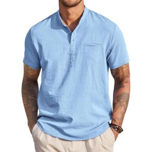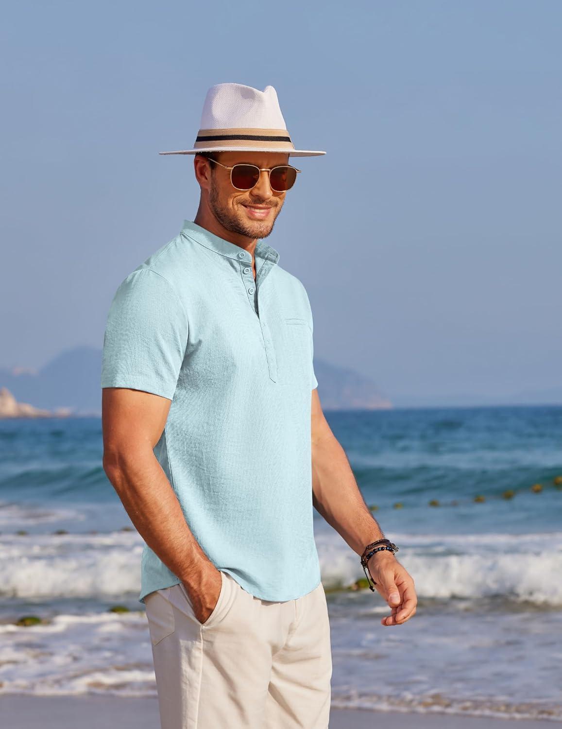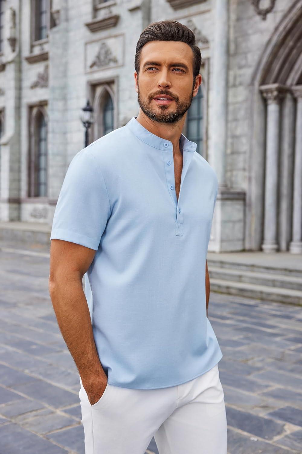 COOFANDY Men Casual Henley Tee Shirt Short Sleeve Band Collar Summer Beach Textured T-Shirt(Light Blue)