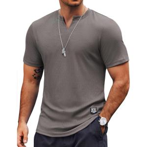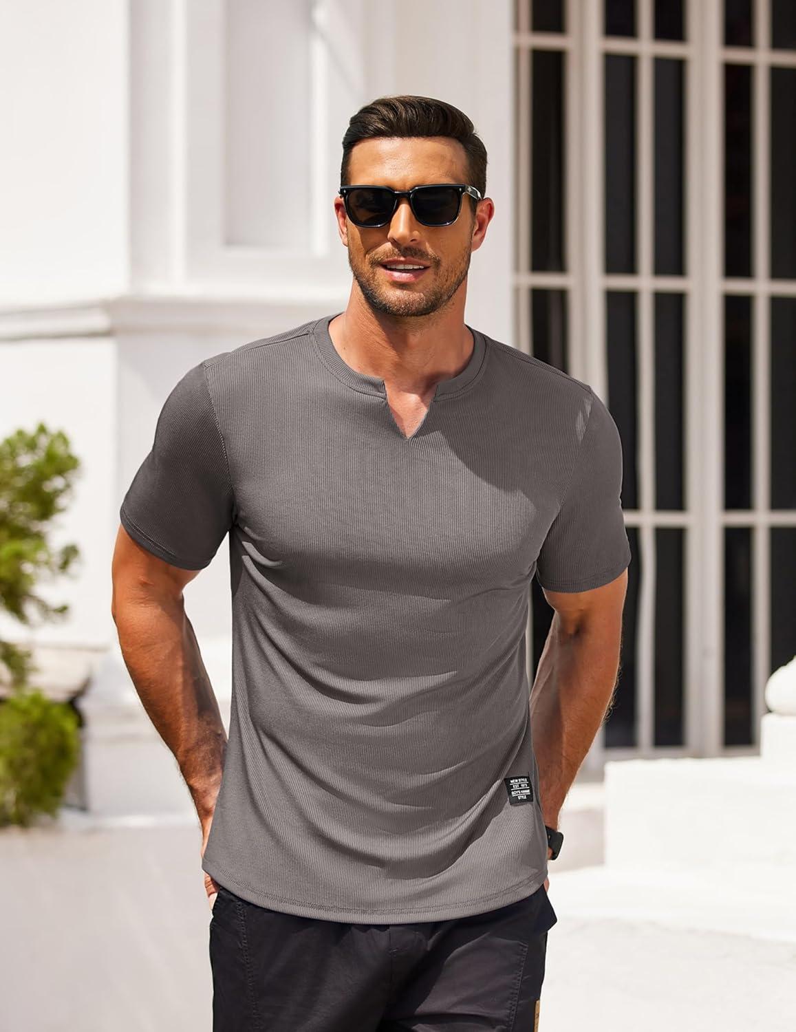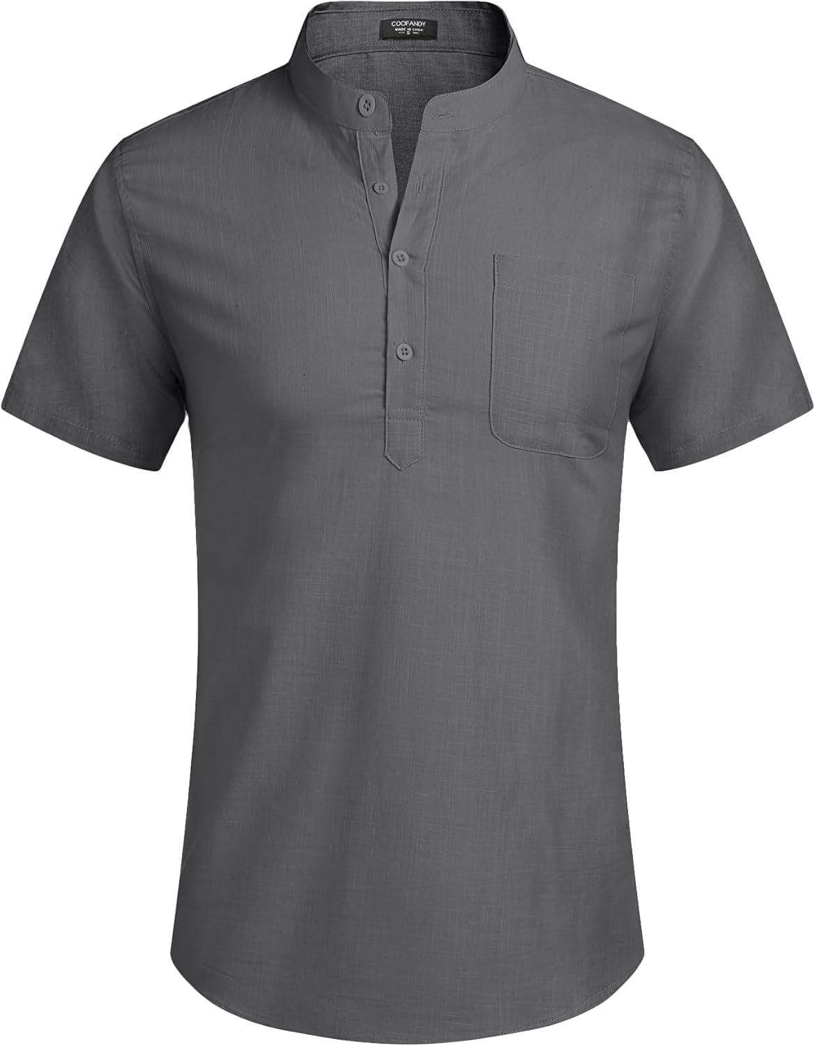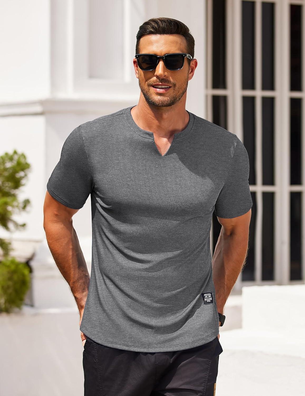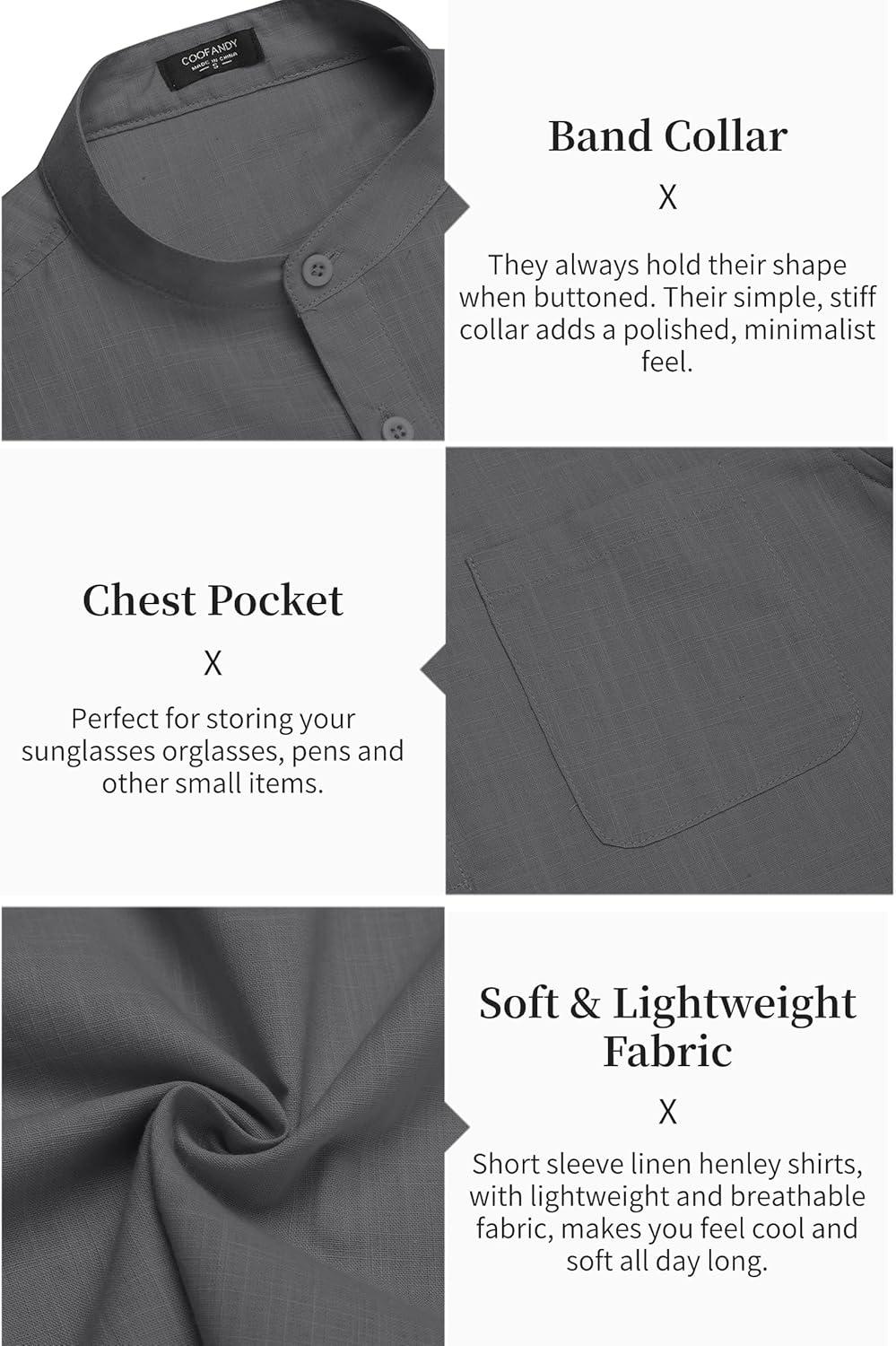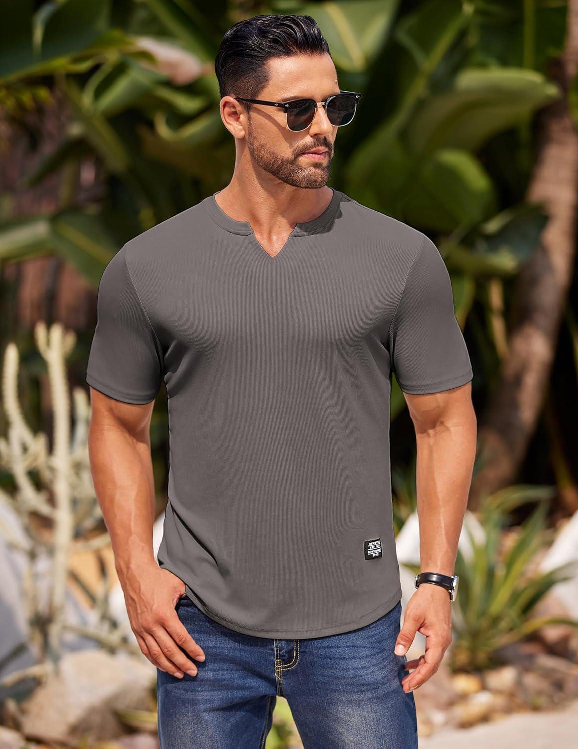 COOFANDY Men Casual Henley Tee Shirt Short Sleeve Band Collar Summer Beach Textured T-Shirt(Dark Grey)