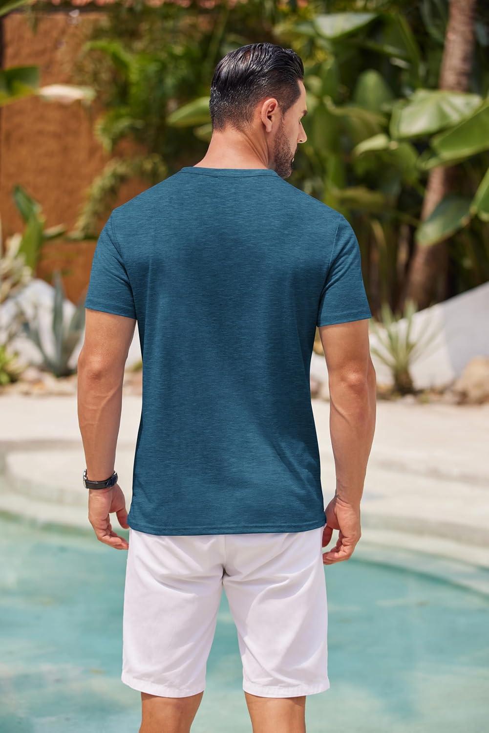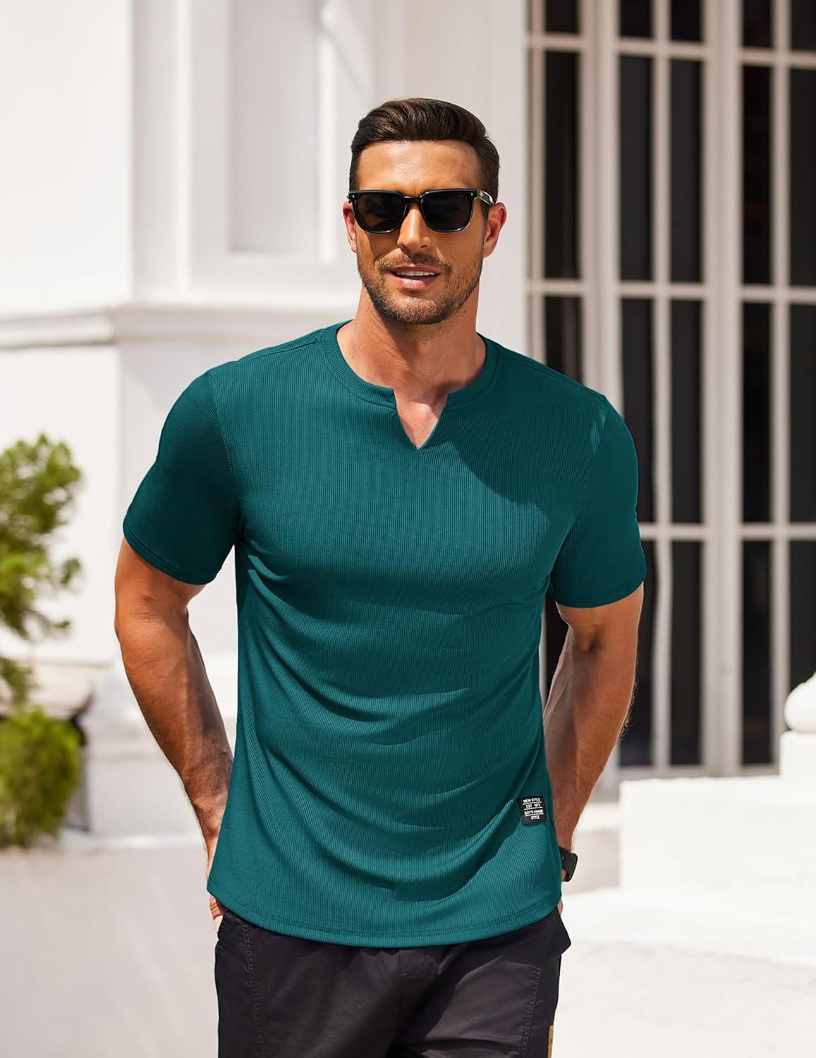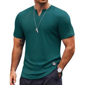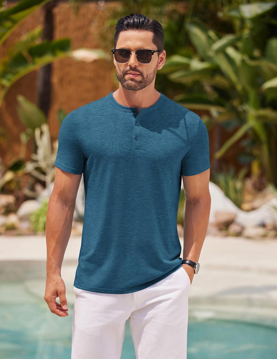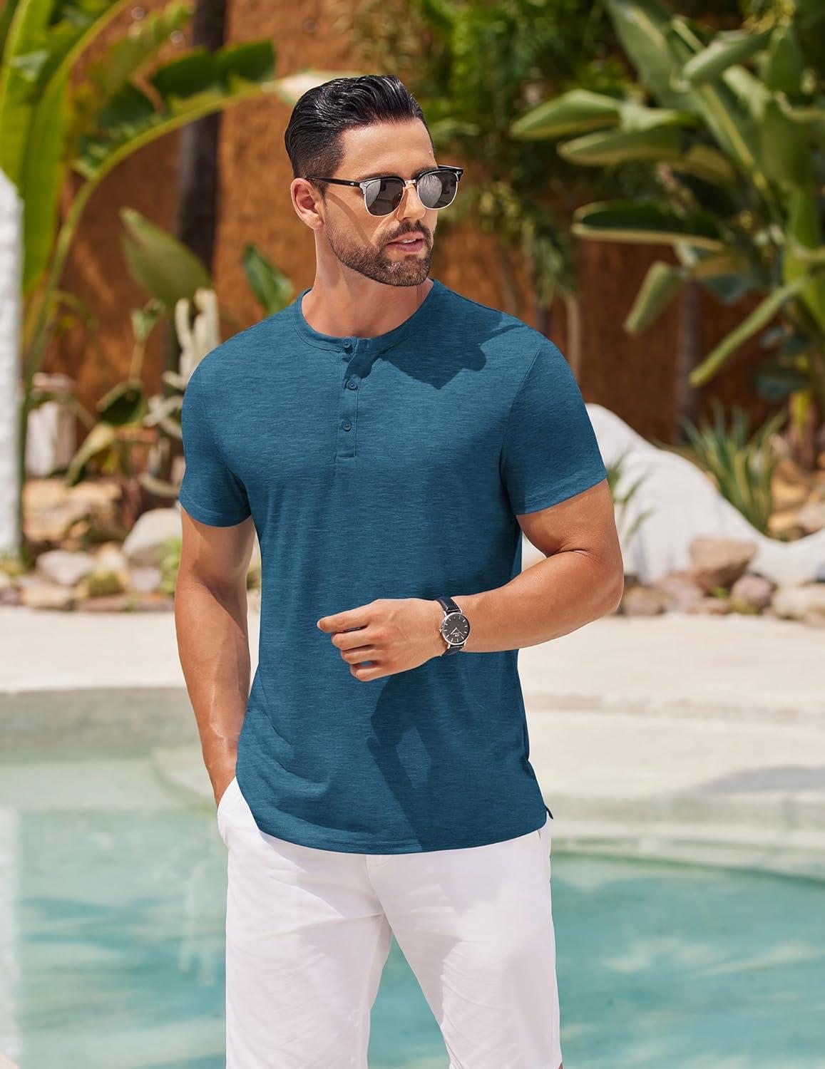 COOFANDY Men Casual Henley Tee Shirt Short Sleeve Band Collar Summer Beach Textured T-Shirt(Blue Green)