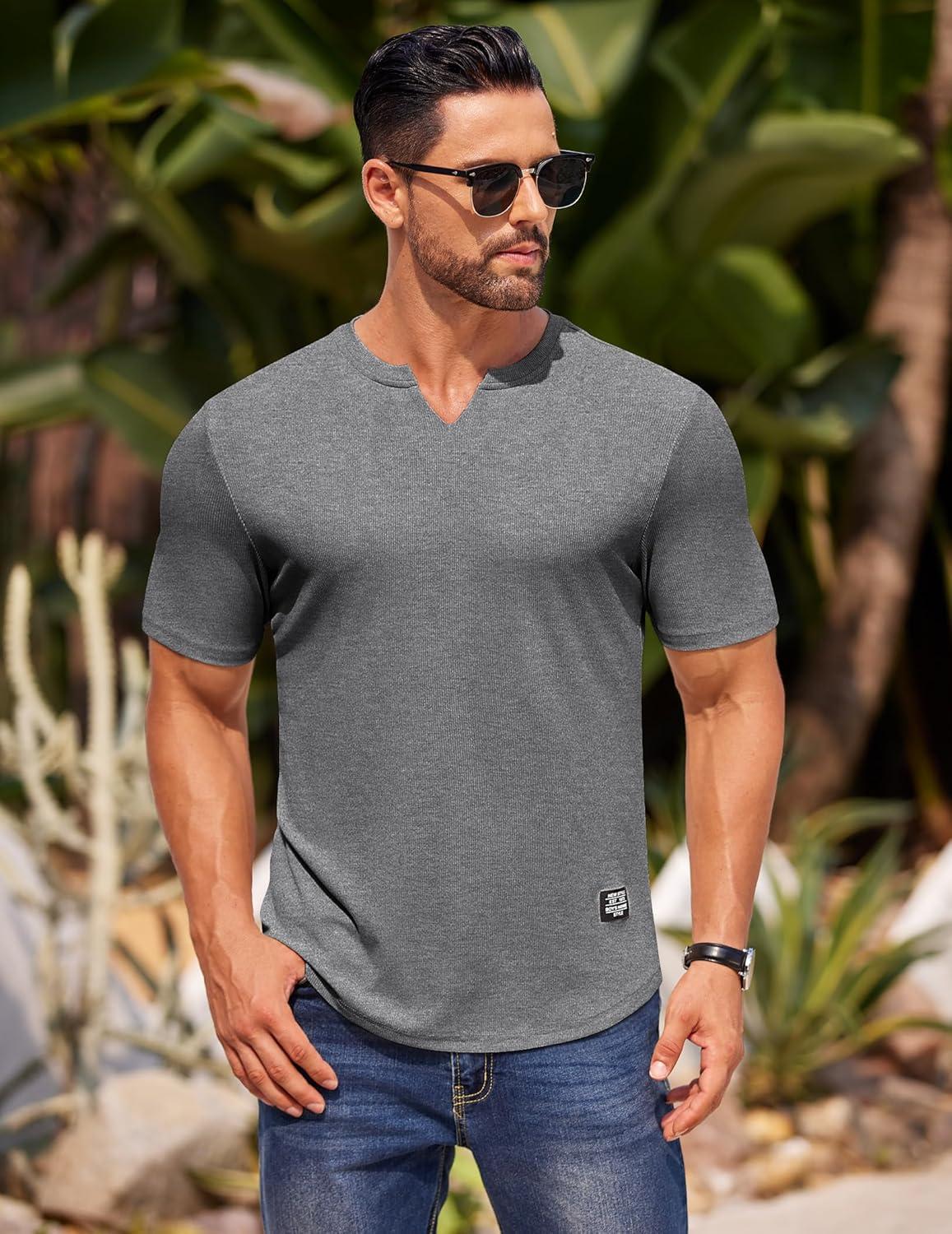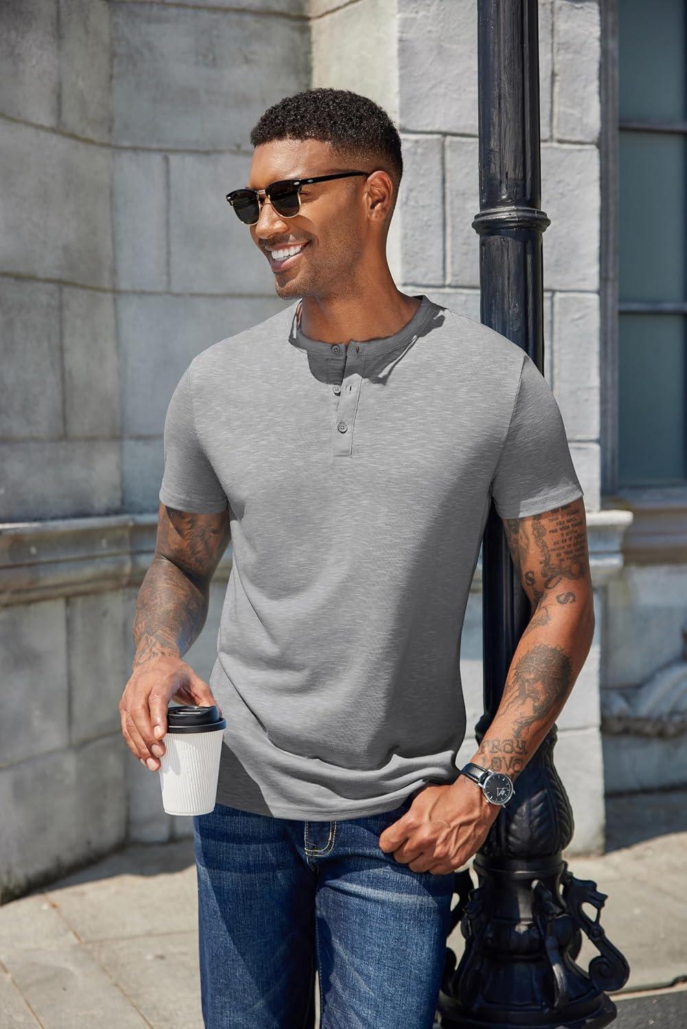 COOFANDY Mens Cotton Henley T-Shirts Short Sleeve Button Casual Basic Tees Work Shirts with Split Side(Light Gray)