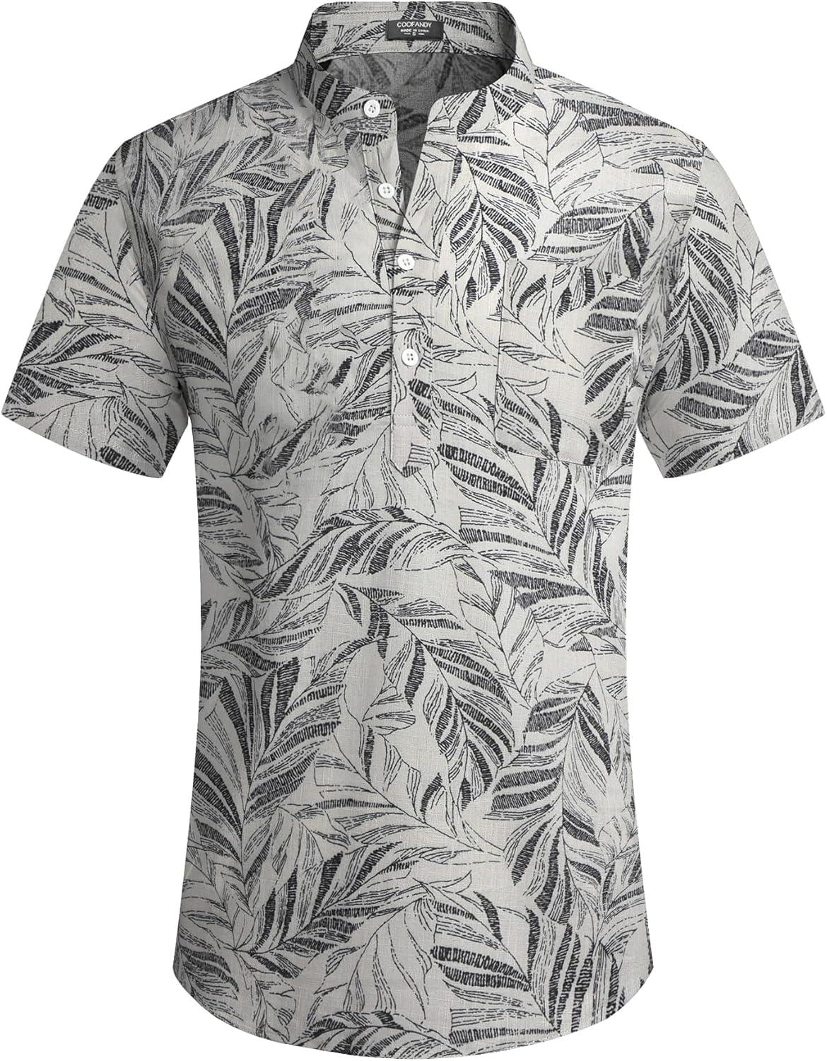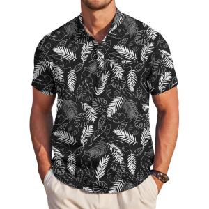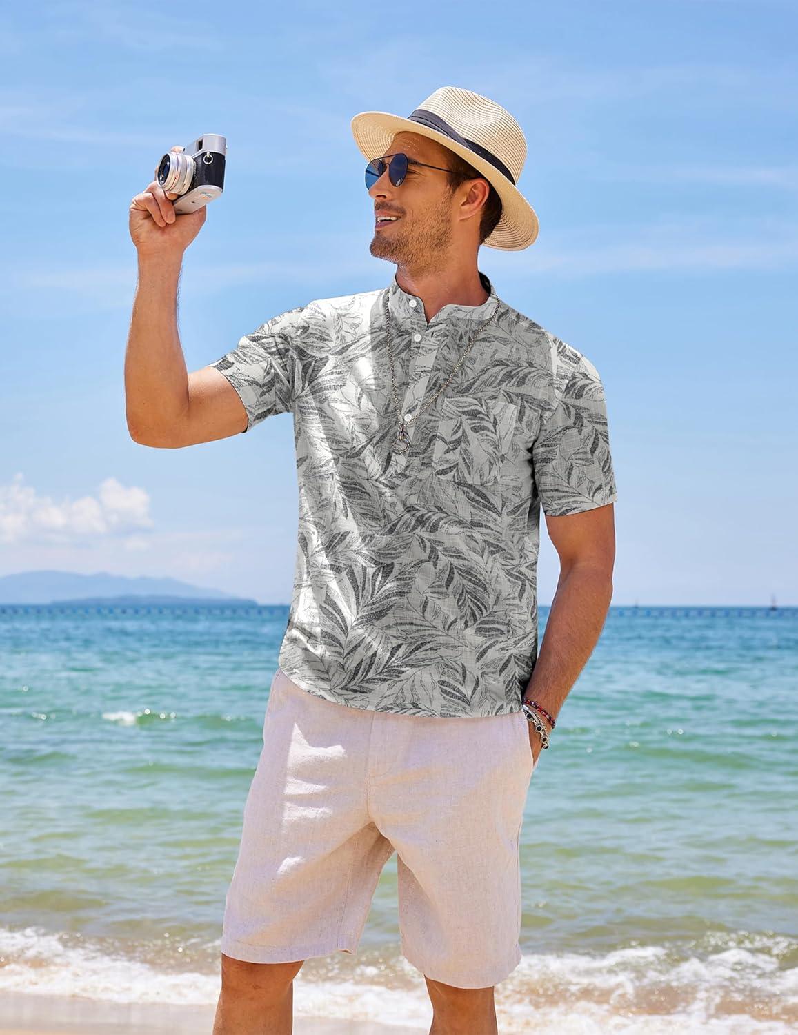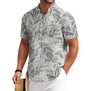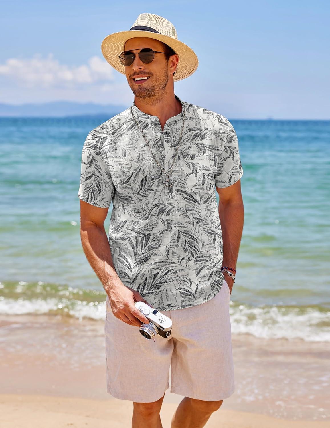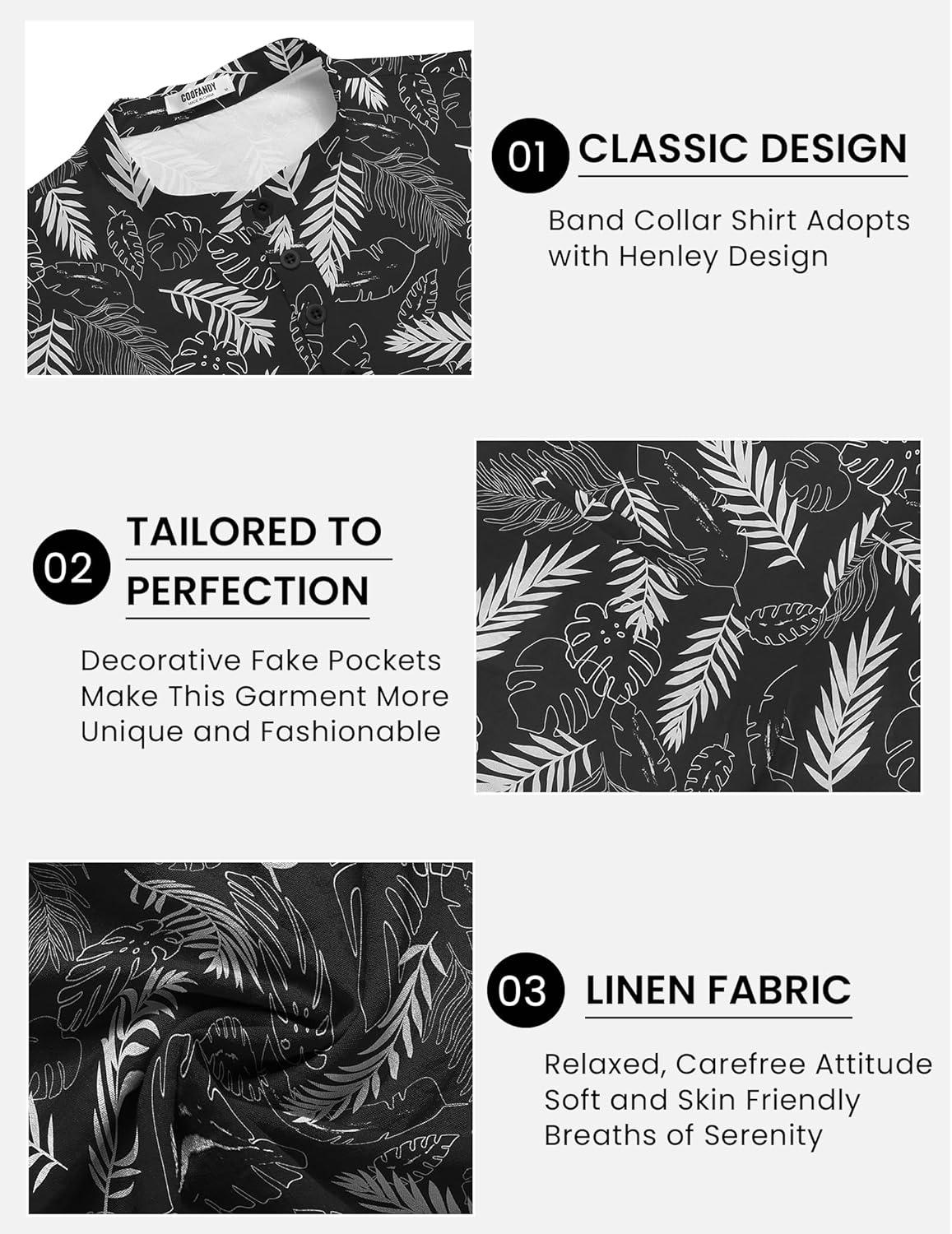 COOFANDY Men Casual Henley Tee Shirt Short Sleeve Band Collar Summer Beach Textured T-Shirt(Beige Black Leaves)