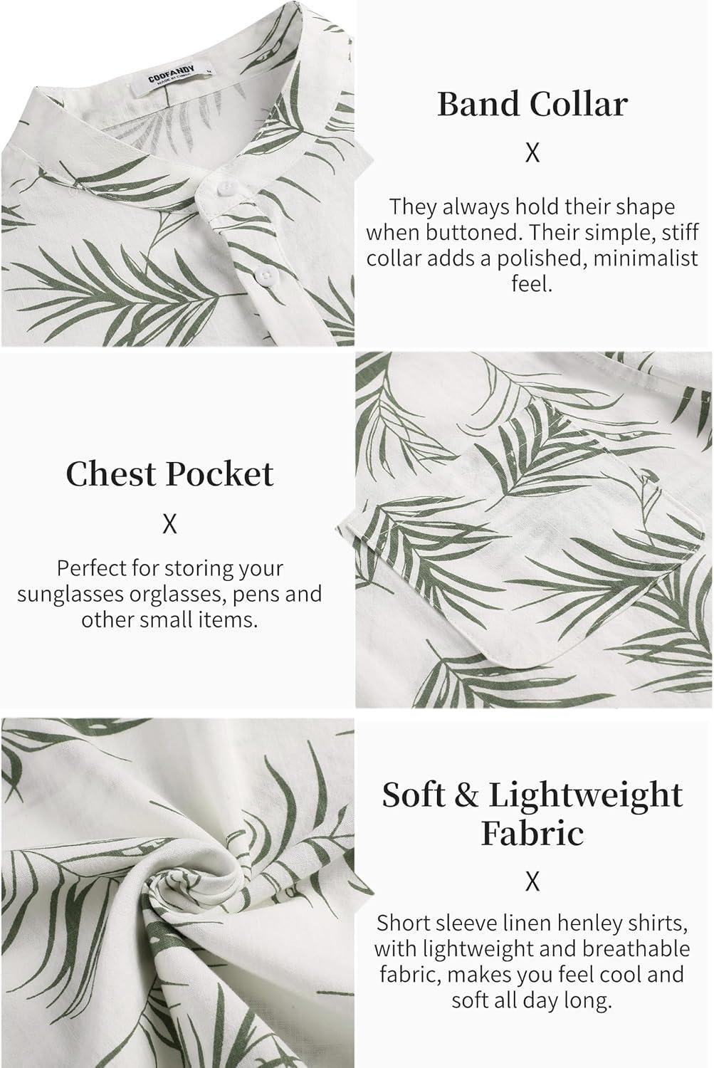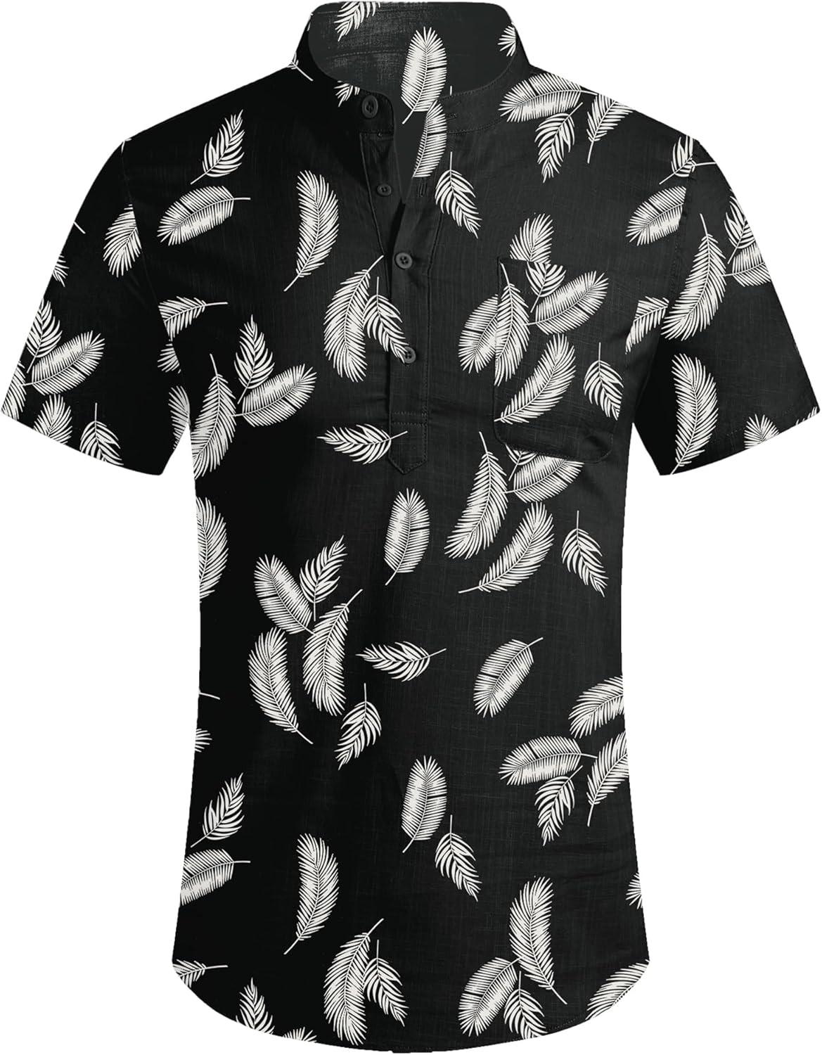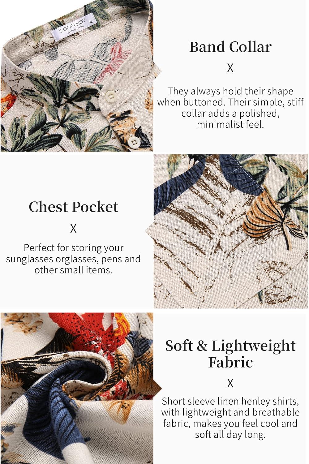 COOFANDY Men Casual Henley Tee Shirt Short Sleeve Band Collar Summer Beach Textured T-Shirt(Beige Black Leaves)