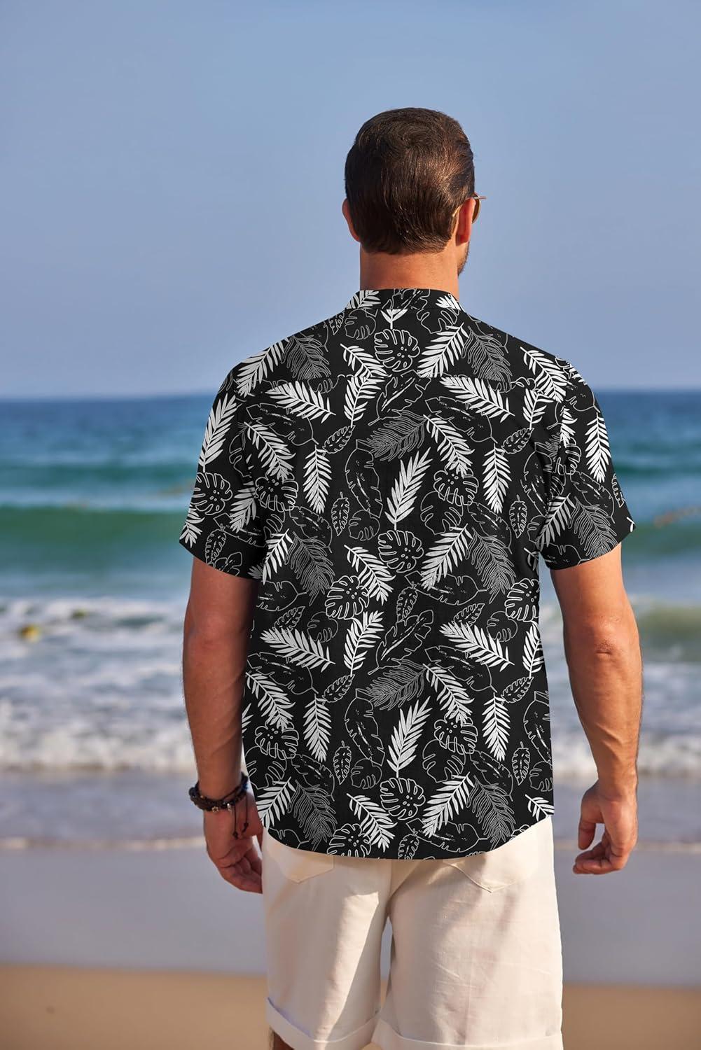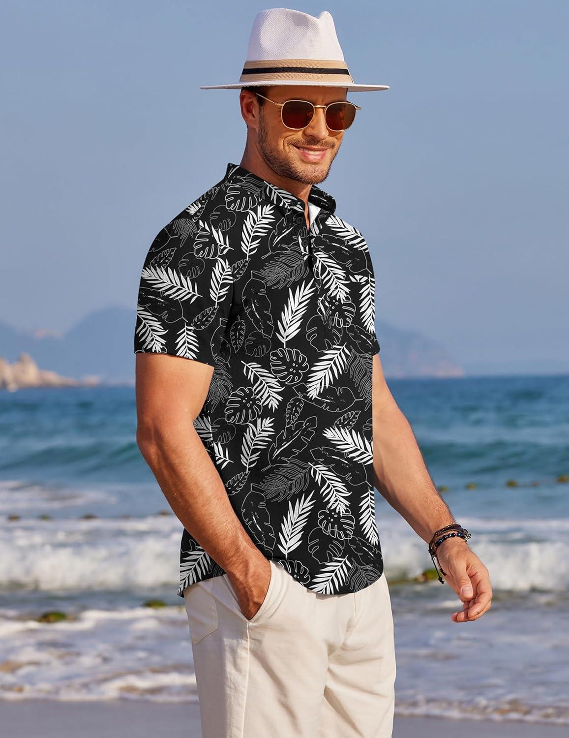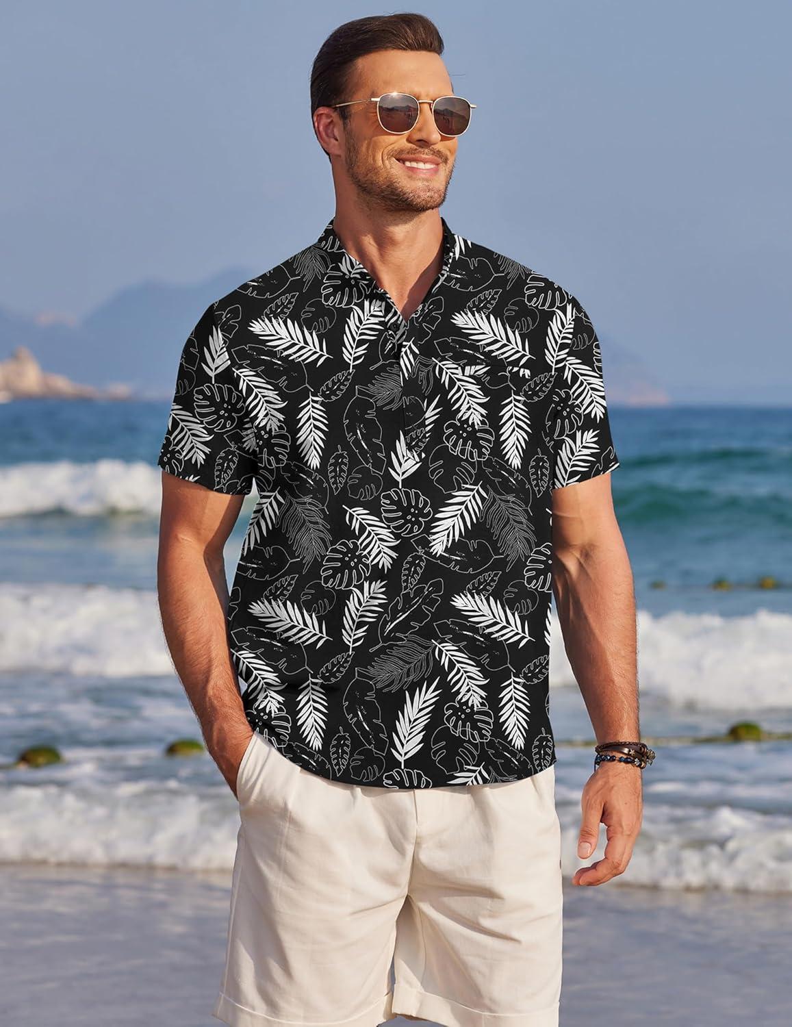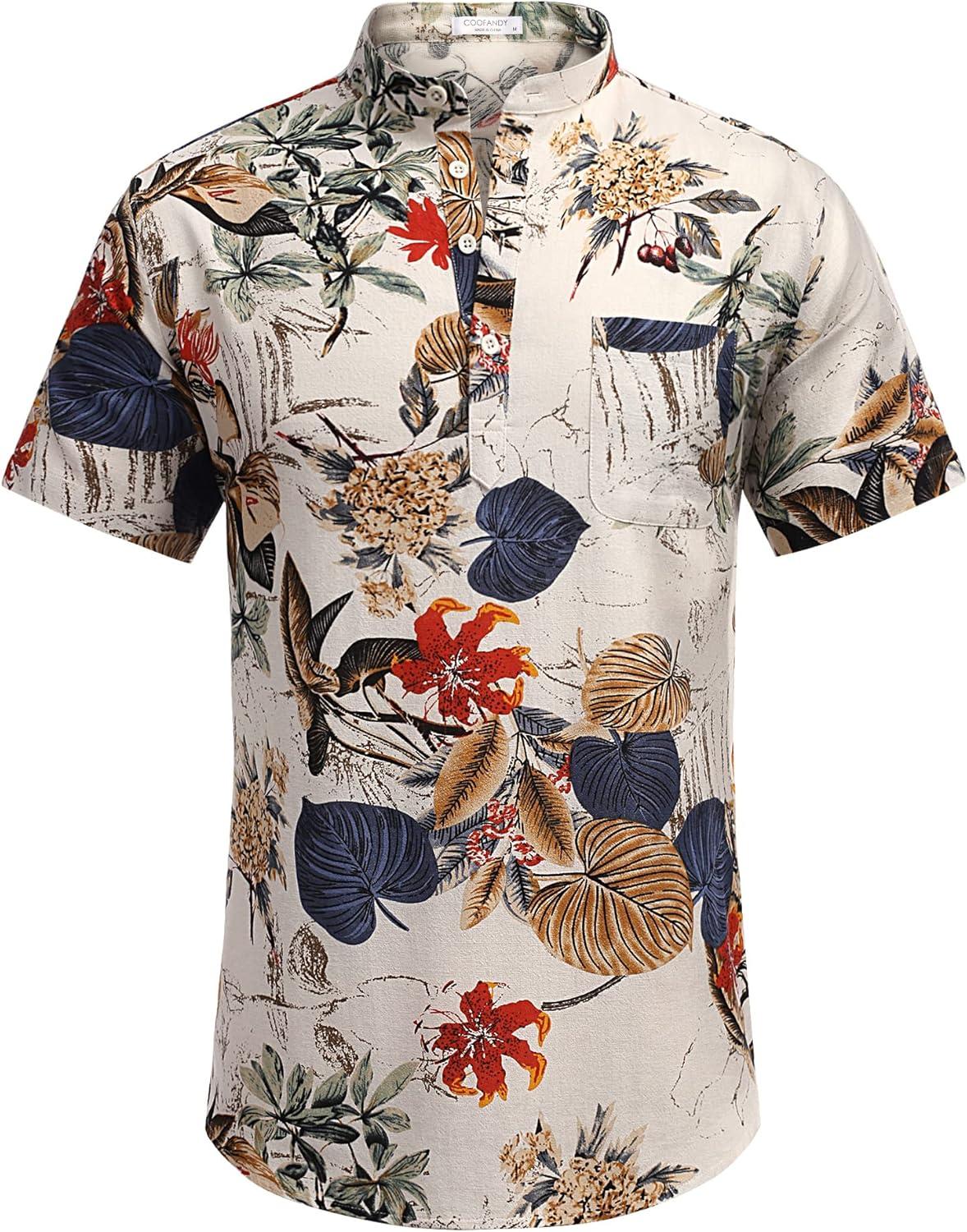COOFANDY Men Casual Henley Tee Shirt Short Sleeve Band Collar Summer Beach Textured T-Shirt(Beige Black Leaves)