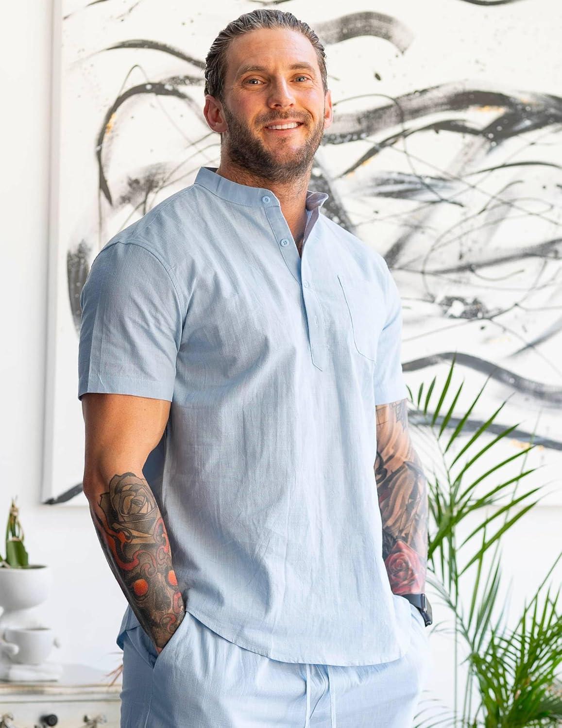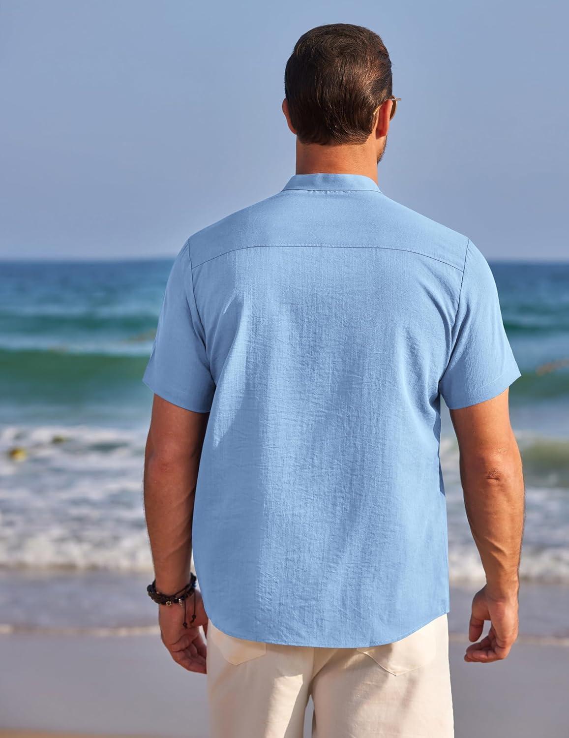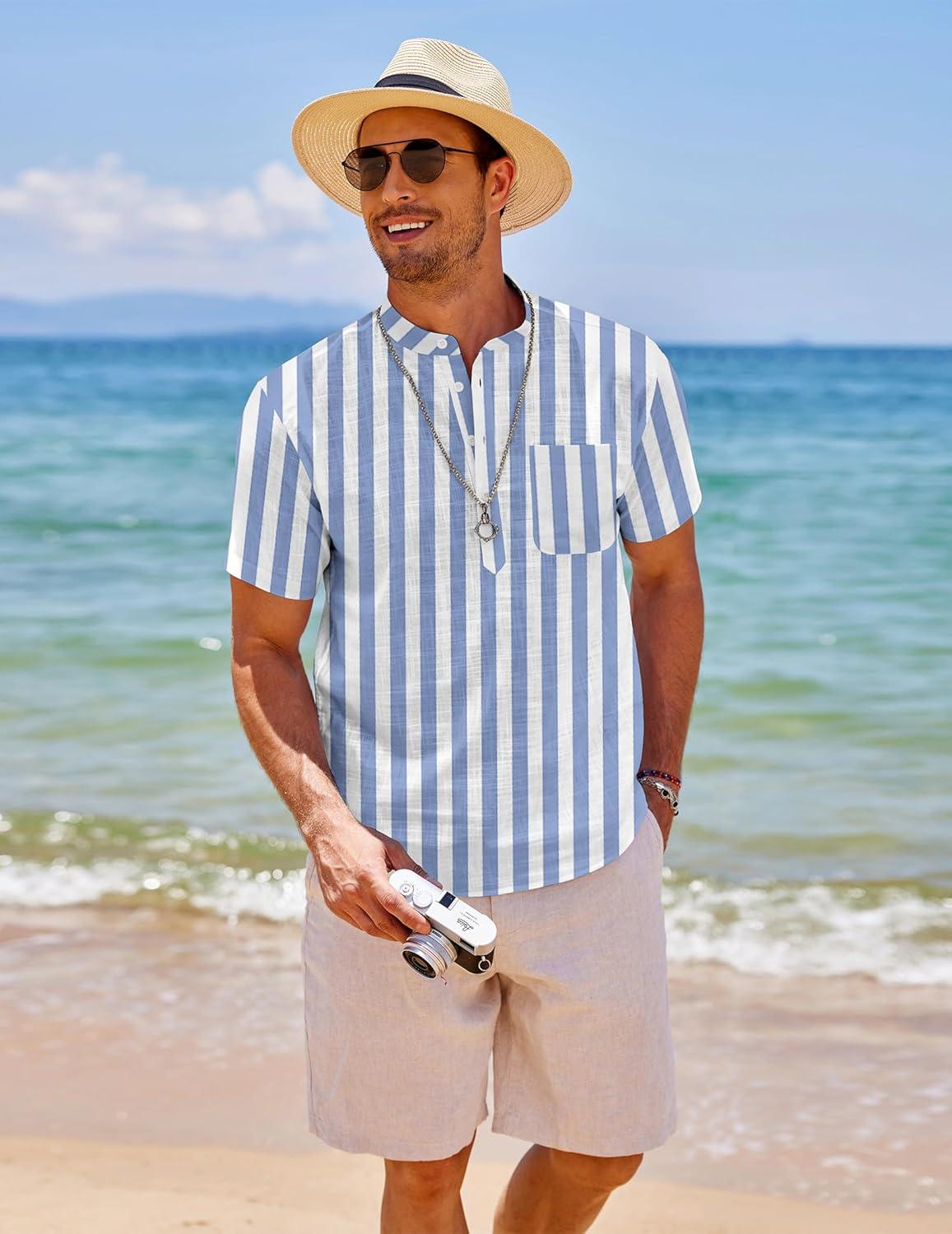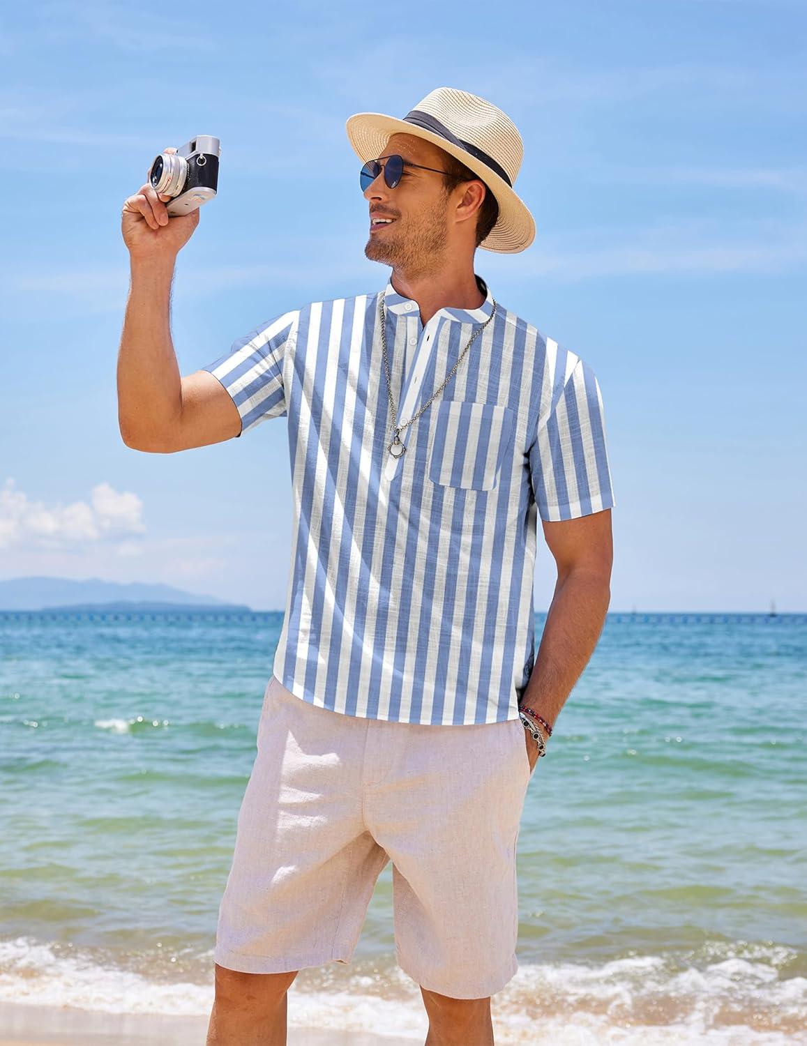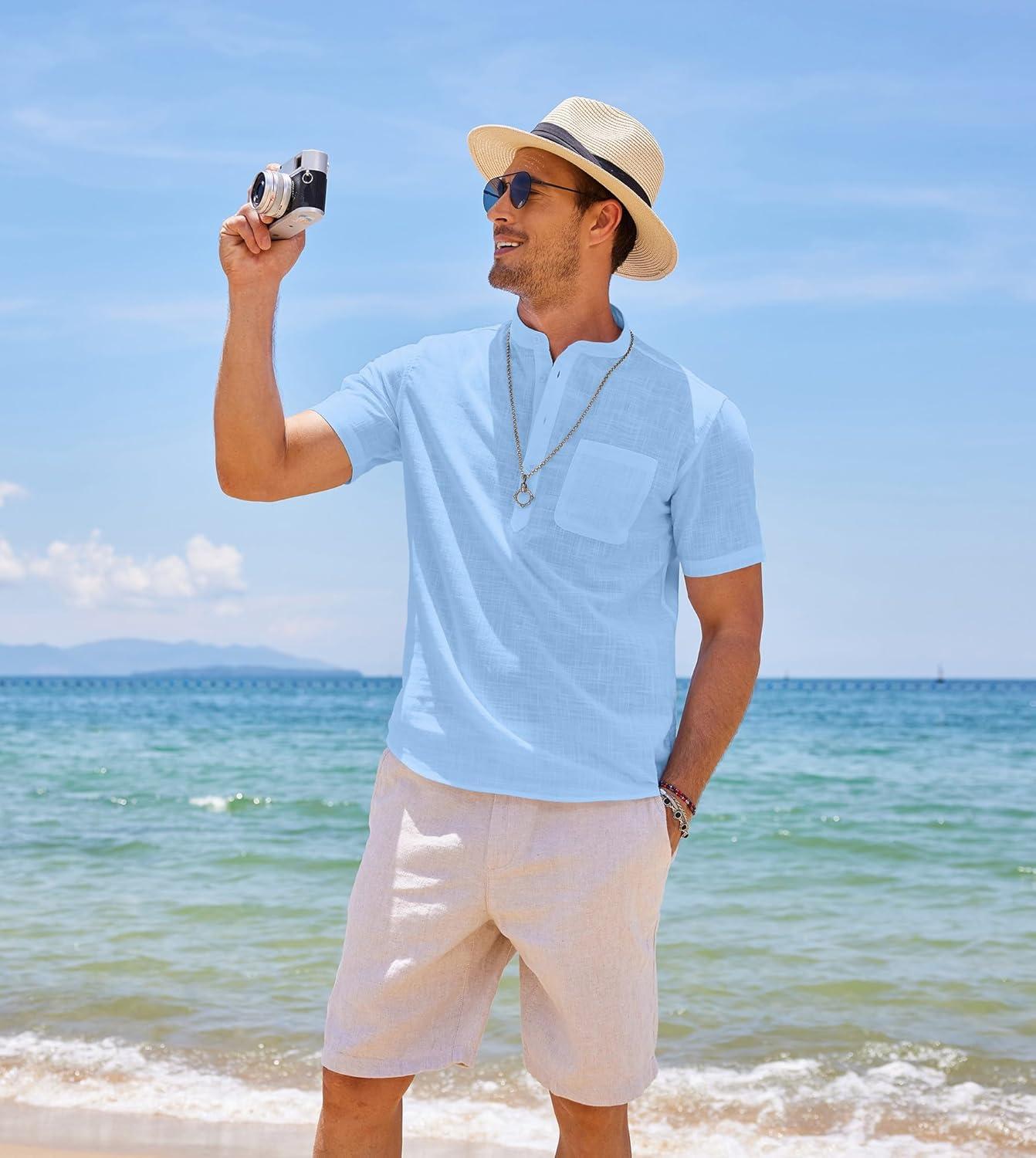 COOFANDY Men’s 2 Piece Cotton Linen Sets Summer Beach Outfits Casual Short Sleeve Henley Shirts and Vacation Shorts(Light Blue)