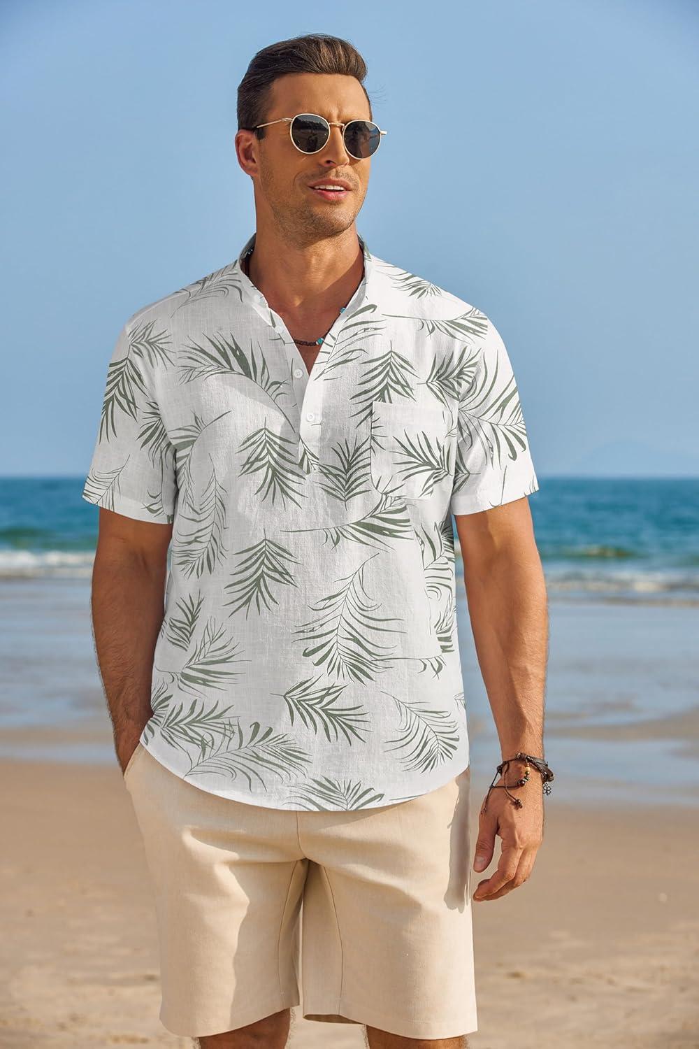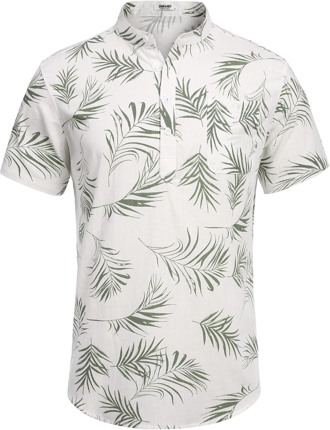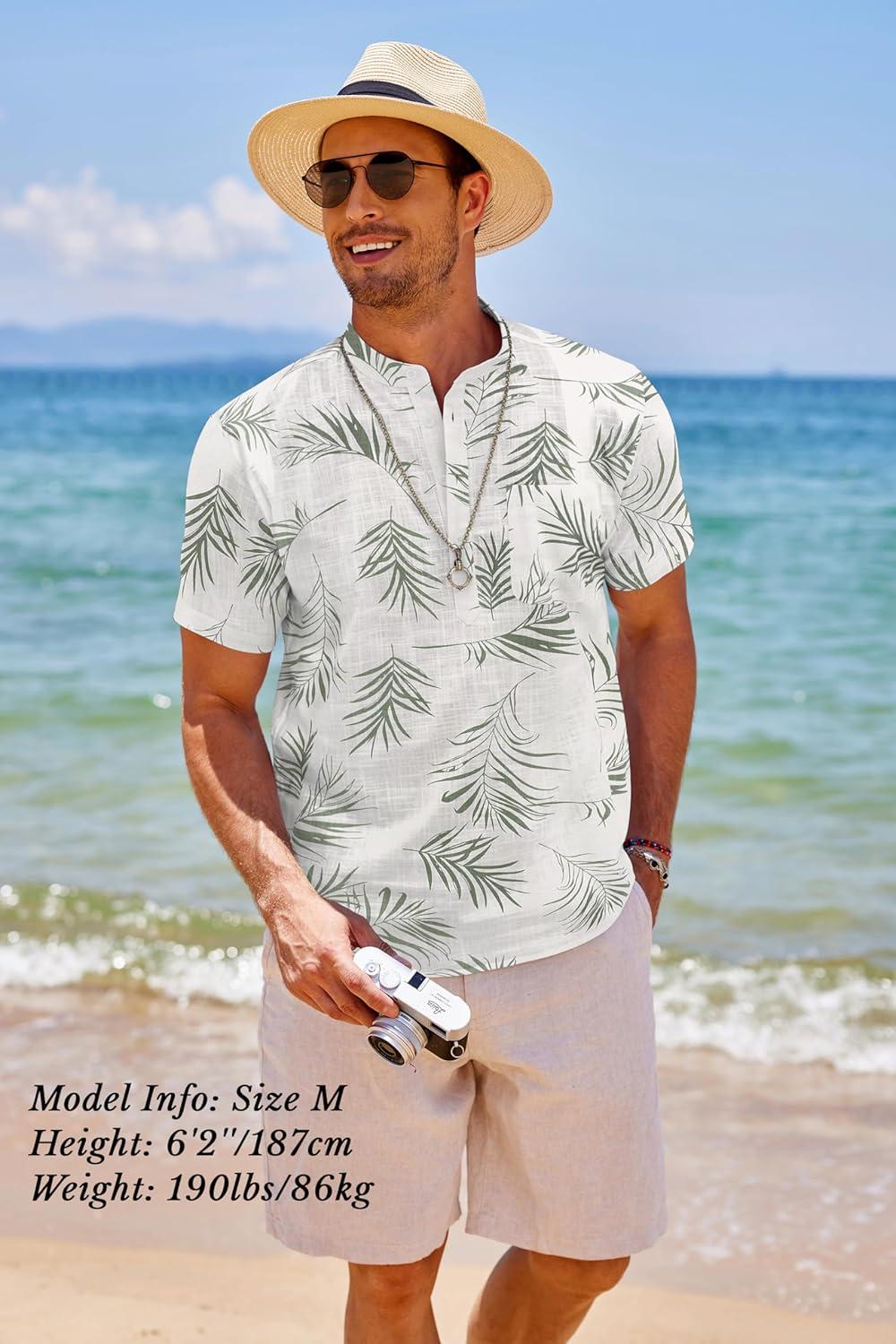 COOFANDY Men Casual Henley Tee Shirt Short Sleeve Band Collar Summer Beach Textured T-Shirt(Dark Green Beige Coconut Leaves)