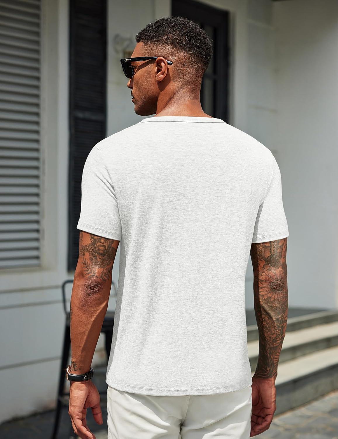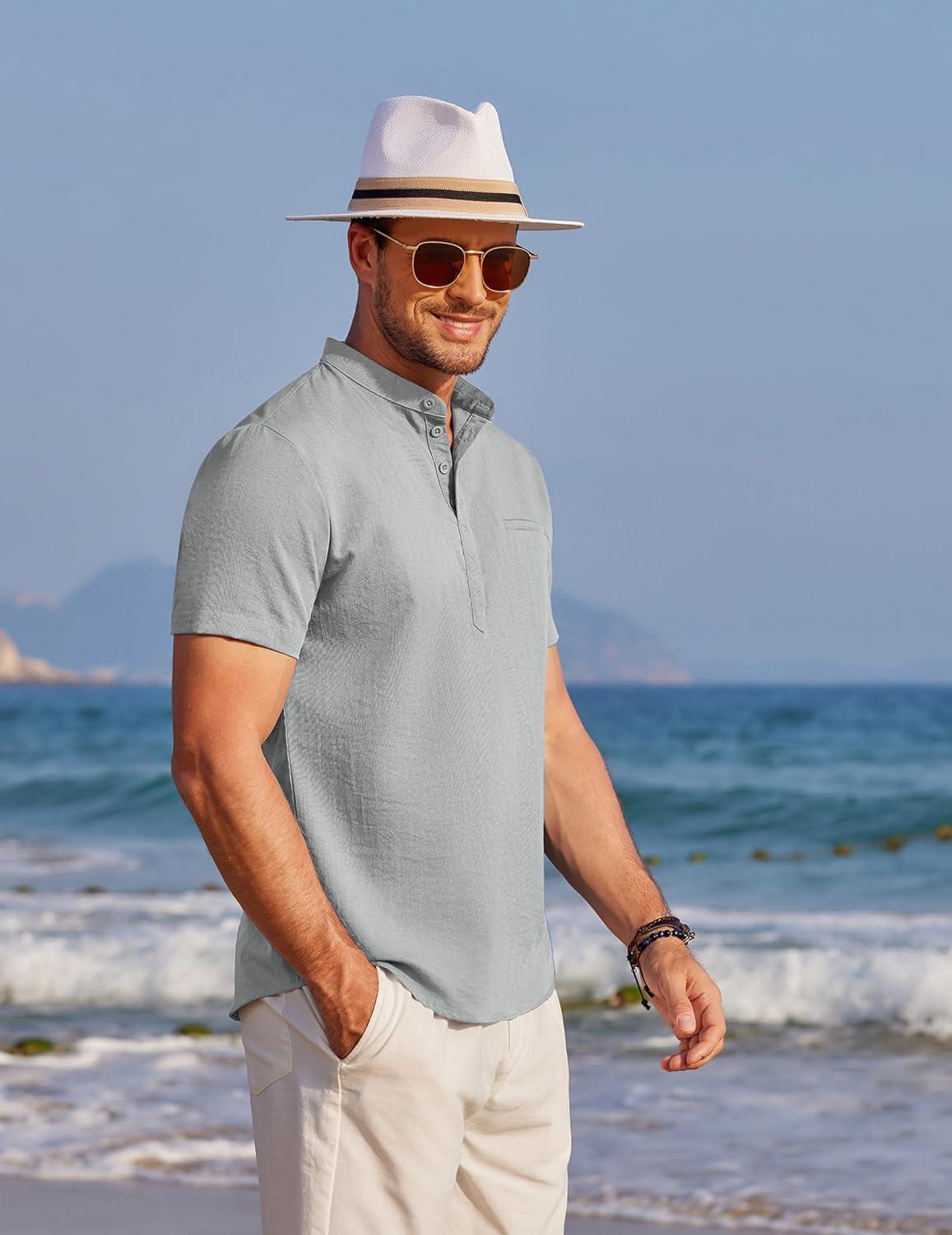 COOFANDY Men Casual Henley Tee Shirt Short Sleeve Band Collar Summer Beach Textured T-Shirt(Light Grey)