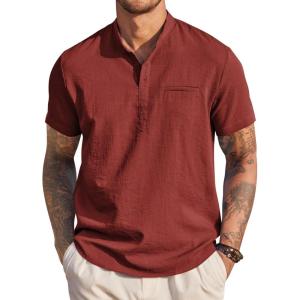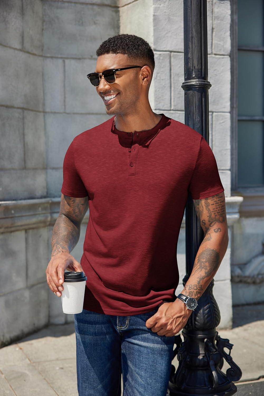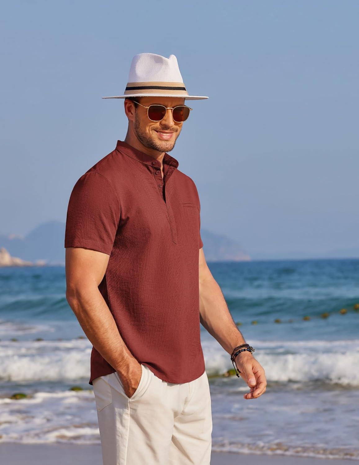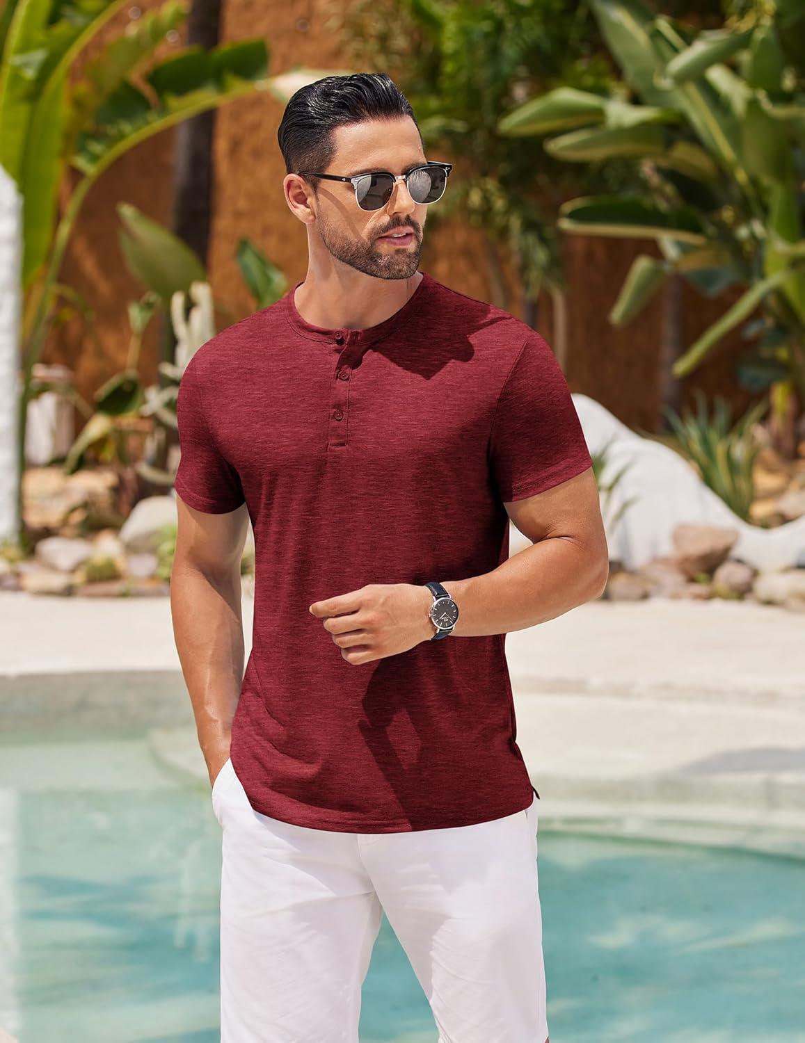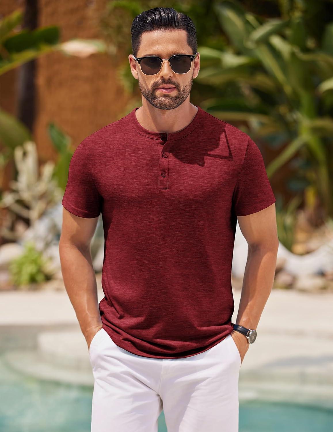 COOFANDY Men Casual Henley Tee Shirt Short Sleeve Band Collar Summer Beach Textured T-Shirt(Red Flag)
