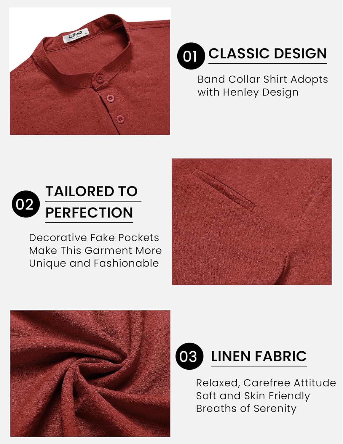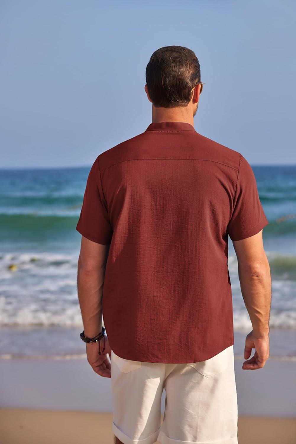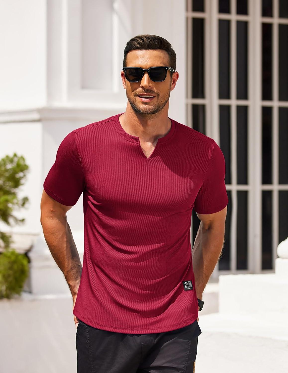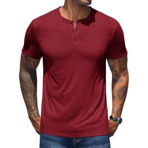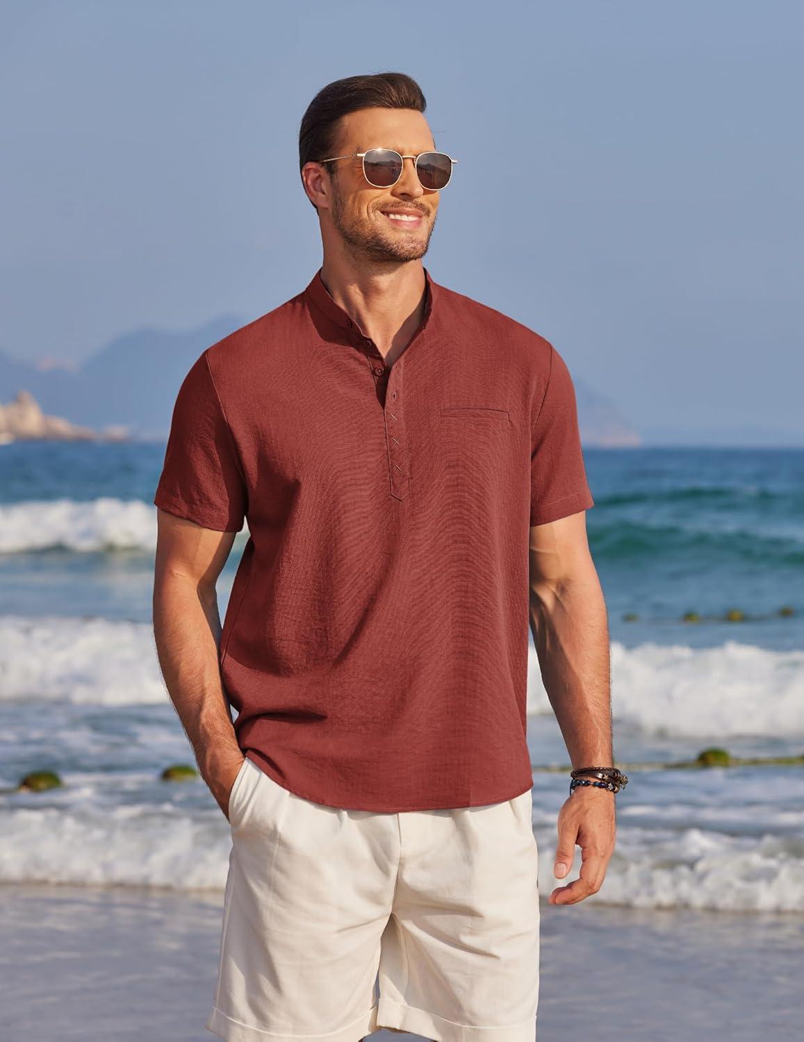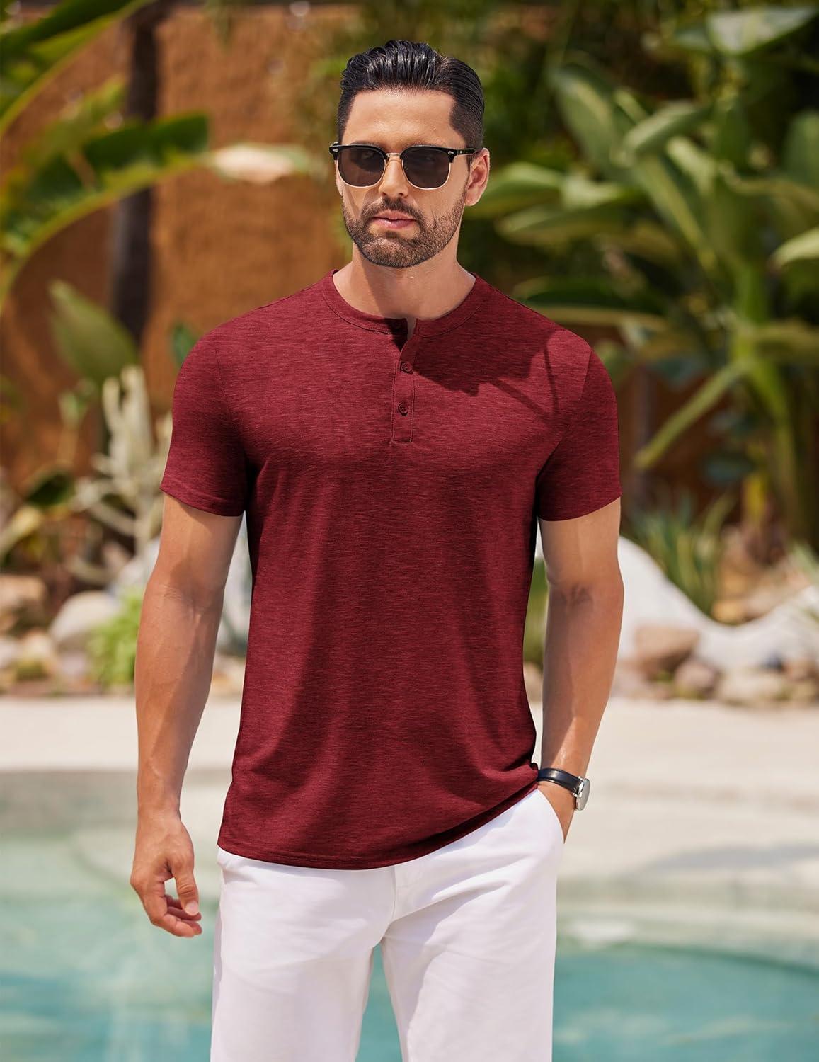 COOFANDY Men Casual Henley Tee Shirt Short Sleeve Band Collar Summer Beach Textured T-Shirt(Red Flag)