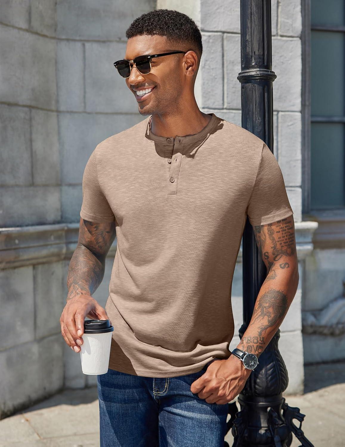 COOFANDY Mens Cotton Henley T-Shirts Short Sleeve Button Casual Basic Tees Work Shirts with Split Side(Sesame)